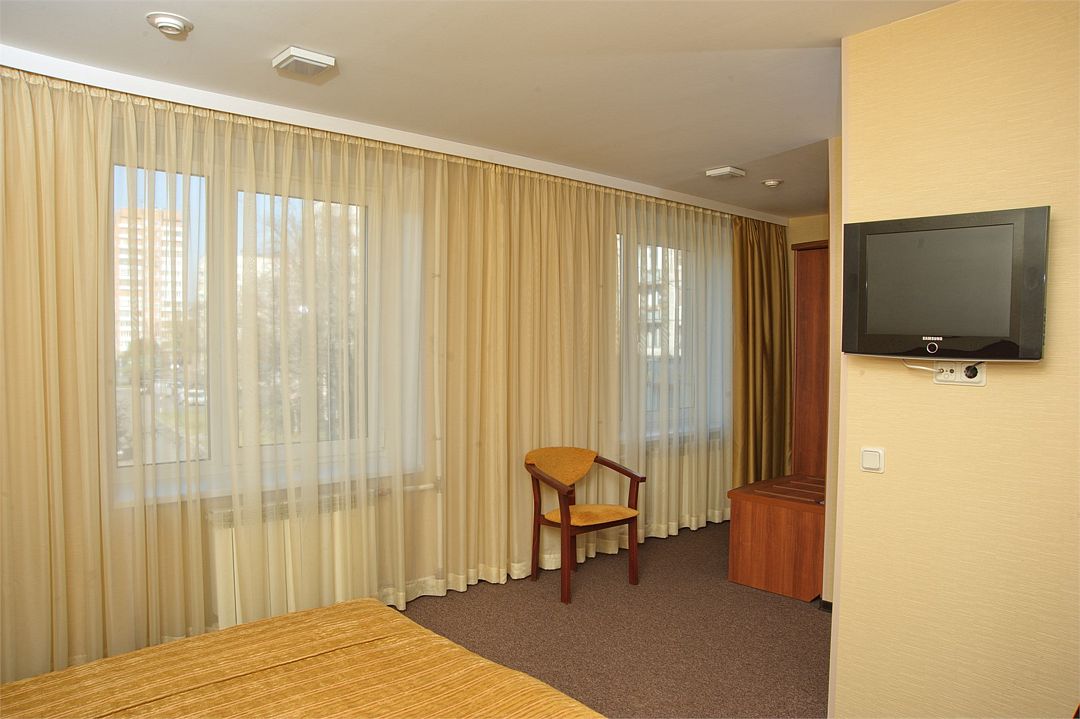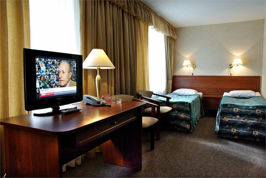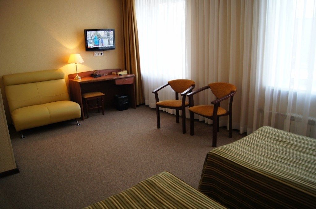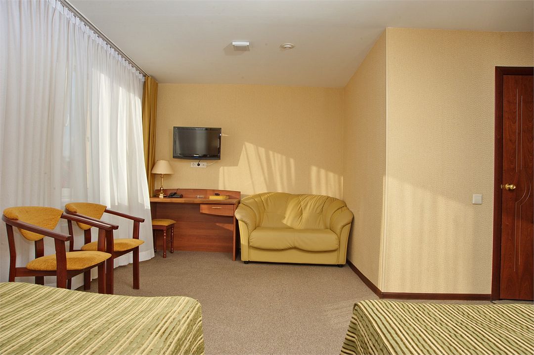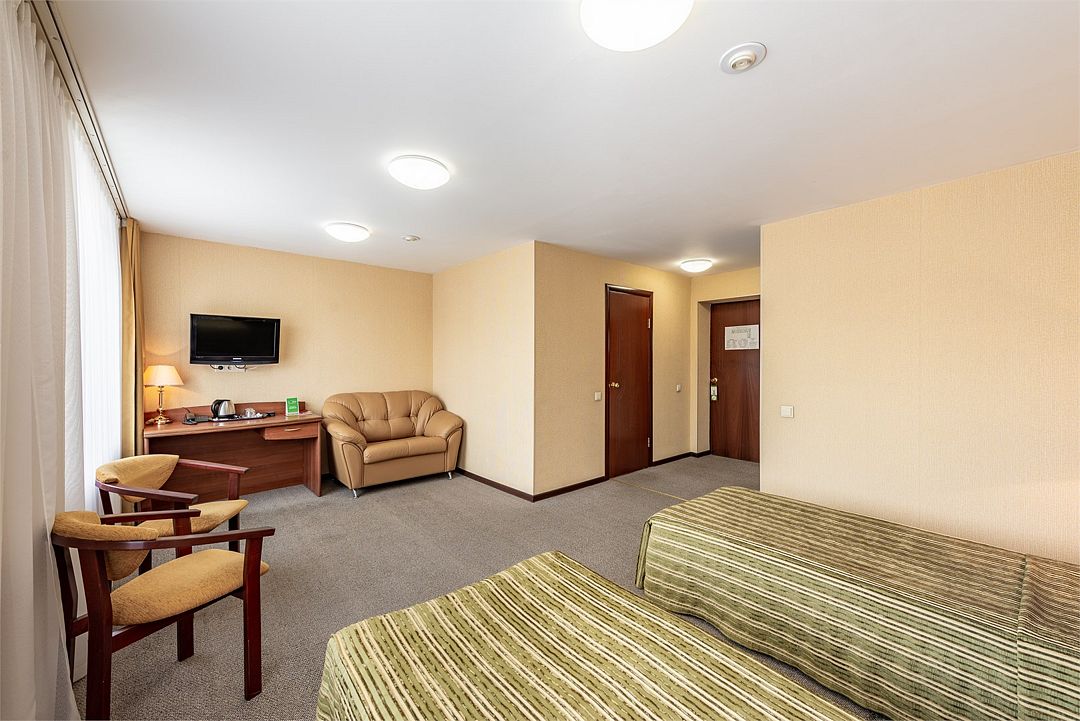телевизор, спутниковое телевидение, кабельное телевидение, Wi-Fi, телефон, светильник, настольные лампы, фен, ванная комната, ванна, ванна или душевая кабина, санузел, банные полотенца, гигиенические средства, две односпальные кровати, гипоаллергенное белье, диван, стулья, шкаф для одежды, вешалки, письменный стол, зеркало, обслуживание номеров, сейф, унитаз, раковина, ковровое покрытие, отопление, вид на город, кулер на этаже, стаканы, туалет, мини-холодильник, номер для некурящих, услуги прачечной (платно), мылоВ гостиничном номере