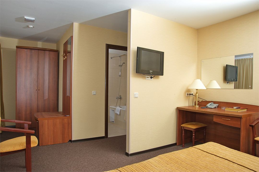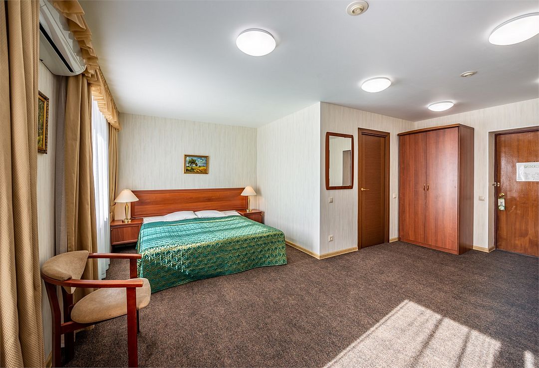 телевизор, спутниковое телевидение, кабельное телевидение, Wi-Fi, телефон, светильник, настольные лампы, фен, ванная комната, ванна, санузел, банные полотенца, гигиенические средства, двуспальная кровать, гипоаллергенное белье, стулья, шкаф для одежды, вешалки, письменный стол, багажная тумба, зеркало, обслуживание номеров, сейф, унитаз, раковина, косметическое зеркало, ковровое покрытие, отопление, кулер на этаже, вид во двор, стаканы, туалет, мини-холодильник, номер для некурящих, услуги прачечной (платно), вешалки-плечики, мылоВ гостиничном номере