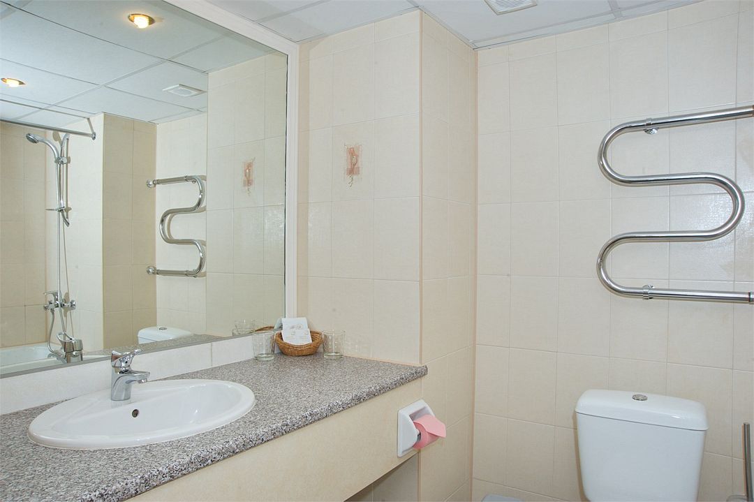 В номере центральная система отопления, противопожарные датчики. 2 комнаты: 1 комната – двуспальная кровать, письменный стол, телевизор, шкаф/гардероб, сейф, ковровое покрытие, диван, кондиционер. 2 комната – две односпальные кровати, письменный стол, телевизор с плоским экраном, шкаф/гардероб, сейф, холодильник, ковровое покрытие. 2 ванных комнаты: 1 - ванна, душ, раковина, биде, туалет, фен, туалетные принадлежности, халаты, тапочки. 2 - душевая кабина, туалет, раковина, туалетные принадлежности, фен. Возможно размещение на доп.кровати.Услуги и удобства