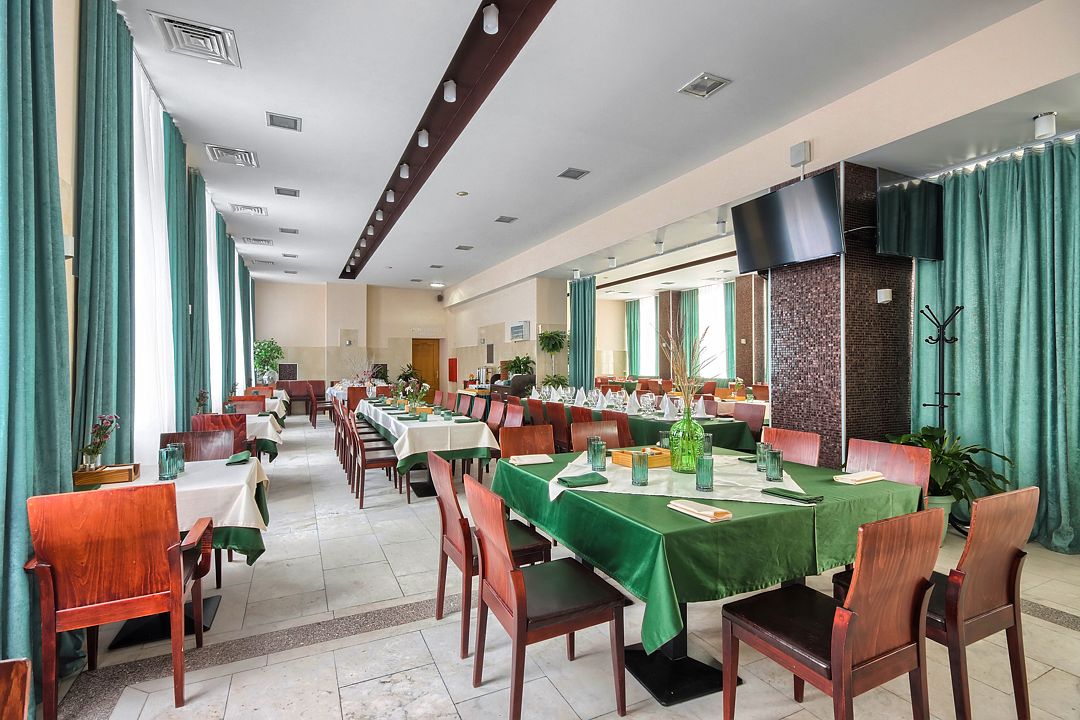 Просторный зал на сто человек, где царит уютная атмосфера, идеально подходит для деловых переговоров, романтических вечеров или праздничных ужинов. А благодаря гибкости пространства в «Изумруде» легко организуют банкеты, фуршеты, корпоративные обеды и кофе-брейки — на любой случай и масштаб.