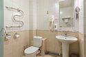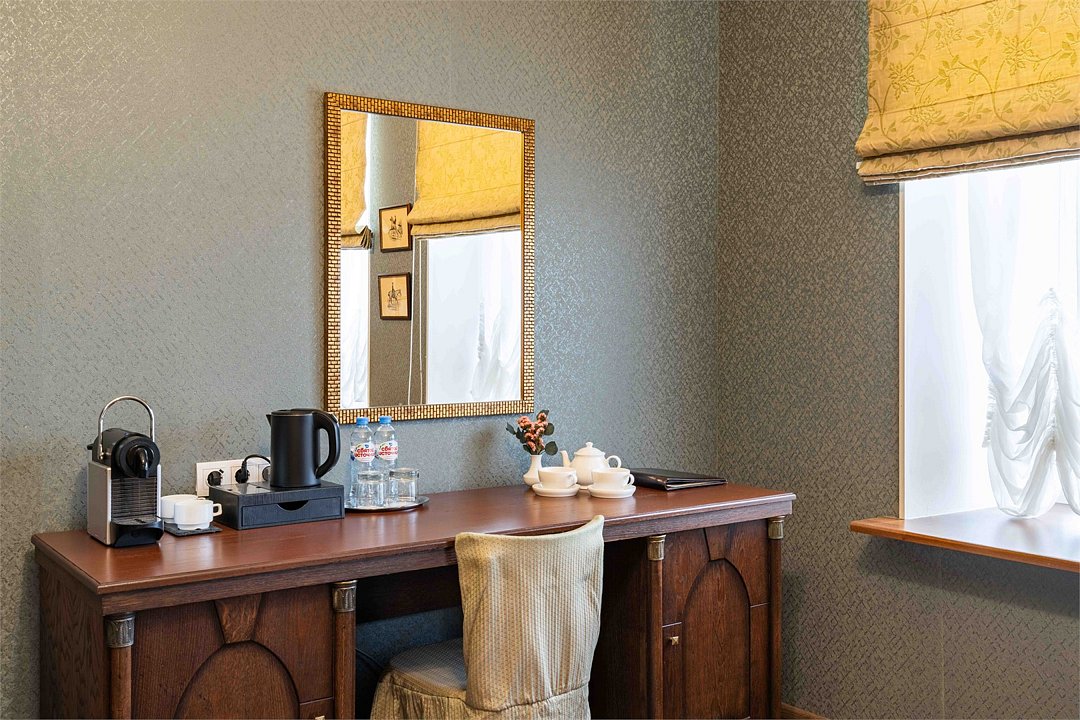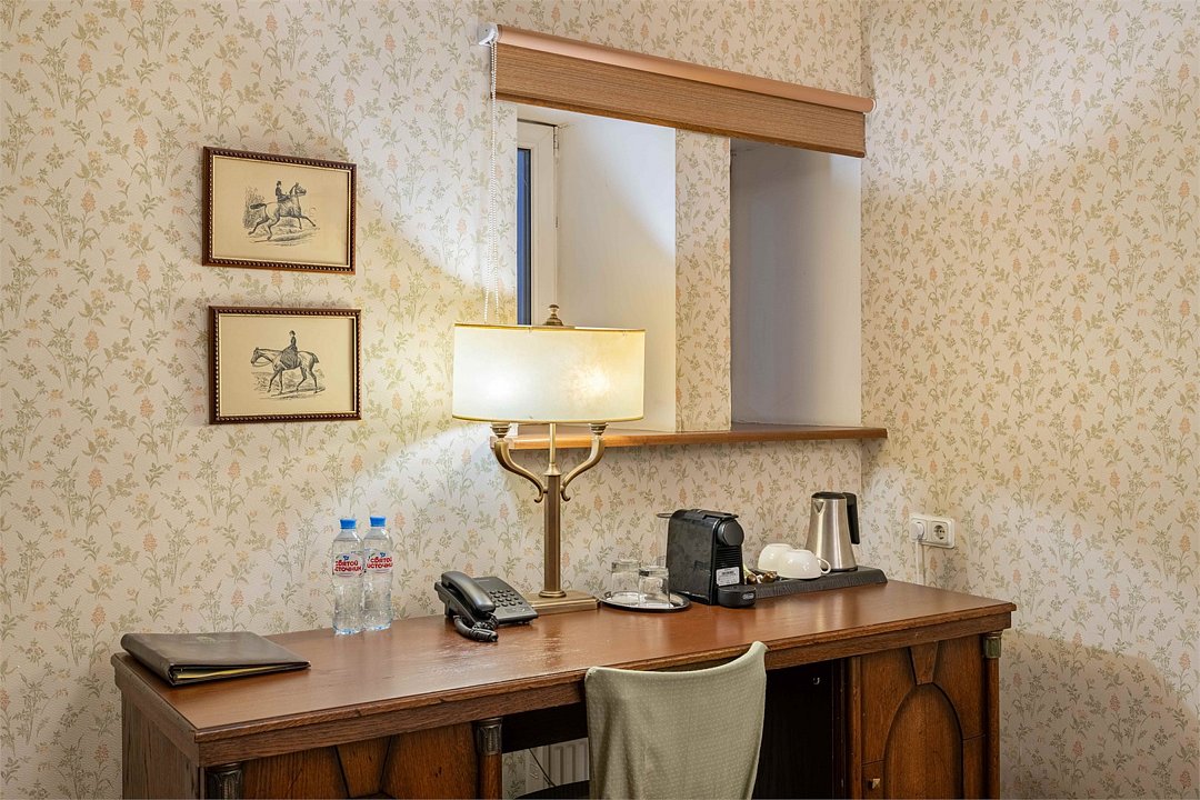 Однокомнатный номер повышенной комфортностью оснащен двуспальной кроватью. Площадь номера: 20-25 кв.м. В номере есть рабочая зона. Оснащение номера включает: удобные кровати, тумбочки, столы, стулья, шкафы для одежды, функциональное освещение, телевизоры с жидкокристаллическим экраном, сейфы, беспроводной доступ в Интернет, банные принадлежности, халаты, тапочки, фен, телефон,чайная станция,кофемашина.Услуги и удобства