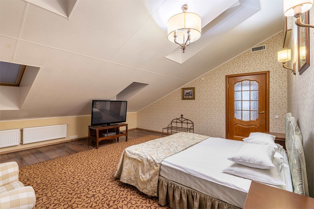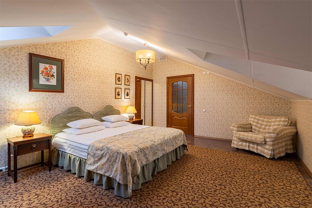 телевизор, Wi-Fi, телефон, светильник, настольные лампы, фен, вентилятор, будильник, электронные замки, утюг, обогреватель, ванная комната, ванна, биде, банные принадлежности, халаты, банные полотенца, тапочки, гигиенические средства, косметические средства, кровать «Queen size», гипоаллергенное белье, гладильная доска, ортопедический матрас, тумбы, шкаф для одежды, вешалки, письменный стол, багажная тумба, зеркало, ковер, письменные принадлежности, чайный набор, обслуживание номеров, сейф, унитаз, раковина, косметическое зеркало, питьевая вода, отопление, кресло, ламинат, стаканы, стул, туалетные средства, туалет, мини-холодильник, москитная сетка, гостиничная парфюмерия, мансардные окна, номер для некурящих, чайная станция, без питомцевВ номере