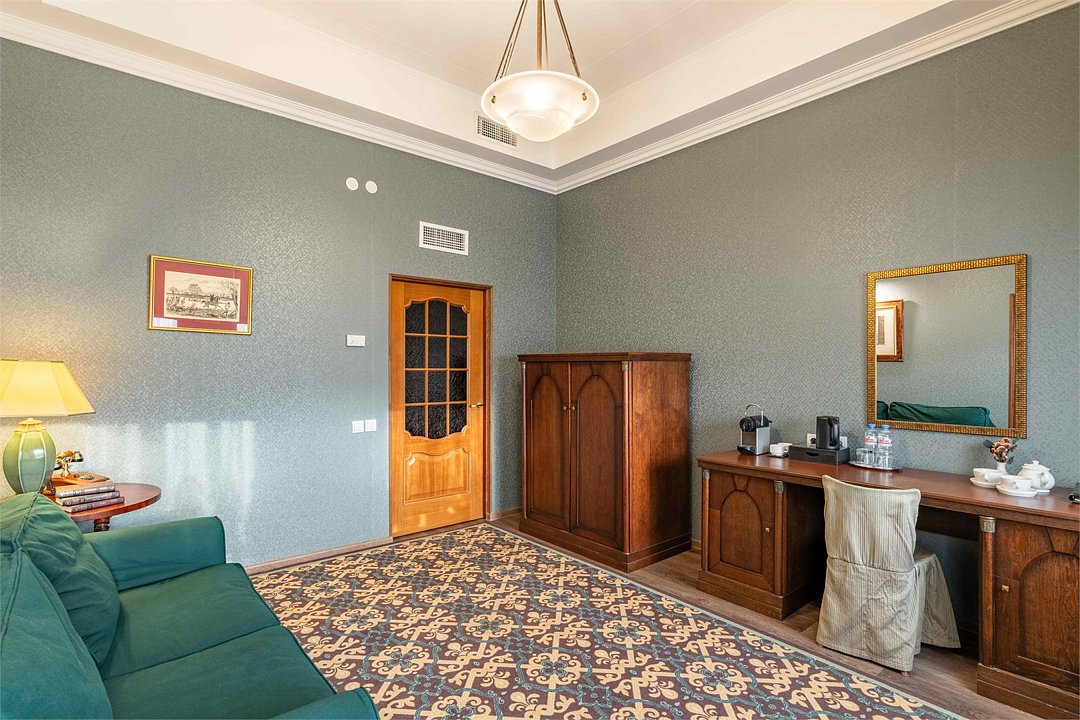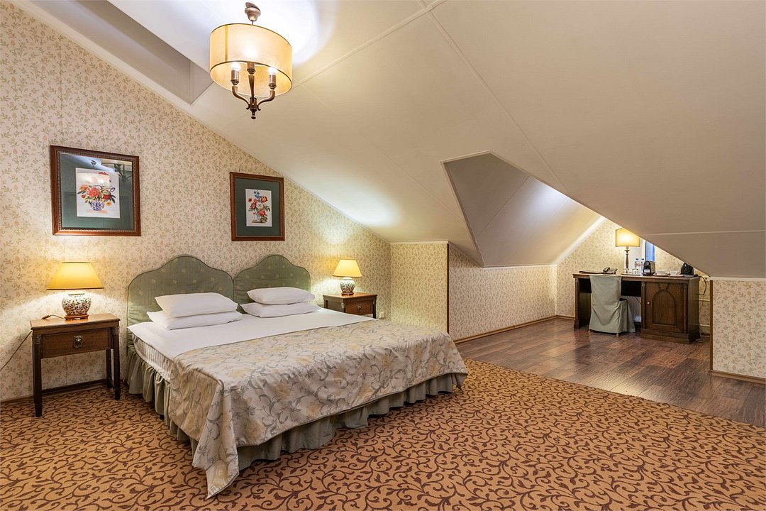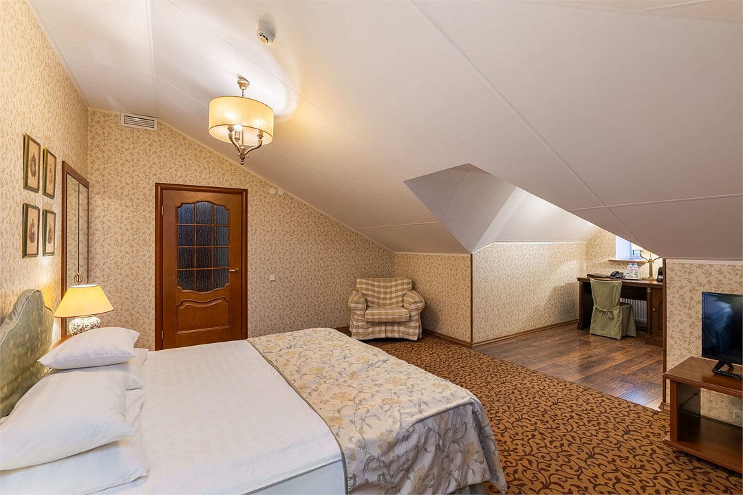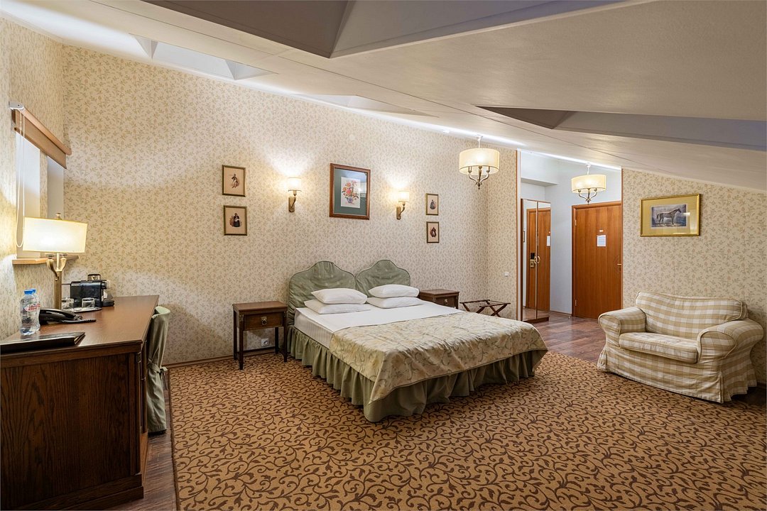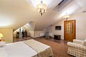 Просторный номер категории Люкс общей площадью 36-42 кв.м. Номер состоит из двух жилых комнат: - гостиная с раскладывающимся диваном; - спальня с двуспальной кроватью. В каждом номере категории Люкс присутствует оборудованная рабочая зона. Оснащение номера включает: удобную кровать, тумбочки, столы, стулья, шкафы для одежды, функциональное освещение, телевизоры с жидкокристаллическим экраном, сейфы, беспроводной доступ в Интернет, банные принадлежности, халаты, тапочки, фен, телефон,чайная станция,кофемашина.Услуги и удобства