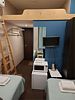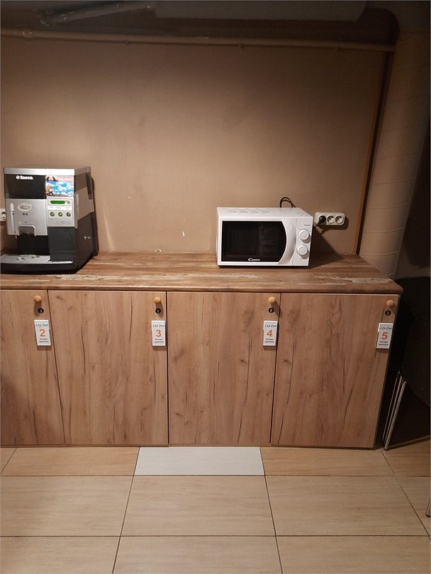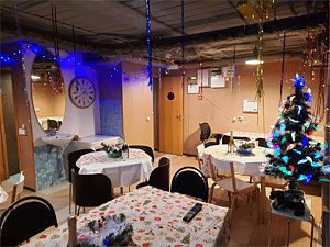 В столовой есть своя кухонька и санузел. В столовой также установлен телевизор, имеется достаточное количество розеток, чтобы можно было зарядить телефон или подключить ноутбук.