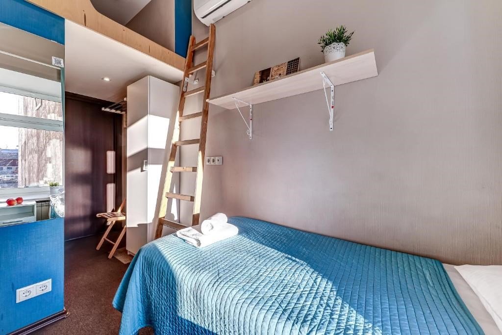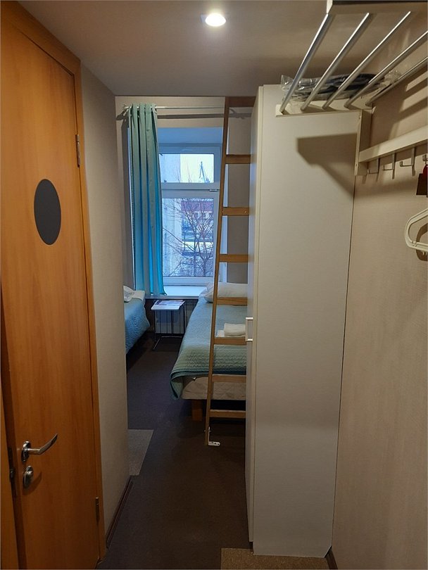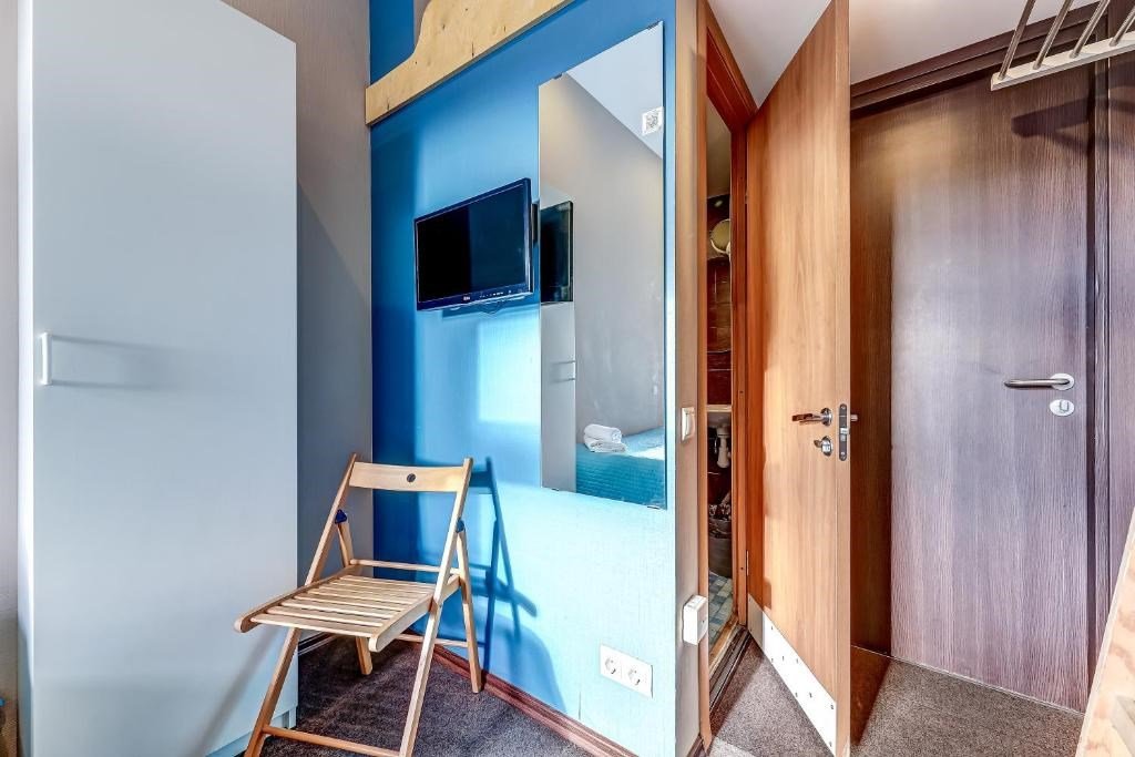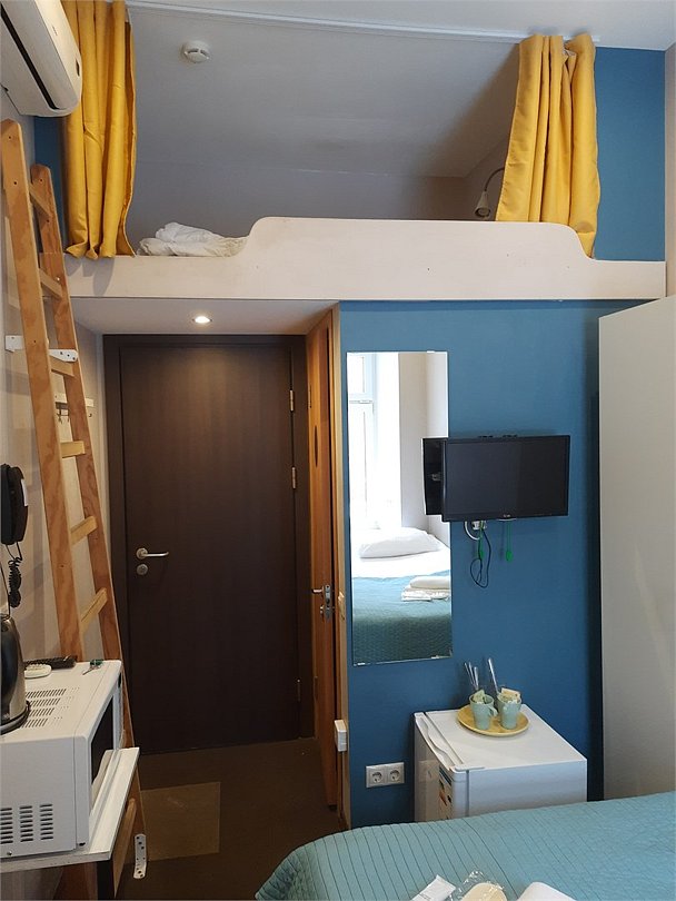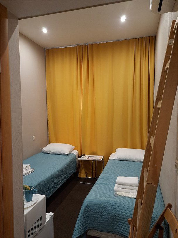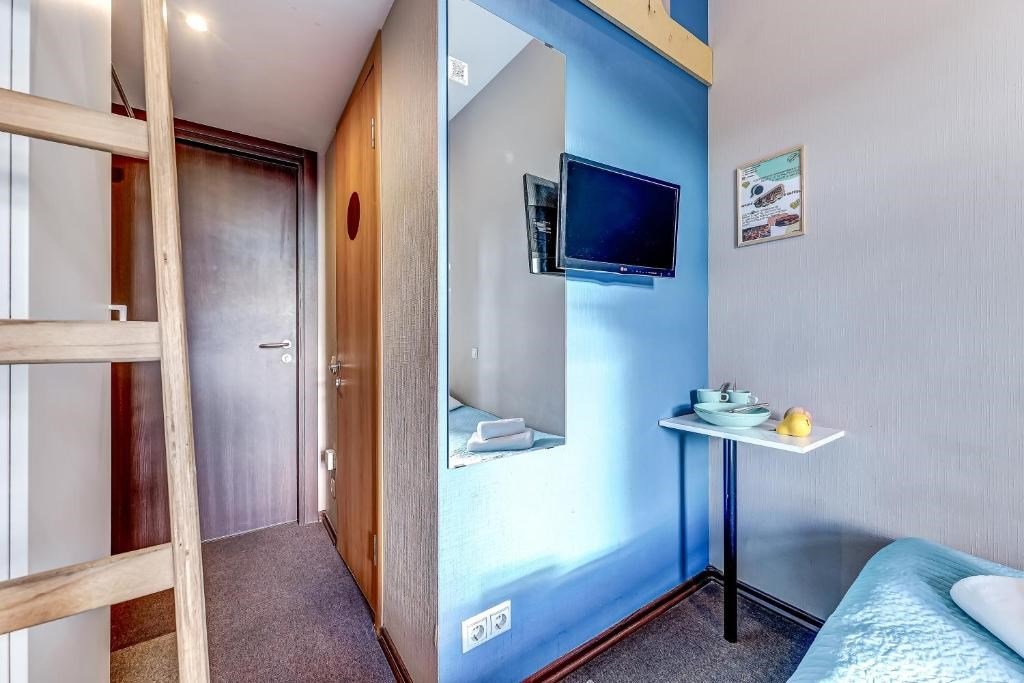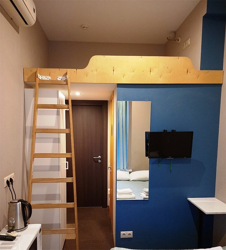 Мебель: Кровать 200*80, Столик, стул, зеркало, светонепроницаемые шторы (Блэкаут), доп. место — верхний ярус.
