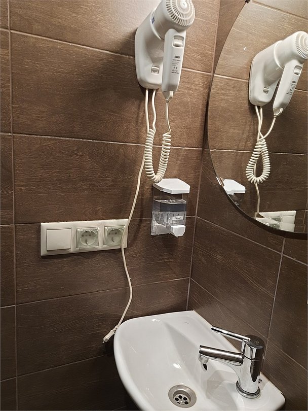 Санузел собственный (в номере): Душ, унитаз, раковина, зеркало, электрический фен, теплый пол. диспенсеры с жидким мылом, шампунем и гелем для душа.