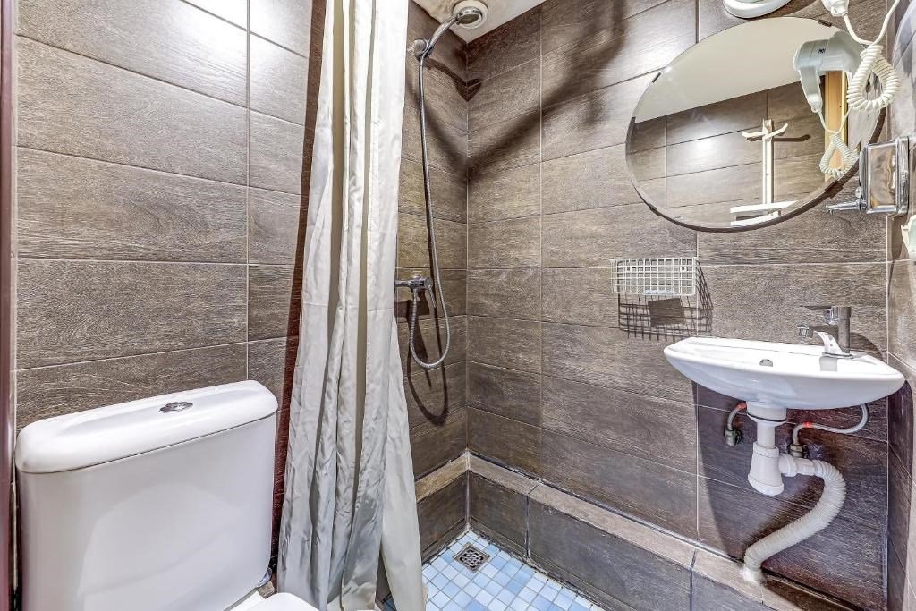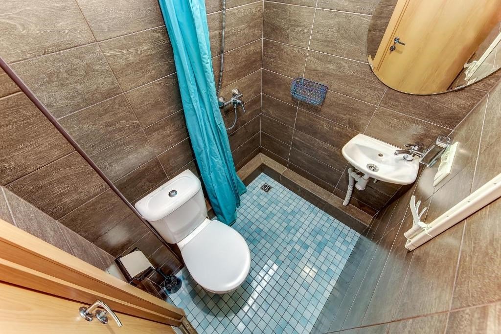 Санузел собственный (в номере): Душ, унитаз, раковина, зеркало , электрический фен, теплый пол, диспенсеры с жидким мылом, шампунем и гелем для душа.