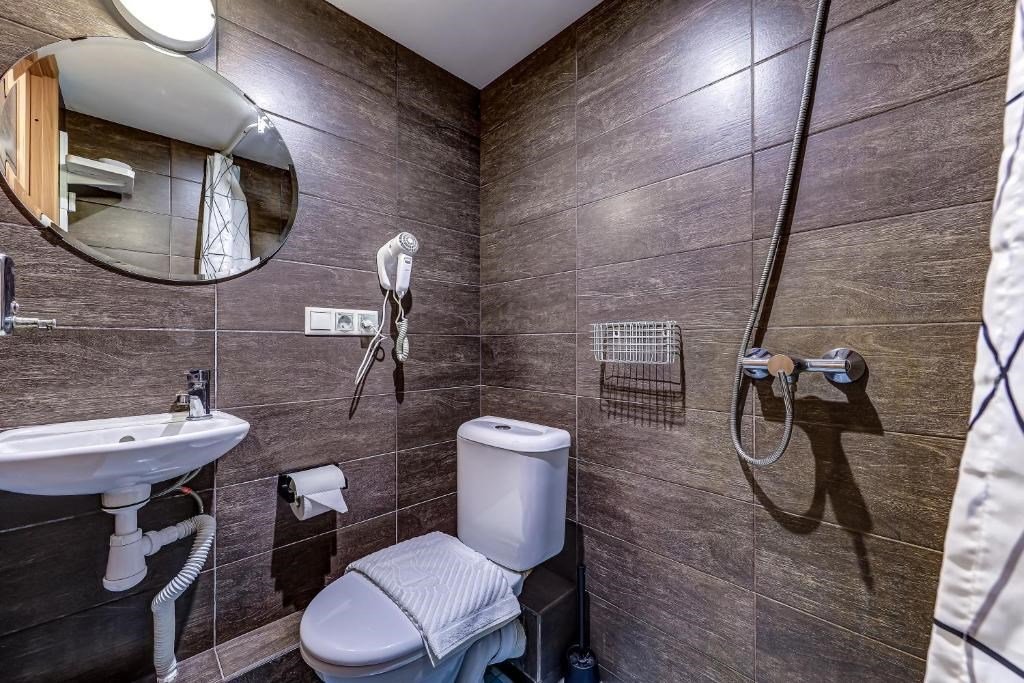 Санузел собственный (в номере): Душ, унитаз, раковина, зеркало, электрический фен, теплый пол, диспенсеры с жидким мылом, шампунем и гелем для душа.