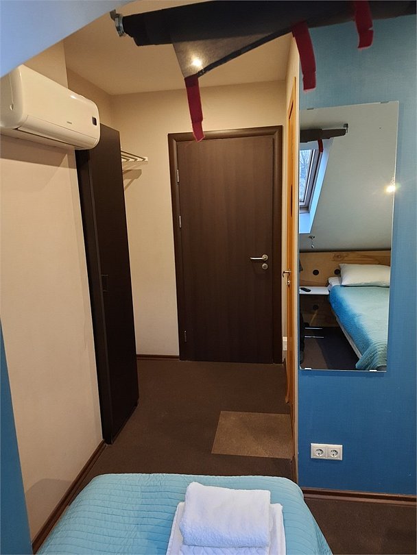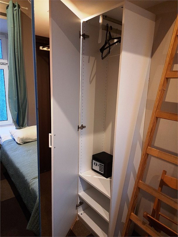 Мебель: Кровать двуспальная 200*160 или две кровати 200*80, шкаф, дополнительное место на верхнем ярусе, столик, стул, зеркало, светонепроницаемые шторы (Блэкаут).