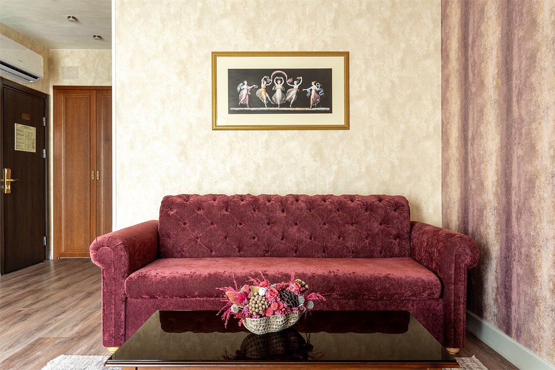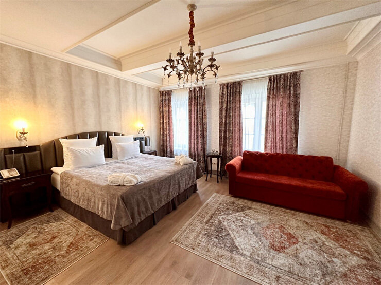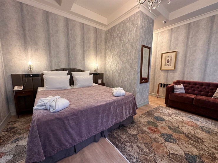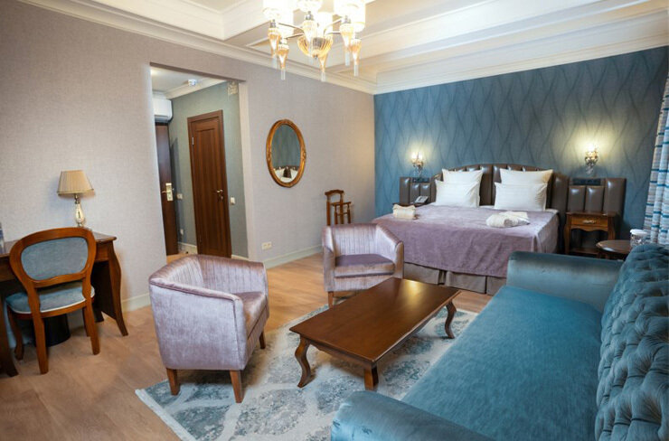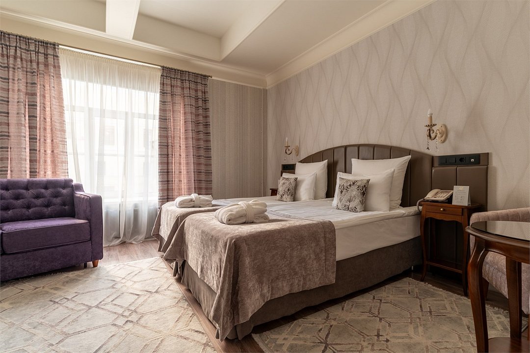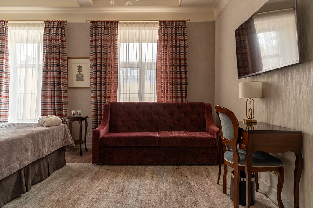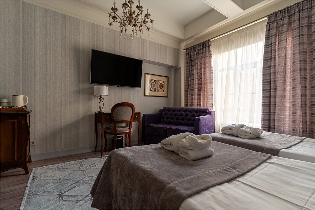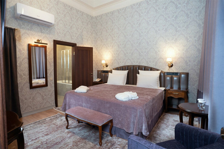 Комфортный и просторный номер, рассчитанный на размещение до 4 гостей, идеально подойдет как для семейных путешествий, так и для тех, кто ценит атмосферу уединения. Интерьер оформлен в спокойных оттенках серого или бежевого, дополненных изысканными акцентами бордового, пыльно-розового, синего, фиолетового или горчичного цветов. Тщательно подобранный текстиль создает атмосферу тепла и элегантности, делая отдых незабываемым. Вид на внутренний двор обеспечит тишину и спокойствие, помогая вам расслабиться и насладиться каждой минутой пребывания. Оснащение номера: • Кровать king size • Письменный стол для работы и отдыха • Шкаф с плечиками и сейфом для ваших вещей • Раскладной диван • Smart TV для просмотра любимых фильмов и передач • Чайно-кофейная станция с капсульным кофе, чаем и сахаром • Расширенный косметический набор, мягкие халаты и комплект полотенец Уборка – ежедневно, смена белья – раз в 2 дня. Чайно-кофейный набор пополняется ежедневно. При заезде - комплимент: безалкогольный мини-бар. По запросу предоставляются меню подушек и гладильные принадлежности (утюг, доска). Особенности: • Номера данного типа расположены в литерах А и В здания. • Кровать king size - трансформер, при совершении бронирования, пожалуйста, укажите тип кровати - одна двуспальная или две односпальные. • Диван может быть использован в качестве дополнительного спального места. • Один из номеров со скошенным потолком с мансардным окном.Услуги и удобства