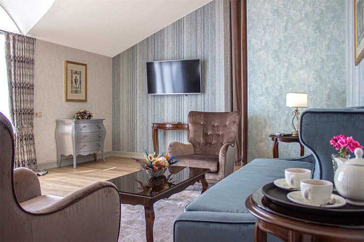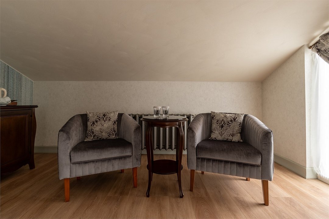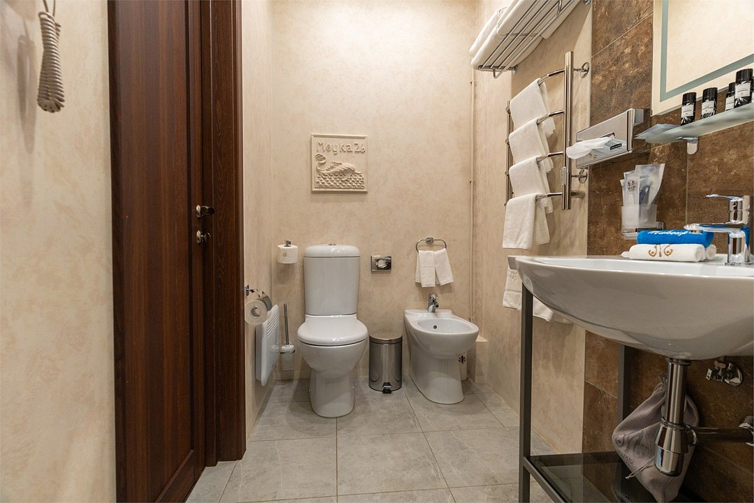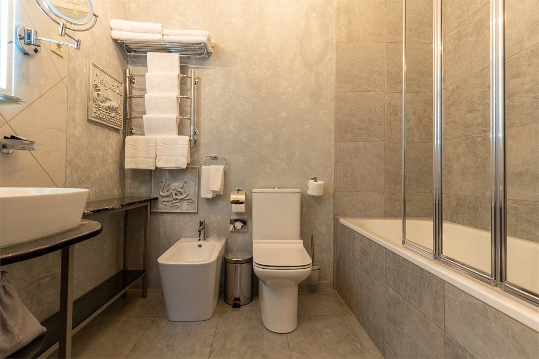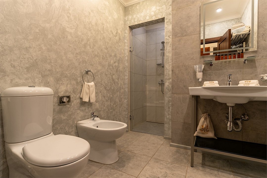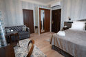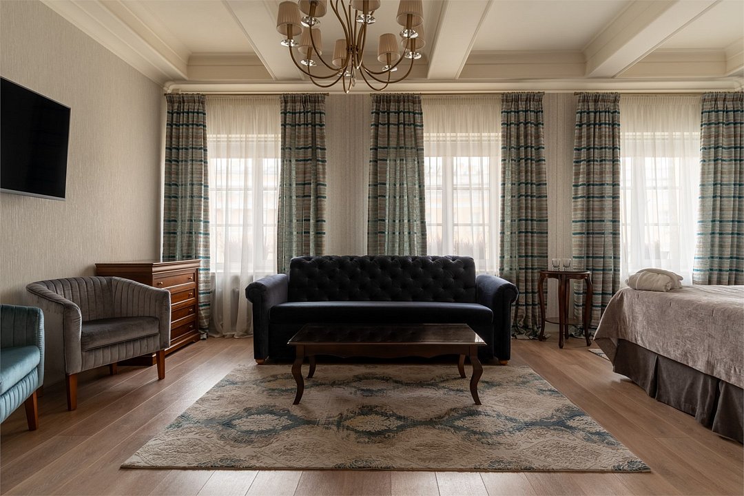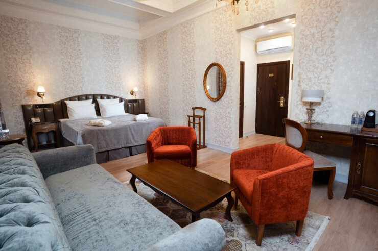 Комфортный и просторный номер, рассчитанный на размещение до 4 гостей, идеально подойдет как для семейных путешествий, так и для тех, кто ценит атмосферу уединения. Интерьер оформлен в спокойных оттенках серого или бежевого, дополненных изысканными акцентами бордового, пыльно-розового, синего, фиолетового или горчичного цветов. Тщательно подобранный текстиль создает атмосферу тепла и элегантности, делая отдых незабываемым. Вид на внутренний двор обеспечит тишину и спокойствие, помогая вам расслабиться и насладиться каждой минутой пребывания. Оснащение номера: • Кровать king size • Письменный стол для работы и отдыха • Шкаф с плечиками и сейфом для ваших вещей • Раскладной диван • Smart TV для просмотра любимых фильмов и передач • Чайно-кофейная станция с капсульным кофе, чаем и сахаром • Расширенный косметический набор, мягкие халаты и комплект полотенец Уборка – ежедневно, смена белья – раз в 2 дня. Чайно-кофейный набор пополняется ежедневно. При заезде - комплимент: безалкогольный мини-бар. По запросу предоставляются меню подушек и гладильные принадлежности (утюг, доска). Особенности: • Номера данного типа расположены в литерах А и В здания. • Кровать king size - трансформер, при совершении бронирования, пожалуйста, укажите тип кровати - одна двуспальная или две односпальные. • Диван может быть использован в качестве дополнительного спального места. • Один из номеров со скошенным потолком с мансардным окном.Услуги и удобства
