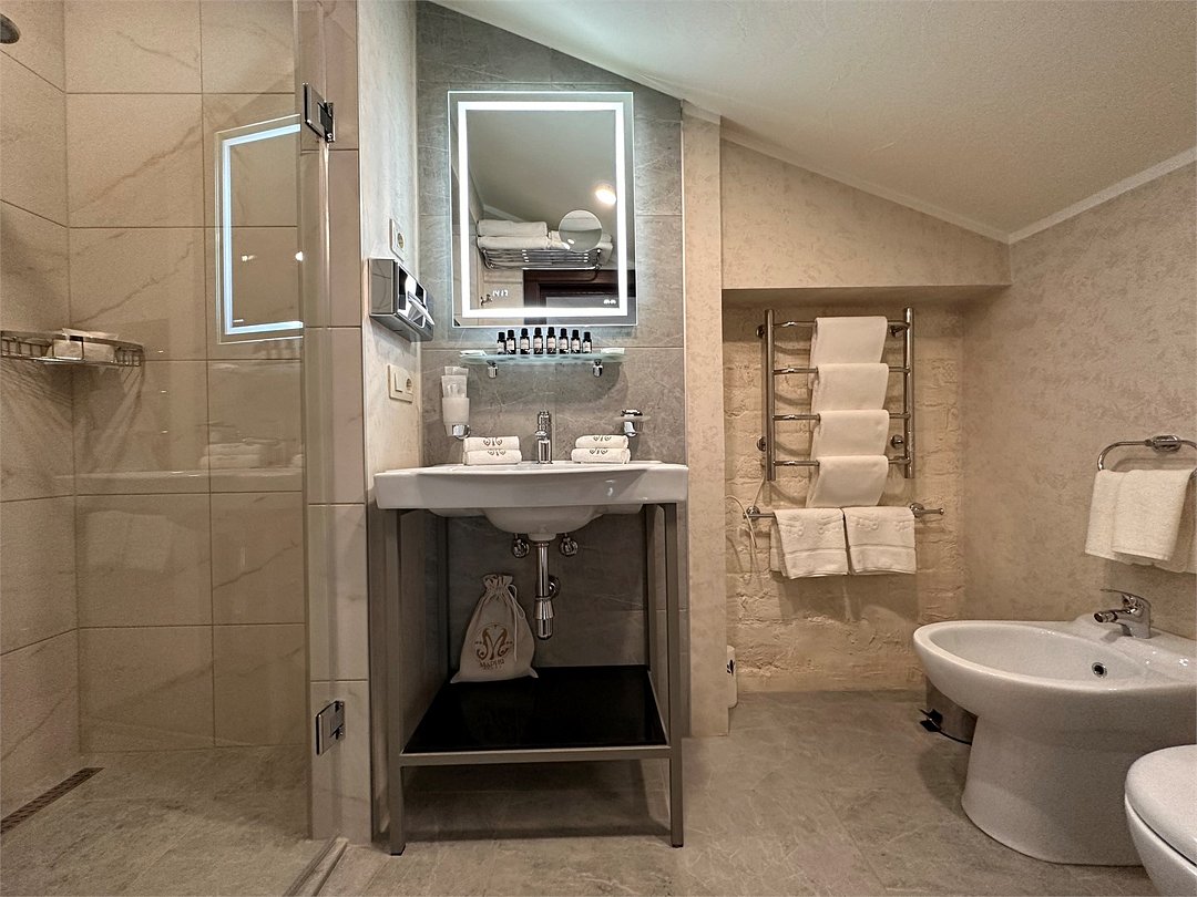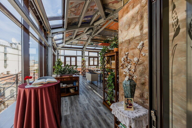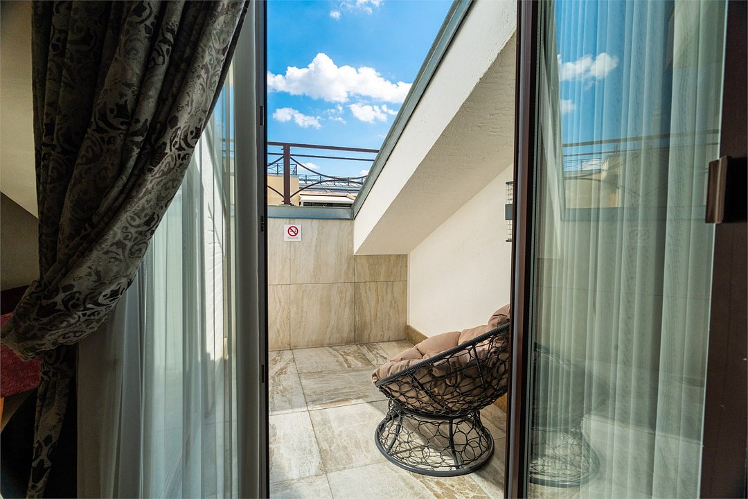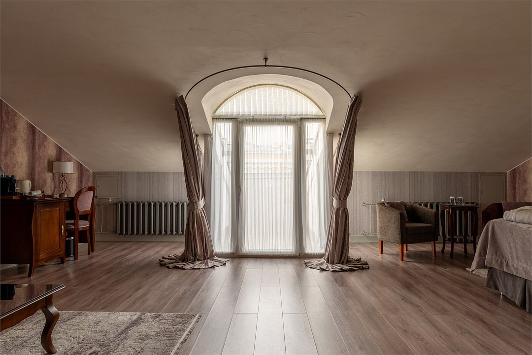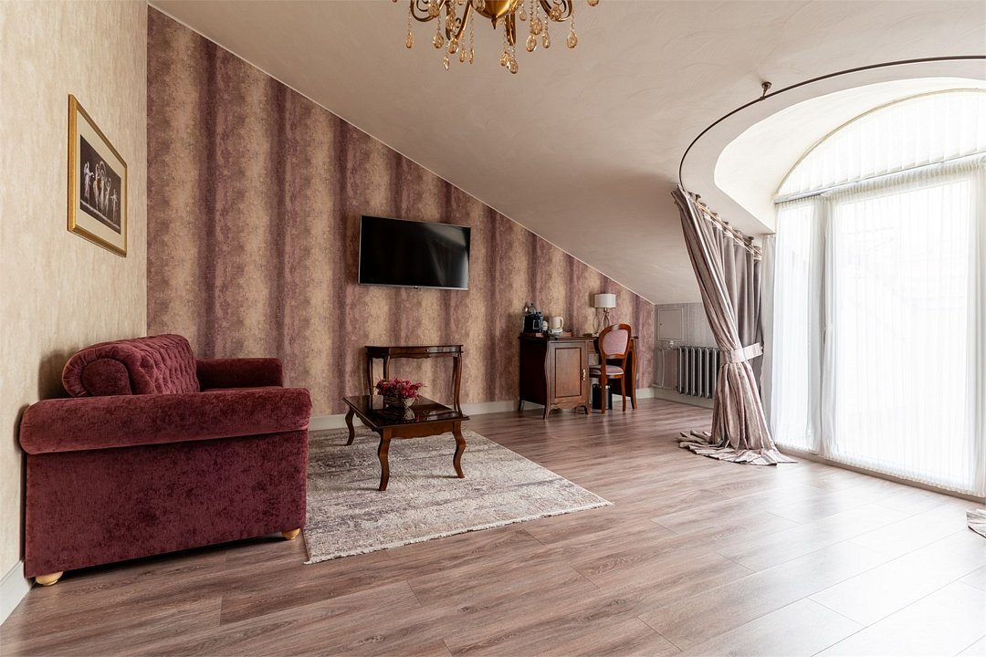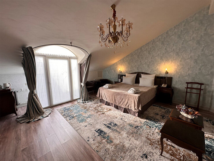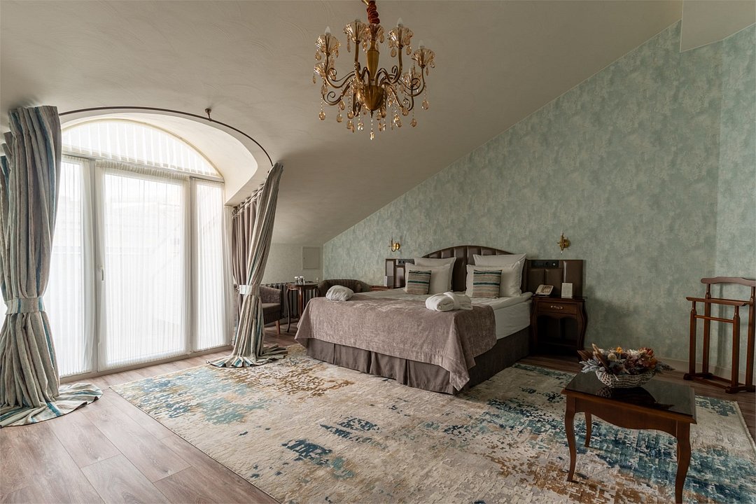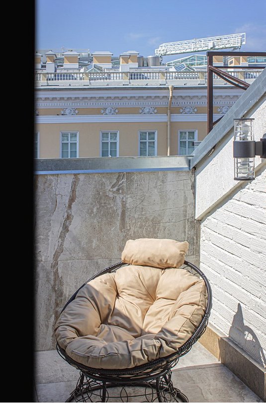 7 просторных номеров Делюкс с собственной небольшой террасой с видом на городские крыши. 1 номер располагается в литере А, 6 номеров - в литере Б, последний этаж (5-ый). Доступ к 5 этажу литеры В только по лестнице с 4 этажа. Ванная комната с мансардным потолком с душем.