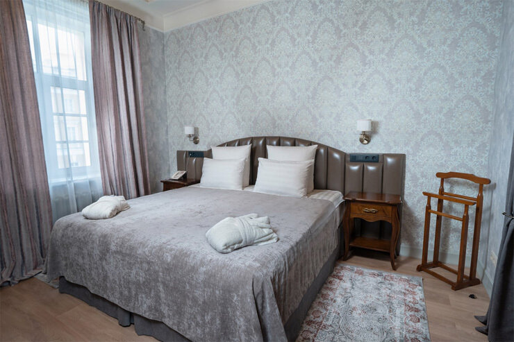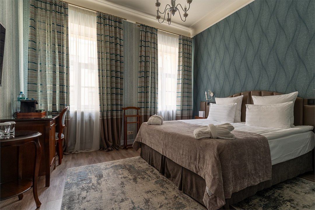 Двухместный номер с видом на набережную реки Мойки. Идеальное сочетание изящных серых или бежевых оттенков с яркими акцентами в интерьере создает атмосферу гармонии и уюта. Оснащение номера: • Кровать king size • Письменный стол для работы и отдыха. • Шкаф с плечиками и сейфом для ваших вещей • Smart TV для просмотра любимых фильмов и передач • Чайно-кофейная станция с капсульным кофе, чаем и сахаром • Расширенный косметический набор, мягкие халаты и комплект полотенец Уборка – ежедневно, смена белья – раз в 2 дня. Чайно-кофейный набор пополняется ежедневно. При заезде - комплимент: безалкогольный мини-бар. По запросу предоставляются меню подушек и гладильные принадлежности (утюг, доска). Особенности: • Номера данного типа расположены на 2, 3, 4 этажах здания в литере А. • Есть возможность увеличить площадь номера, объединив его со смежным номером категории Люкс (при бронировании Вам необходимо уточнить наличие смежного номера). • Кровать king size - трансформер, при совершении бронирования, пожалуйста, укажите тип кровати - одна двуспальная или две односпальные. • Дополнительные спальные места не предоставляются. Насладитесь расслабляющим отдыхом и живописным видом на набережную, который открывается из окон номера.Услуги и удобства