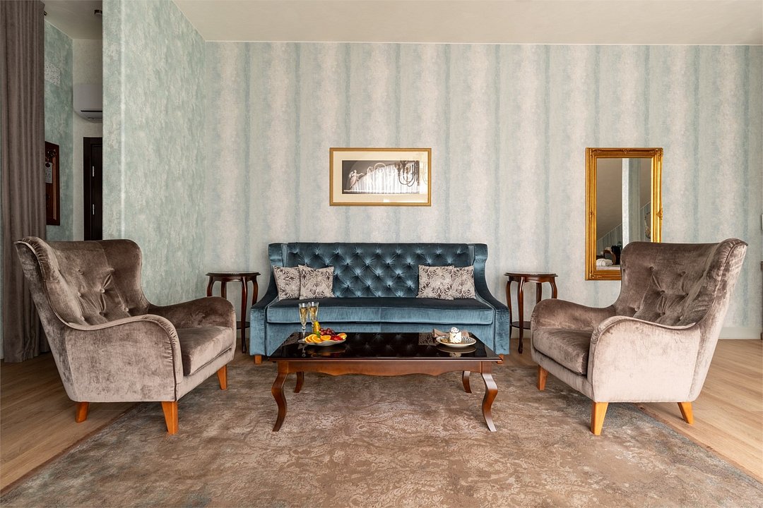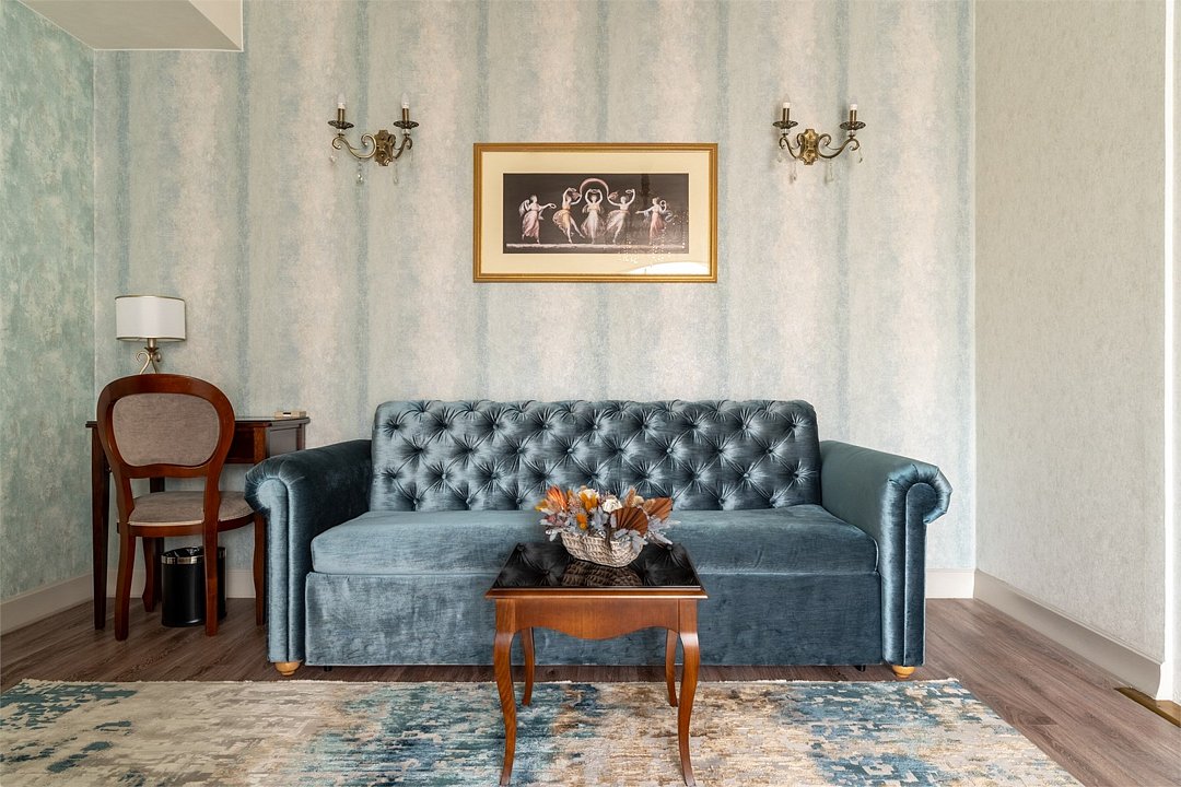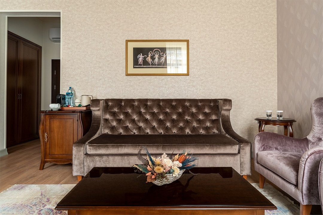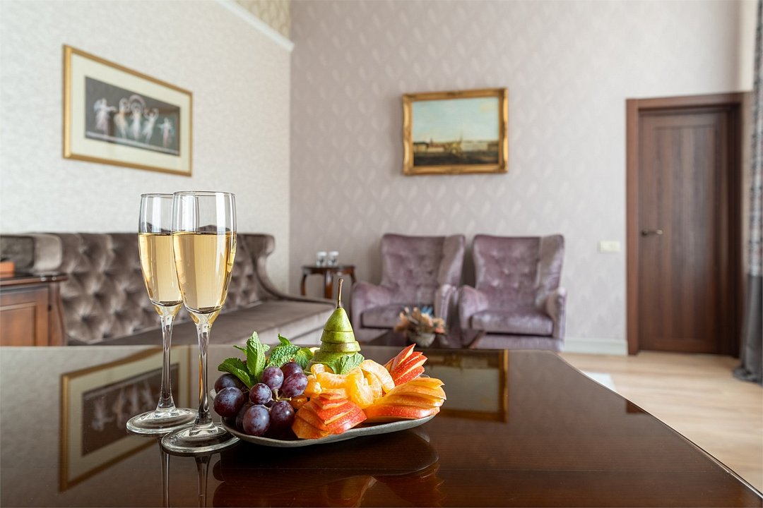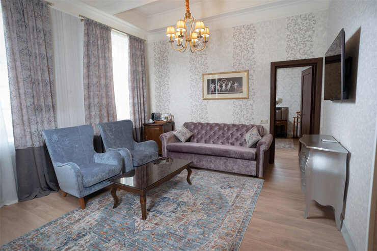 Данный номер – изысканное пространство площадью 60 кв. м, созданное для вашего комфорта и вдохновения. Идеально подойдет для тех, кто ценит стиль и функциональность: Главная изюминка номера – завораживающий вид на набережную реки Мойки, который превращает каждое утро в настоящее наслаждение. Оснащение номера: • Мастер-спальня с собственной ванной комнатой – ваш личный уголок уюта и релакса. • Просторная гостиная с обеденным столом для теплых встреч и приятных моментов и небольшая рабочая зона – для тех, кто совмещает отдых с делами. • Гардеробная комната • Smart TV для просмотра любимых фильмов и передач. • Чайно-кофейная станция с капсульным кофе, чаем и сахаром. • Расширенный косметический набор, мягкие халаты и комплект полотенец. Уборка – ежедневно, смена белья – раз в 2 дня. Чайно-кофейный набор пополняется ежедневно. При заезде - комплимент: безалкогольный мини-бар. По запросу предоставляются меню подушек и гладильные принадлежности (утюг, доска). Особенности: • Номер расположен в литере А. • Есть возможность увеличить площадь номера, объединив его со смежным номером категории Супериор с видом на Мойку (при бронировании Вам необходимо уточнить наличие смежного номера). • Кровать в спальне - размера EMPEROR (200*200). • Диван может быть использован в качестве дополнительного спального места. • В номере две ванных комнаты.Услуги и удобства
