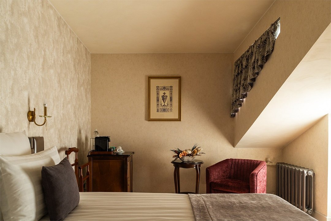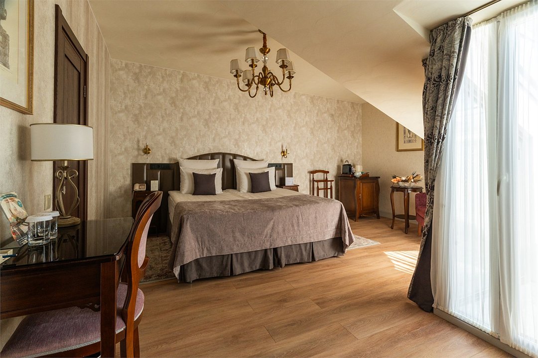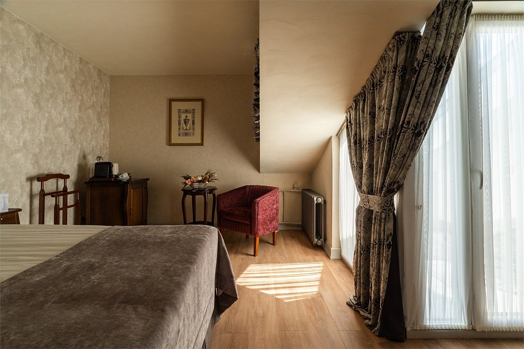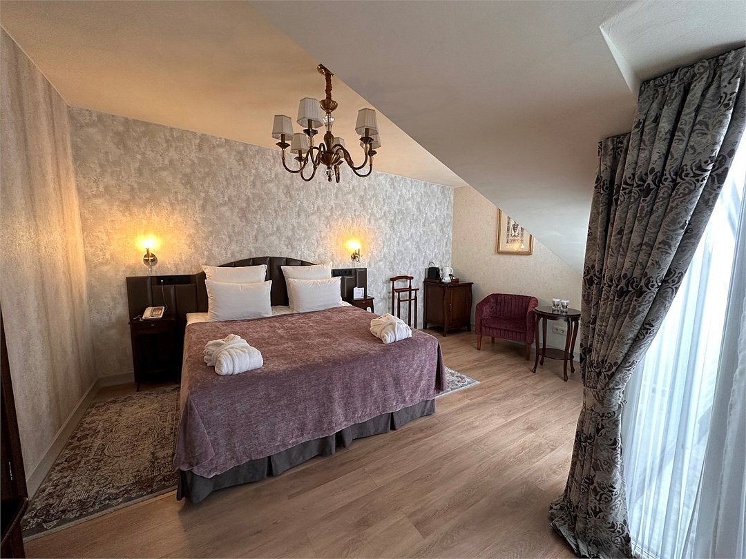Погрузитесь в атмосферу романтики и комфорта в мансардном номере категории Супериор с террасой. Интерьер номера выполнен в классическом стиле в серо-розовых оттенках. Оснащение номера: • Кровать king size • Письменный стол для работы и отдыха • Шкаф с плечиками и сейфом для ваших вещей • Smart TV для просмотра любимых фильмов и передач • Чайно-кофейная станция с капсульным кофе, чаем и сахаром • Расширенный косметический набор, мягкие халаты и комплект полотенец Уборка – ежедневно, смена белья – раз в 2 дня. Чайно-кофейный набор пополняется ежедневно. При заезде - комплимент: безалкогольный мини-бар. По запросу предоставляются меню подушек и гладильные принадлежности (утюг, доска). Особенности: • В номере - скошенный мансардный потолок. • Кровать king size - трансформер, при совершении бронирования, пожалуйста, укажите тип кровати - одна двуспальная или две односпальные. • Дополнительные спальные места не предоставляются.Услуги и удобства
