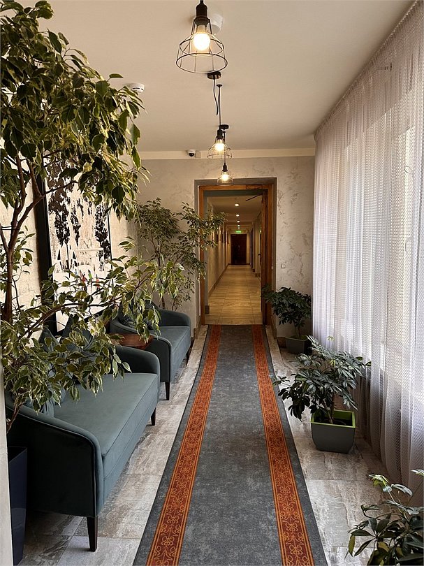 Просторный Делюкс с собственной террасой – идеальный выбор для тех, кто ценит комфорт и уют. Интерьер номера выполнен в спокойных серых или бежевых тонах, дополненных текстилем акцентных оттенков. Оснащение номера: • Кровать king size • Письменный стол для работы и отдыха • Шкаф с плечиками и сейфом для ваших вещей • Раскладной диван • Smart TV для просмотра любимых фильмов и передач • Чайно-кофейная станция с капсульным кофе, чаем и сахаром • Расширенный косметический набор, мягкие халаты и комплект полотенец Уборка – ежедневно, смена белья – раз в 2 дня. Чайно-кофейный набор пополняется ежедневно. При заезде - комплимент: безалкогольный мини-бар. По запросу предоставляются меню подушек и гладильные принадлежности (утюг, доска). Особенности: • Номера данного типа расположены в литерах А и В здания, последний этаж (5-ый). Доступ к 5 этажу литера В - только по лестнице с 4 этажа. • Кровать king size - трансформер, при совершении бронирования, пожалуйста, укажите тип кровати - одна двуспальная или две односпальные. • Диван может быть использован в качестве дополнительного спального места.Услуги и удобства