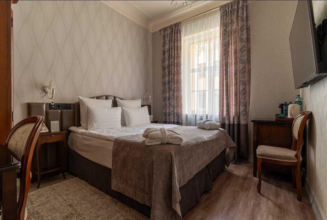 Компактный двухместный номер с видом на живописный внутренний дворик. Идеальное сочетание изящных серых или бежевых оттенков с яркими акцентами в интерьере создает атмосферу гармонии и уюта. Номер идеально подойдет для комфортного проживания гостей, пребывающих в деловых поездках или в путешествии. Оснащение номера для вашего удобства: • Кровать queen size • Письменный стол для работы и отдыха. • Шкаф с плечиками и сейфом для ваших вещей. • Smart TV для просмотра любимых фильмов и передач • Чайно-кофейная станция с капсульным кофе, чаем и сахаром • Расширенный косметический набор, мягкие халаты и комплект полотенец Уборка – ежедневно, смена белья – раз в 2 дня. Чайно-кофейный набор пополняется ежедневно. При заезде - комплимент: безалкогольный мини-бар. По запросу предоставляются меню подушек и гладильные принадлежности (утюг, доска). Особенности: • Номера данного типа расположены в литерах А и В здания на 2, 3, 4 этажах. • Один из номеров со скошенным потолком с мансардным окном.Услуги и удобства