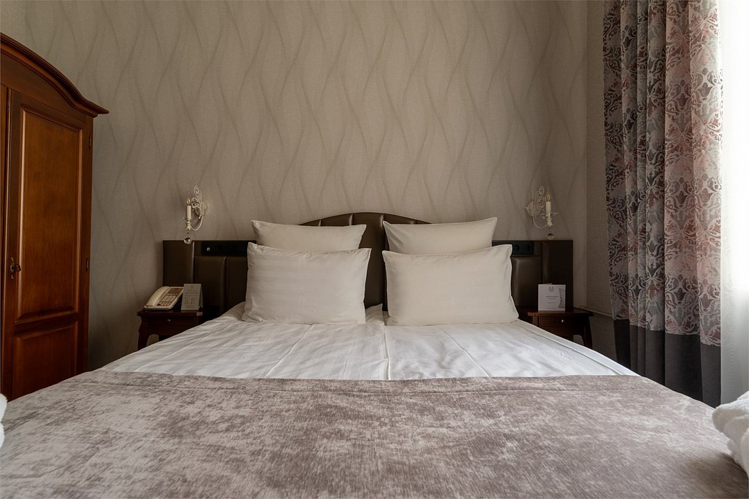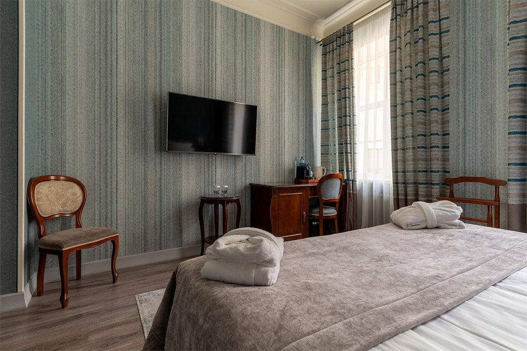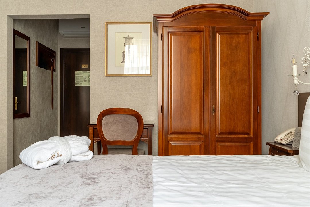 Комфортный двухместный номер с видом на живописный внутренний дворик. Идеальное сочетание изящных серых или бежевых оттенков с яркими акцентами в интерьере создает атмосферу гармонии и уюта. Оснащение номера: • Кровать queen size • Письменный стол для работы и отдыха • Шкаф с плечиками и сейфом для ваших вещей • Smart TV для просмотра любимых фильмов и передач • Чайно-кофейная станция с капсульным кофе, чаем и сахаром • Расширенный косметический набор, мягкие халаты и комплект полотенец Уборка – ежедневно, смена белья – раз в 2 дня. Чайно-кофейный набор пополняется ежедневно. При заезде - комплимент: безалкогольный мини-бар. По запросу предоставляются меню подушек и гладильные принадлежности (утюг, доска). Особенности: Номера данного типа расположены в литерах А и В здания на 2, 3, 4 этажах. Дополнительные спальные места не предоставляются.Услуги и удобства