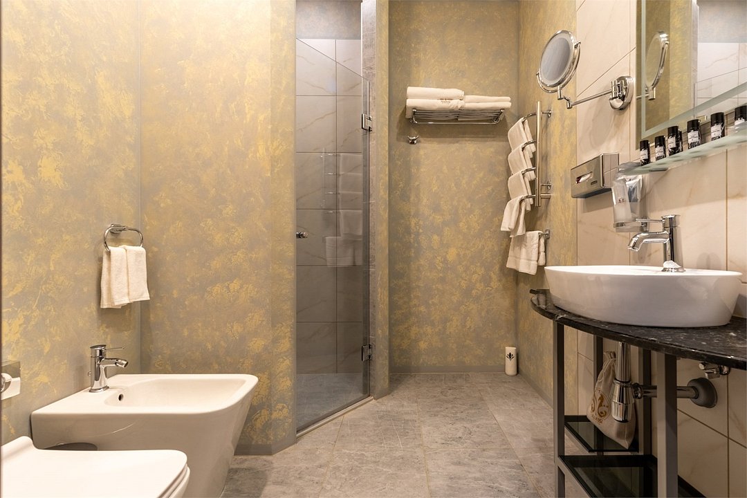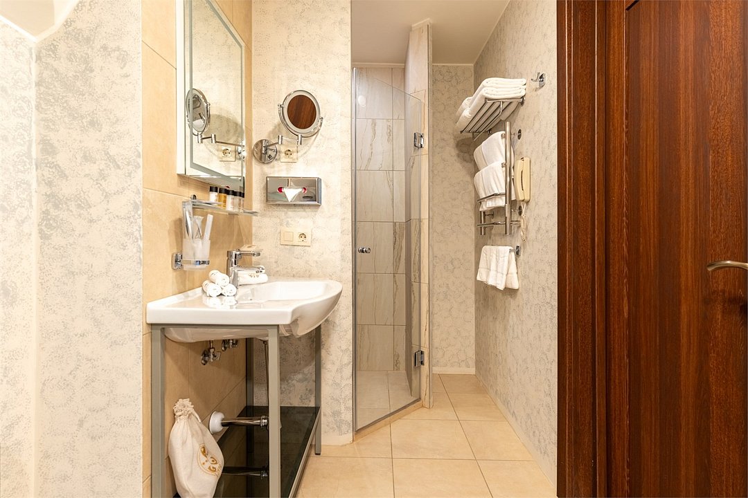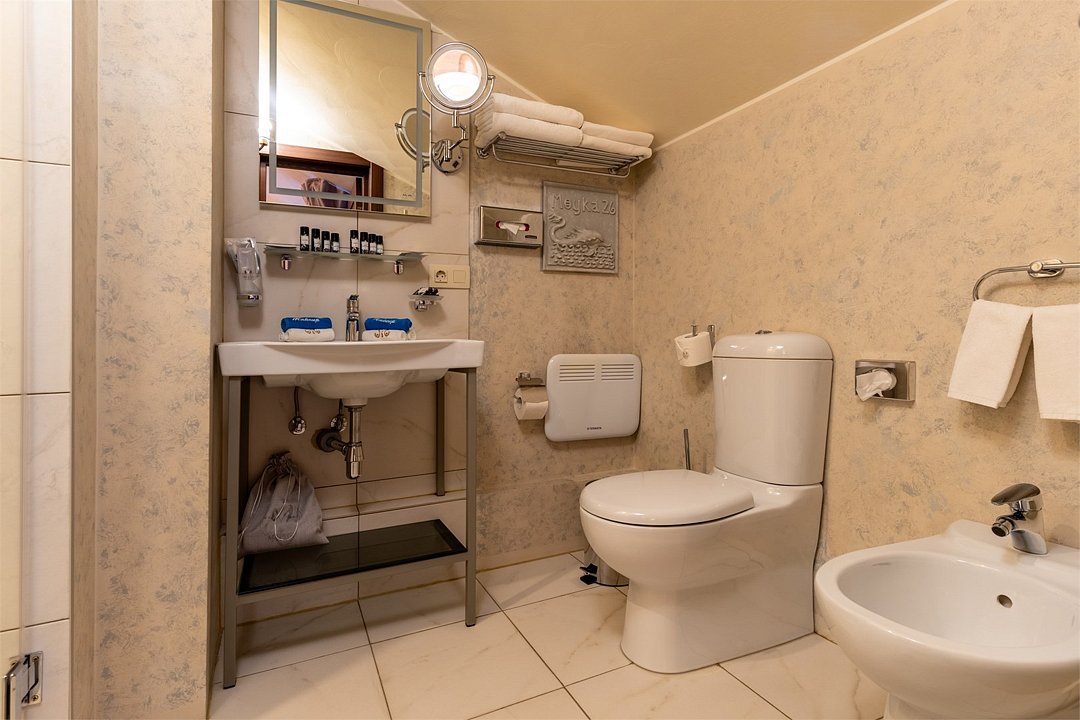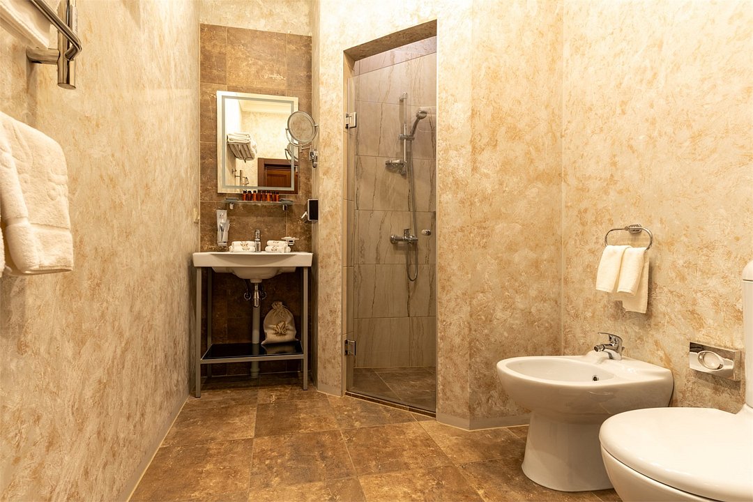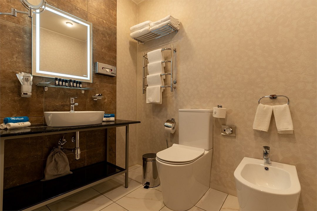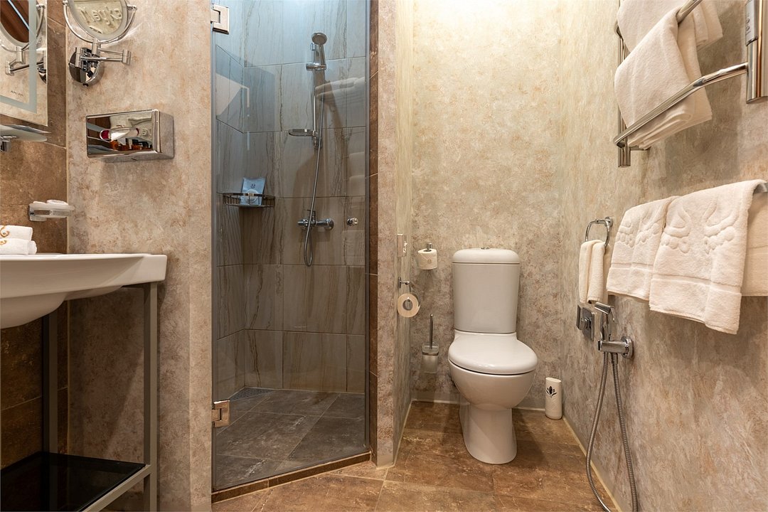Великолепные номера Делюкс Гранд с небольшой террасой расположены на 5 этаже в литере А здания. В ванной комнате, с мансардным полотком, находится душ душем.