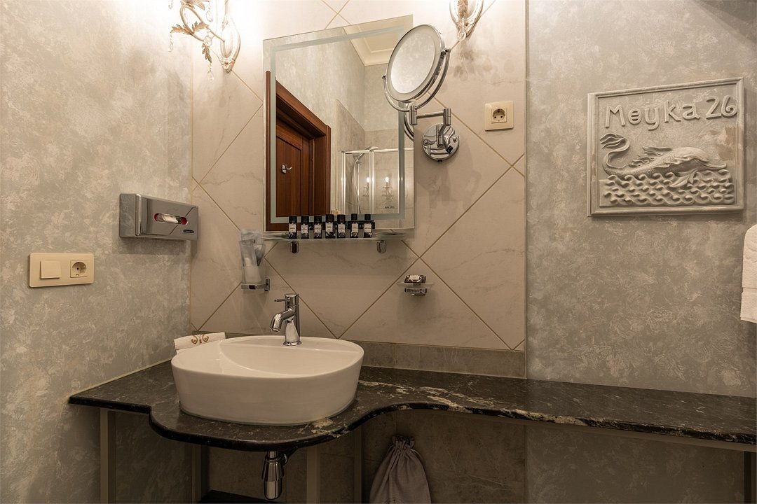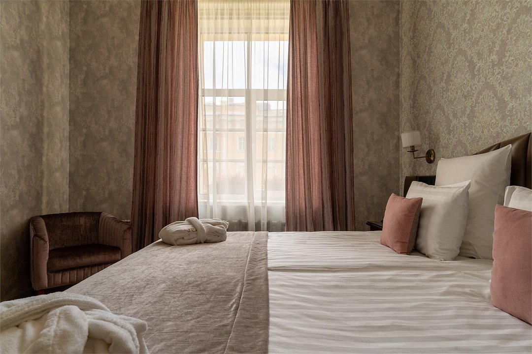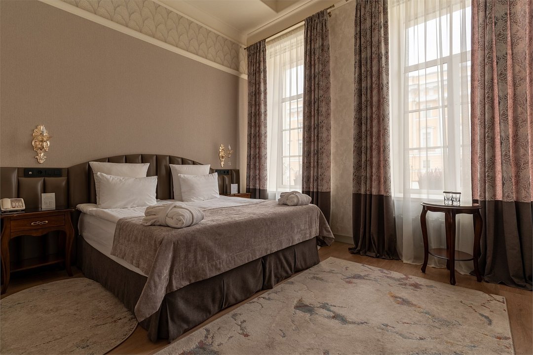 Уютные и продуманные до мелочей номера Делюкс Гранд с видом на реку Мойка очаровывают с первого взгляда. Просторные номера подойдут как семьям до 4 гостей, так и парам. Данные номера имеют отдельную гардеробную в номере. В ванной комнате - ванна или душ.