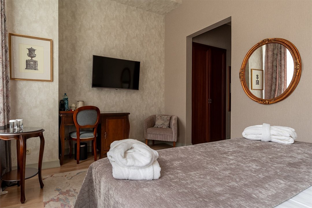 Погрузитесь в атмосферу гармонии и комфорта в номере Делюкс Гранд. С первых секунд он очаровывает продуманностью деталей и своей элегантной простотой. Просторный и светлый, этот номер идеально подходит для семей до 4 человек или романтического отдыха вдвоем. Интерьер выполнен в мягких приглушенных тонах серого или бежевого цветов, которые создают ощущение спокойствия, а акцентный текстиль добавляет изюминку и уют. И, конечно, главная изюминка – завораживающий вид на реку Мойка. Представьте, как утренний кофе или вечерний чай становятся особенными благодаря красоте водной глади за окном. Оснащение номера: • Кровать king size • Письменный стол для работы и отдыха • В ванной комнате – ванна. • Раскладной диван • Smart TV для просмотра любимых фильмов и передач • Чайно-кофейная станция с капсульным кофе, чаем и сахаром • Расширенный косметический набор, мягкие халаты и комплект полотенец Уборка – ежедневно, смена белья – раз в 2 дня. Чайно-кофейный набор пополняется ежедневно. При заезде - комплимент: безалкогольный мини-бар. По запросу предоставляются меню подушек и гладильные принадлежности (утюг, доска). Особенности: • Кровать king size - трансформер, при совершении бронирования, пожалуйста, укажите тип кровати - одна двуспальная или две односпальные. • Диван может быть использован в качестве дополнительного спального места. • В некоторых номерах – гардеробная.Услуги и удобства