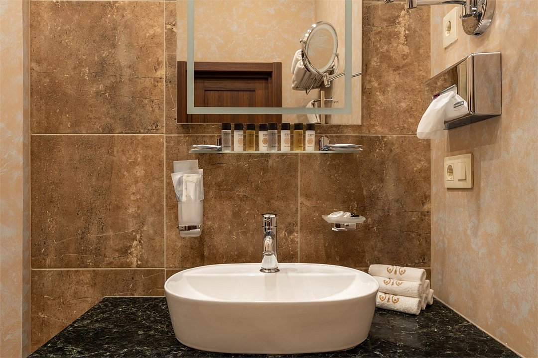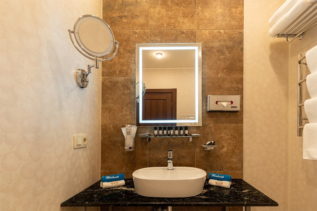 Данный номер – визитная карточка отеля, воплощение роскоши и элегантности. Пространство площадью 66 квадратных метров станет идеальным выбором для тех, кто ценит комфорт и стремится сделать свой отдых или праздник незабываемым. Номер создан для особенных моментов: годовщин, свадеб или дней рождения. Его стильный интерьер вызывает восхищение, а каждая деталь продумана, чтобы подарить вам уникальные эмоции. Изюминка номера – терраса с панорамным обзором на 180 градусов. Наслаждайтесь захватывающими видами на городской пейзаж, которые станут достойным обрамлением ваших памятных мгновений. Оснащение номера: • Кровать king size • Письменный стол для работы и отдыха • Мягкая зона с раскладным диваном • Гардеробная комната • Ванная комната с душевой кабиной и ванной • Smart TV для просмотра любимых фильмов и передач • Чайно-кофейная станция с капсульным кофе, чаем и сахаром • Расширенный косметический набор, мягкие халаты и комплект полотенец Уборка – ежедневно, смена белья – раз в 2 дня. Чайно-кофейный набор пополняется ежедневно. При заезде - комплимент: безалкогольный мини-бар. По запросу предоставляются меню подушек и гладильные принадлежности (утюг, доска). Особенности: • Номер расположен в литере А. • Кровать king size - трансформер, при совершении бронирования, пожалуйста, укажите тип кровати - одна двуспальная или две односпальные. • Диван может быть использован в качестве дополнительного спального места.Услуги и удобства