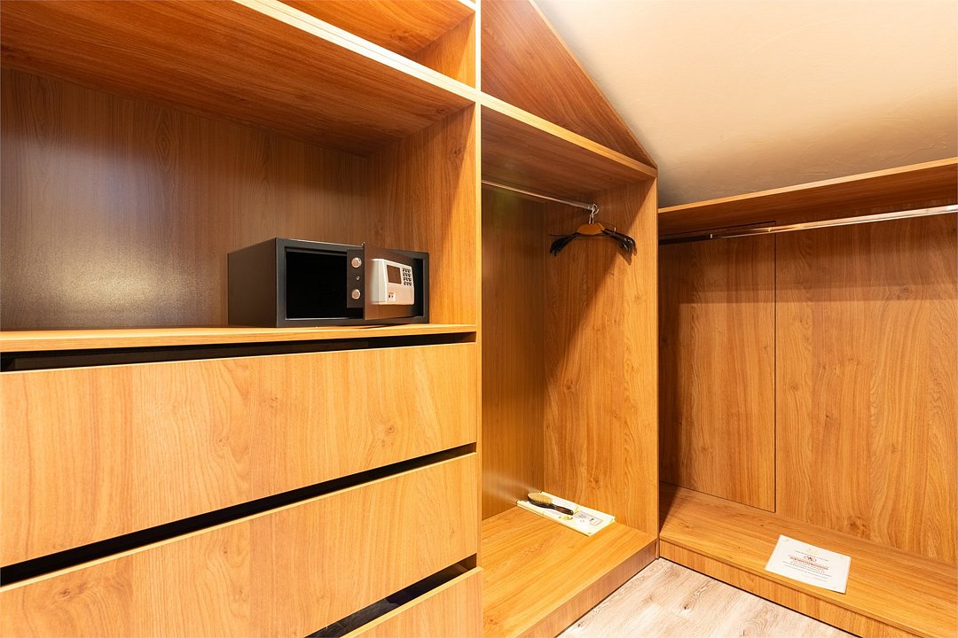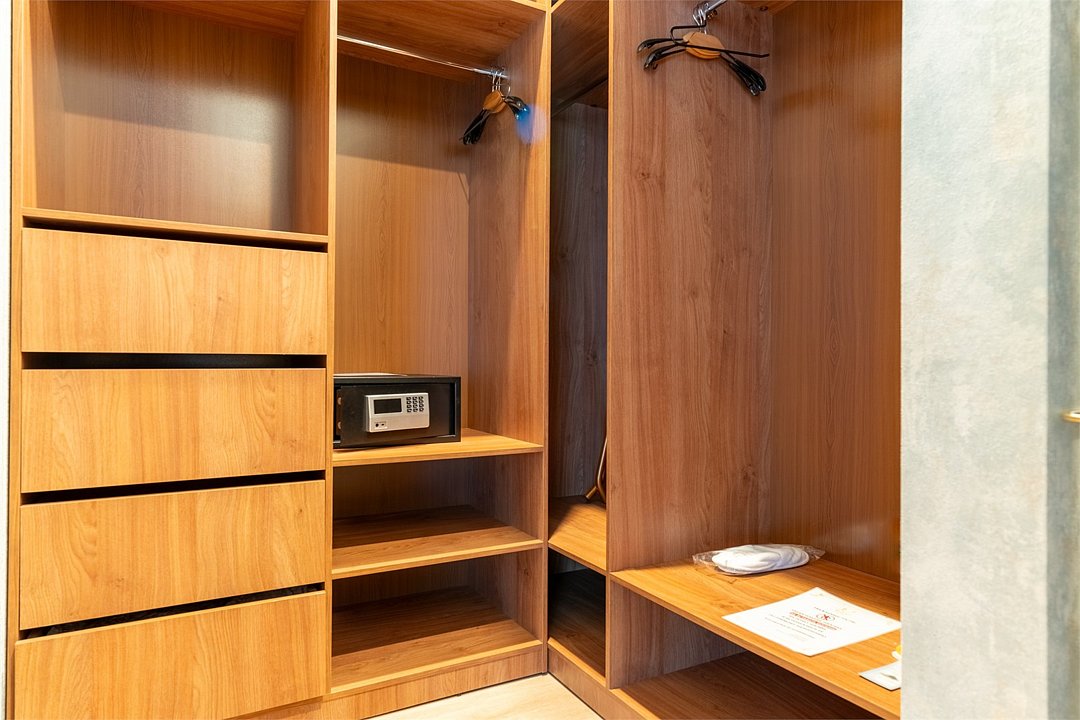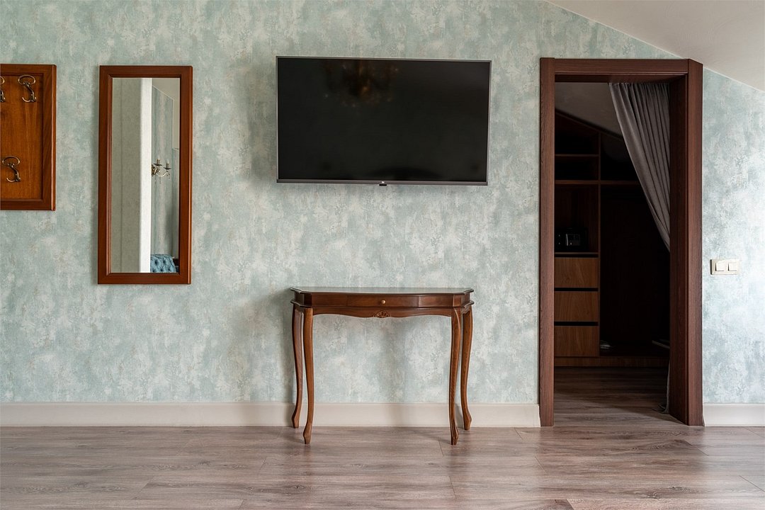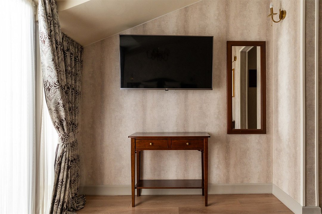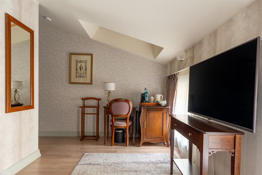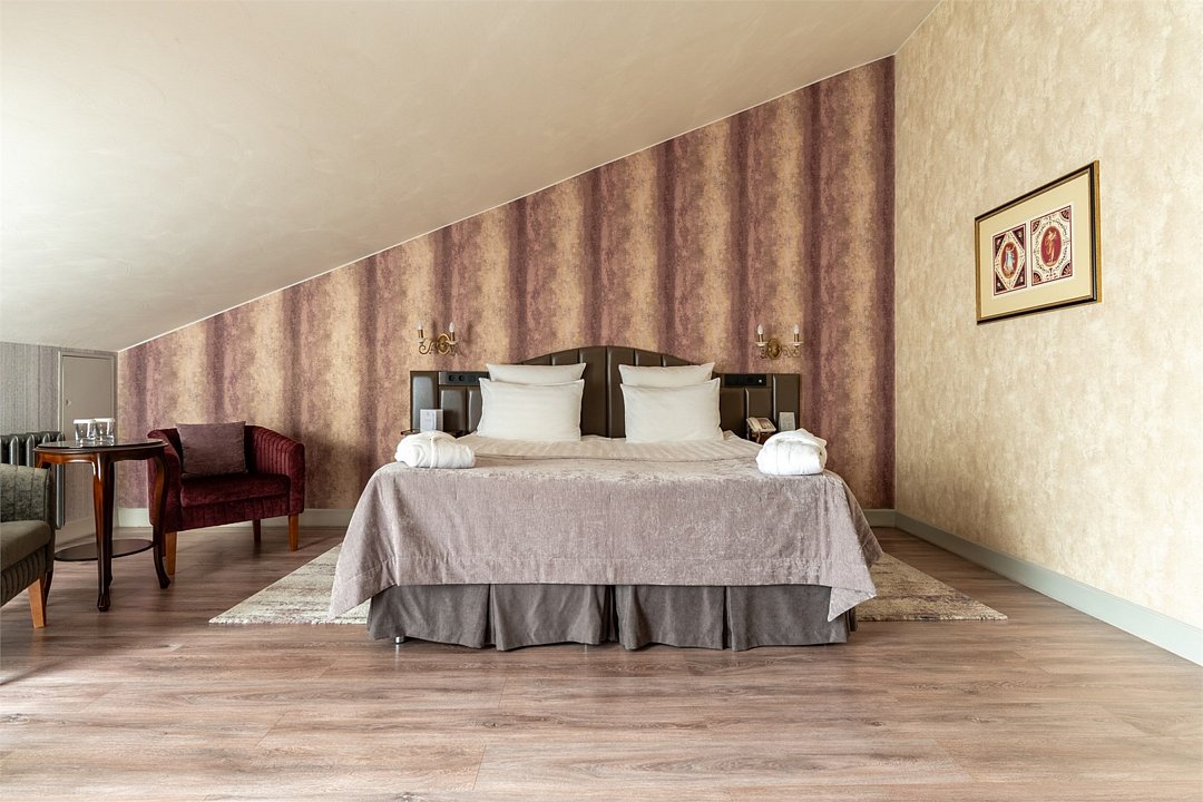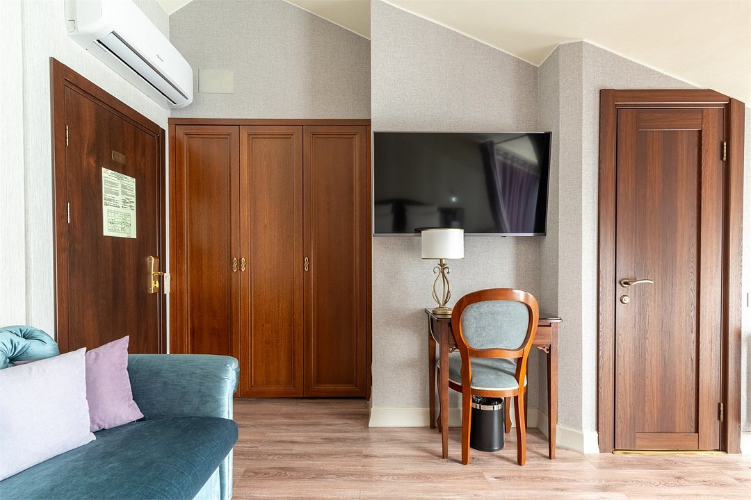 Просторный номер идеально сочетает стиль и комфорт, создавая идеальное пространство для отдыха и вдохновения. Интерьер выполнен в элегантной палитре приглушенных серых или бежевых оттенков, дополненных акцентным текстилем, который добавляет тепла и шарма. Каждая деталь в дизайне номера продумана до мелочей, чтобы вы чувствовали себя особенными. Оснащение номера: • Кровать king size • Письменный стол для работы и отдыха • Шкаф с плечиками и сейфом для ваших вещей • Раскладной диван • Smart TV для просмотра любимых фильмов и передач • Чайно-кофейная станция с капсульным кофе, чаем и сахаром • Расширенный косметический набор, мягкие халаты и комплект полотенец Уборка – ежедневно, смена белья – раз в 2 дня. Чайно-кофейный набор пополняется ежедневно. При заезде - комплимент: безалкогольный мини-бар. По запросу предоставляются меню подушек и гладильные принадлежности (утюг, доска). Особенности: • Кровать king size - трансформер, при совершении бронирования, пожалуйста, укажите тип кровати - одна двуспальная или две односпальные. • Номера данного типа расположены на 5 этаже в литере А здания. • Диван может быть использован в качестве дополнительного спального места. • В номере – мансардный потолок.Услуги и удобства