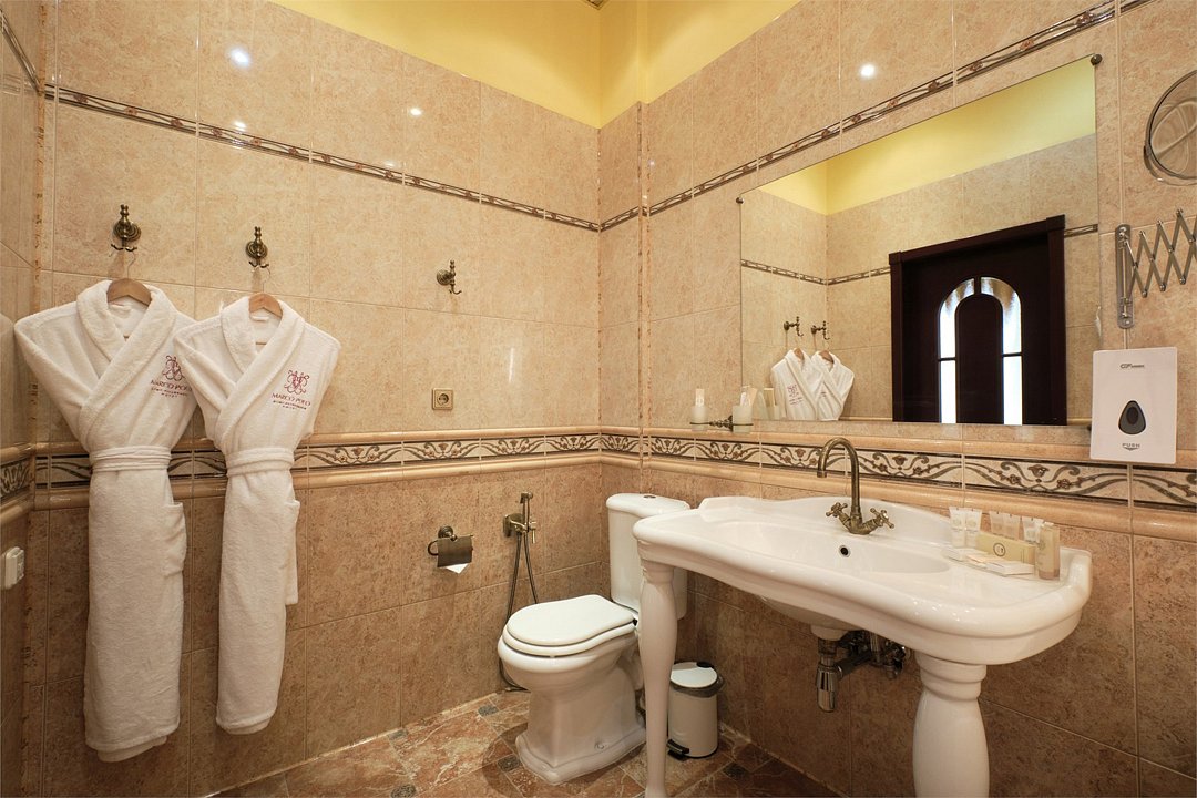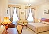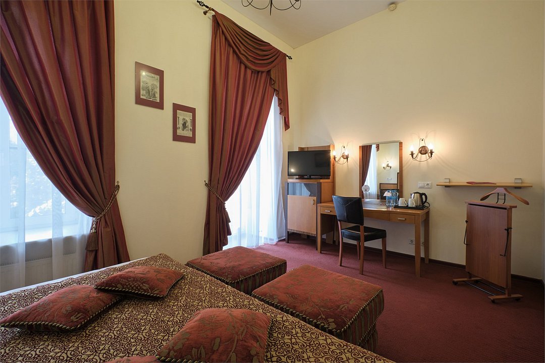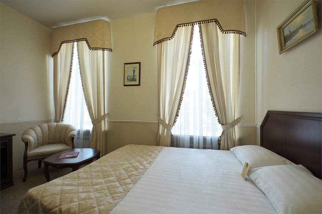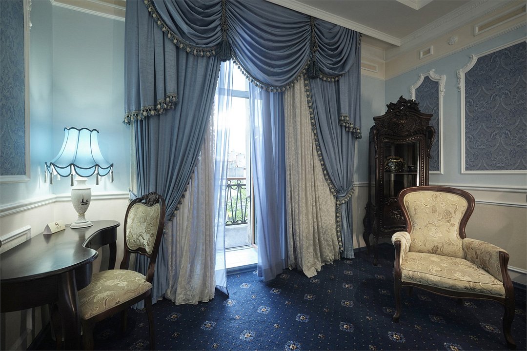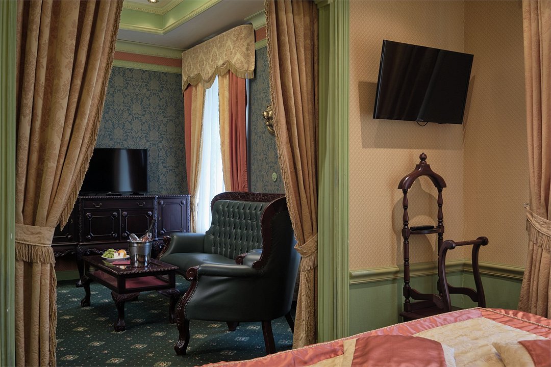 Люкс «Grand» — воплощение петербургской аристократии XIX века. Этот просторный двухкомнатный номер выполнен в лучших традициях императорской столицы. Элегантный лепной декор, жаккардовые панно из шёлка и подлинные антикварные предметы погружают в атмосферу золотого века Санкт-Петербурга. Гостиная располагает уютным мягким гарнитуром, сервантами, журнальным и рабочим столами. Спальня оформлена с особым вниманием к деталям: здесь — большая кровать с роскошным балдахином, туалетный столик, коллекция книг и посуды, антикварные акценты и плазменная панель. Ванная комната оборудована ванной, мягкими халатами и тапочками, феном и набором туалетных принадлежностей — всё для вашего абсолютного комфорта. «Grand» — номер, в котором оживает стиль и изящество старого Петербурга.Услуги и удобства