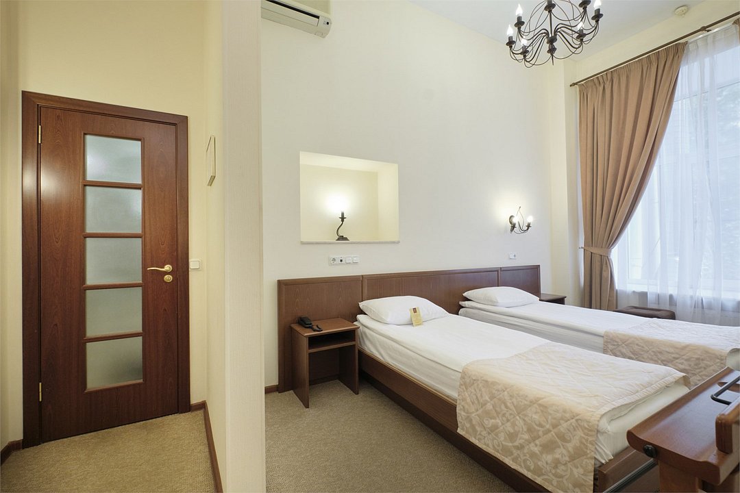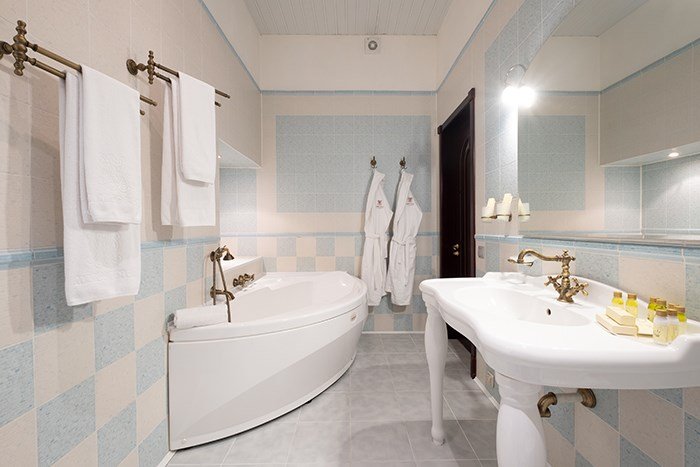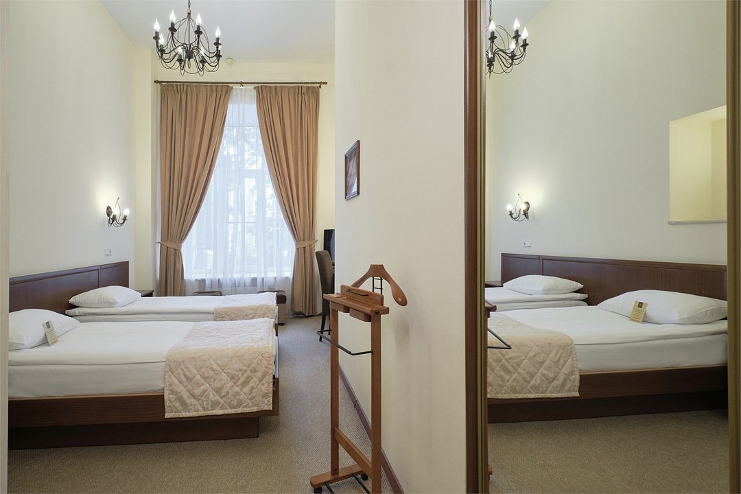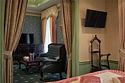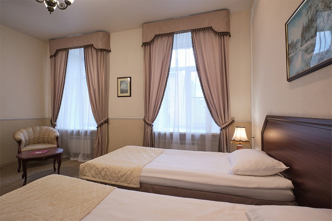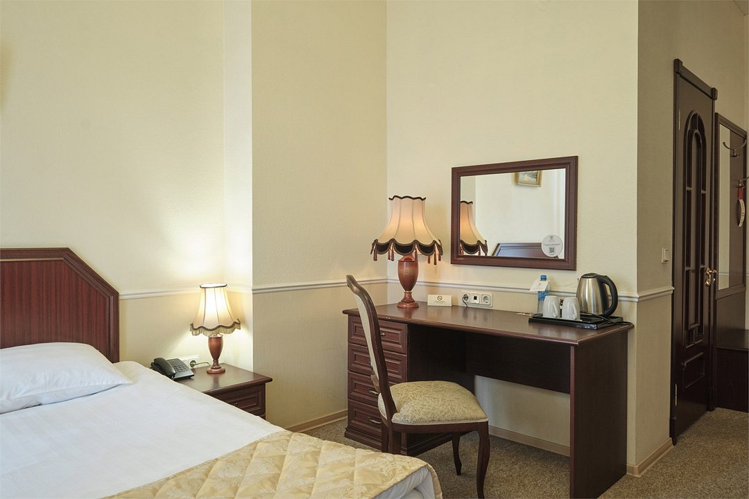 Люкс «Grand» — воплощение петербургской аристократии XIX века. Этот просторный двухкомнатный номер выполнен в лучших традициях императорской столицы. Элегантный лепной декор, жаккардовые панно из шёлка и подлинные антикварные предметы погружают в атмосферу золотого века Санкт-Петербурга. Гостиная располагает уютным мягким гарнитуром, сервантами, журнальным и рабочим столами. Спальня оформлена с особым вниманием к деталям: здесь — большая кровать с роскошным балдахином, туалетный столик, коллекция книг и посуды, антикварные акценты и плазменная панель. Ванная комната оборудована ванной, мягкими халатами и тапочками, феном и набором туалетных принадлежностей — всё для вашего абсолютного комфорта. «Grand» — номер, в котором оживает стиль и изящество старого Петербурга.Услуги и удобства