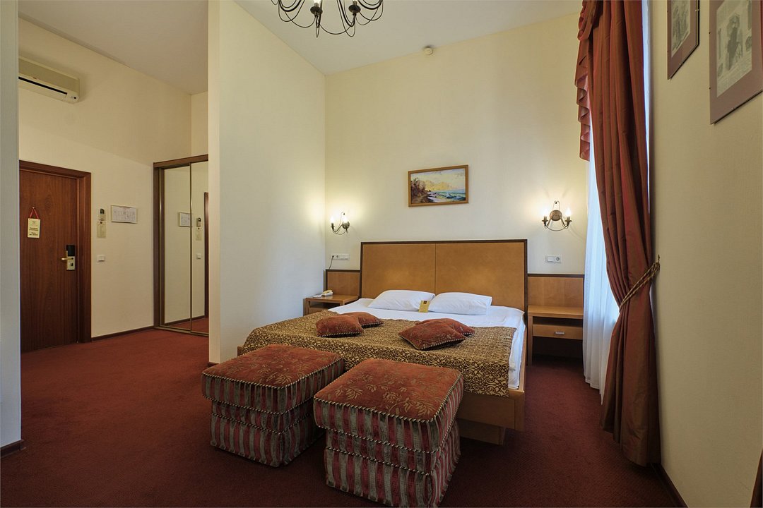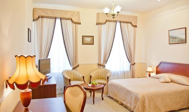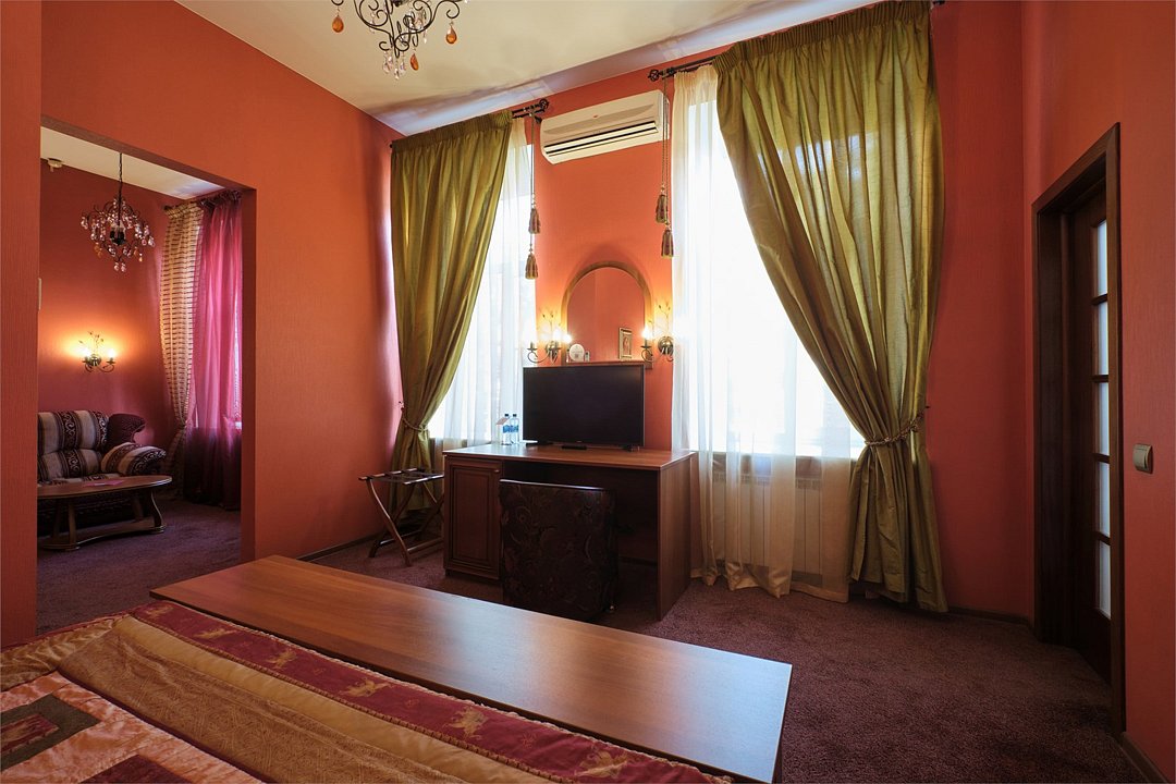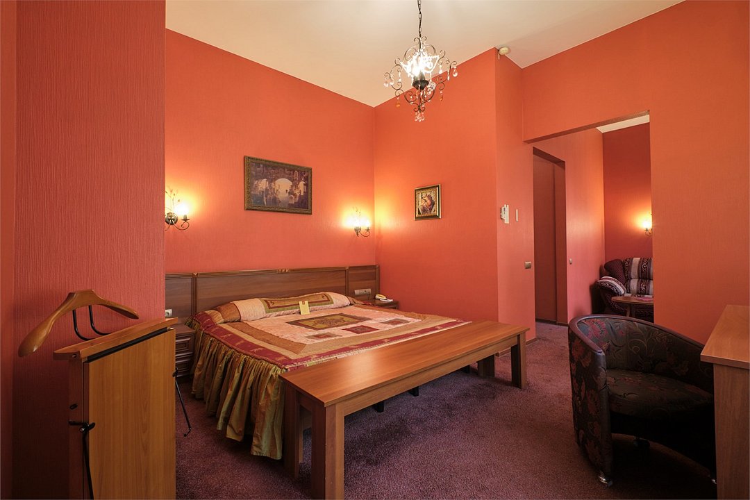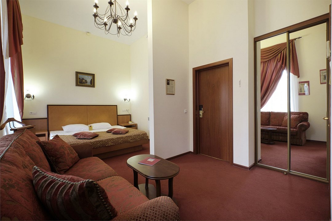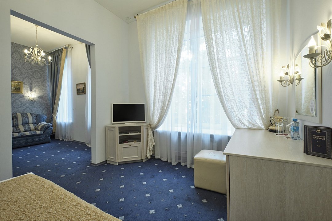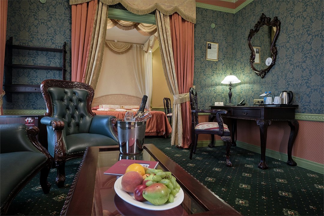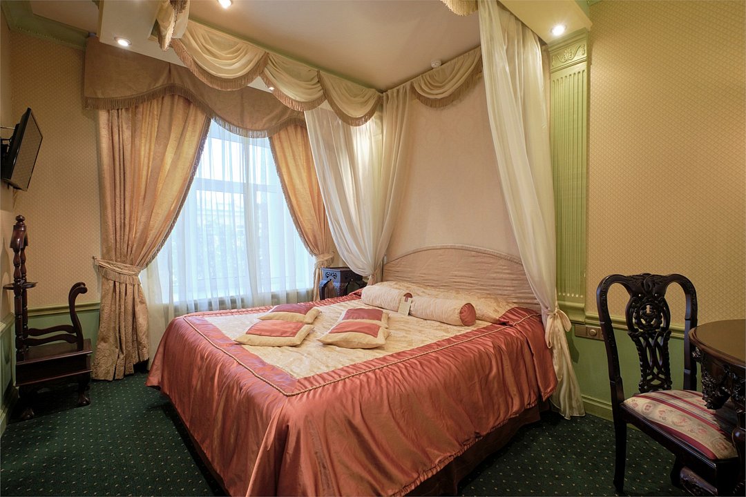 Интерьеры номеров категории люкс станут идеальным решением для проведения фотосессий, коммерческой или киносъемки. В номерах люкс вас встретит винтажный шик, кровати с балдахинами и богатыми драпировками. Гостиные обставлены изящной антикварной мебелью из красного дерева и тематическими атрибутами аристократического салона: старинные книги, канделябры, посуда и картины в богатых подрамниках. В номерах достаточно места для проведения фотосессий в формате «утро невесты», «романтический вечер молодоженов» и других тематических свадебных фотосетов.