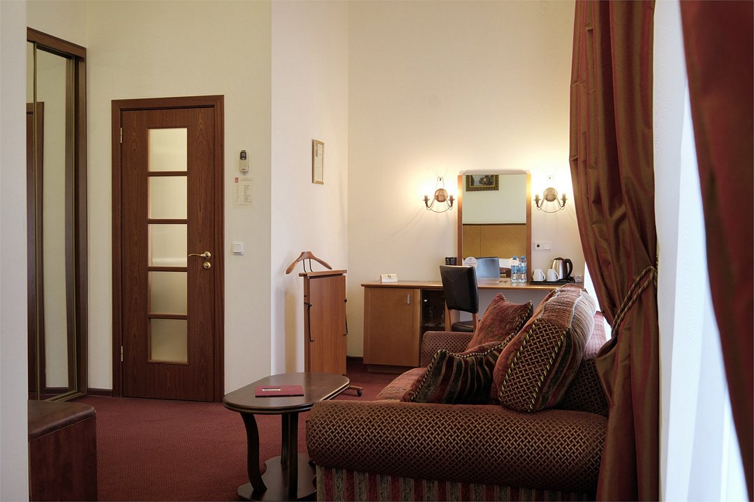 два телевизора, Wi-Fi, телефон, кондиционер, фен, электронные замки, утюг, ванная комната, ванна, халаты, банные полотенца, тапочки, косметические средства, балкон, кровать «King size», гладильная доска, кресла, стулья, шкаф для одежды, журнальный столик, письменный стол, зеркало, комод, эксклюзивная мебель, мебельный гарнитур, две комнаты, чайный набор, обслуживание номеров, сейф, пресс для глажения брюк, чайник, унитаз, раковина, гостиная зона, ковровое покрытие, отопление, вид на город, меню подушек, стаканы, кофейный столик, туалетный столик, телевизор с плоским экраном, москитная сетка, холодильный шкаф, гигиенический душ, антикварная мебель, чайная станция, фумигатор, межкомнатная дверь, набор для приготовления чая и кофе, услуги прачечной (платно), бутилированная вода, комната для переговоров (за дополнительную плату)В гостиничном номере