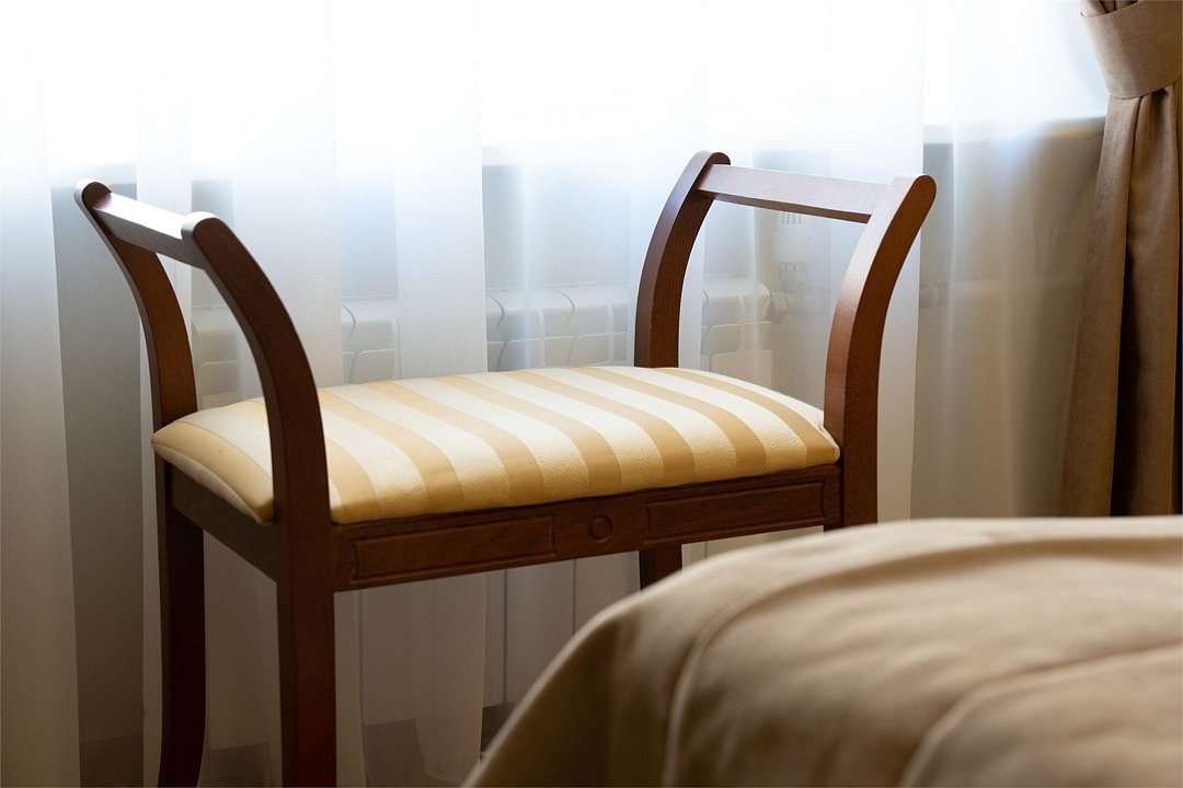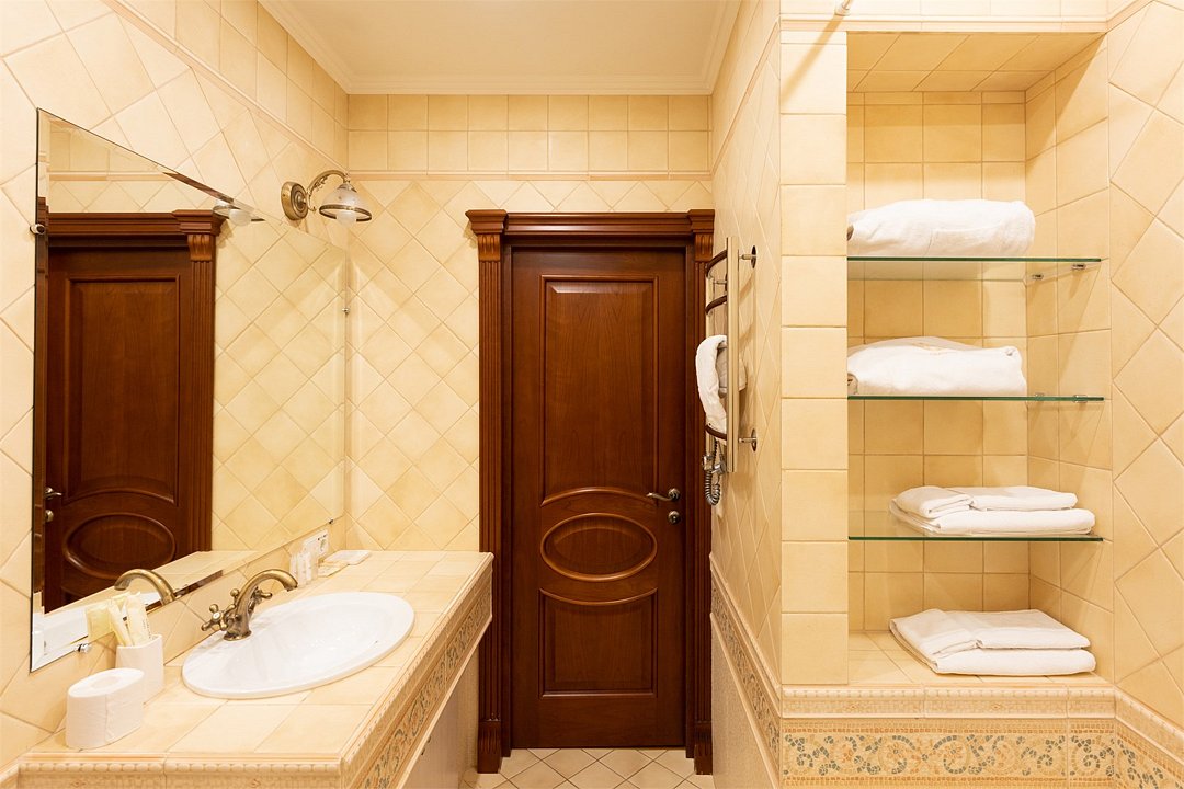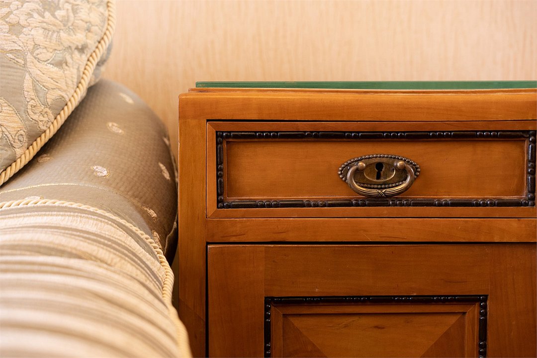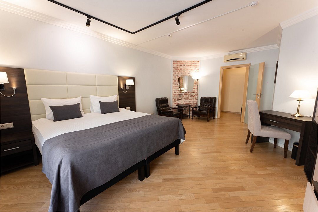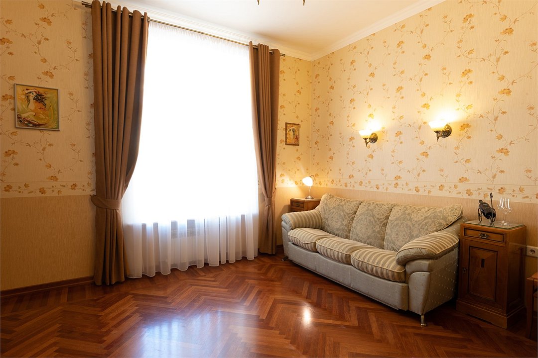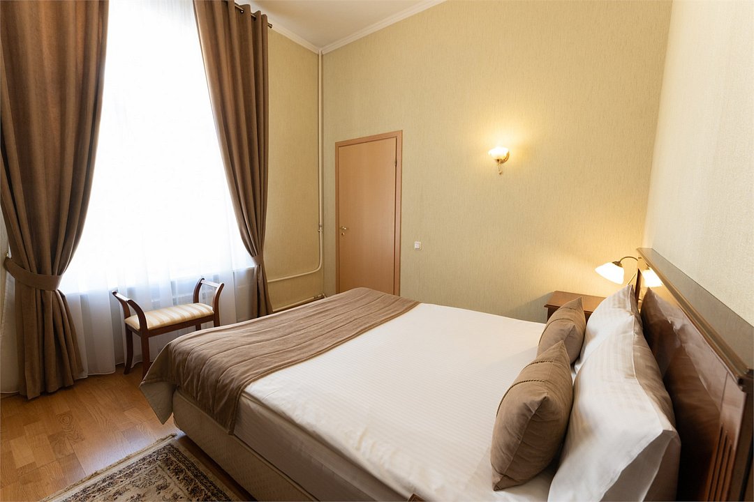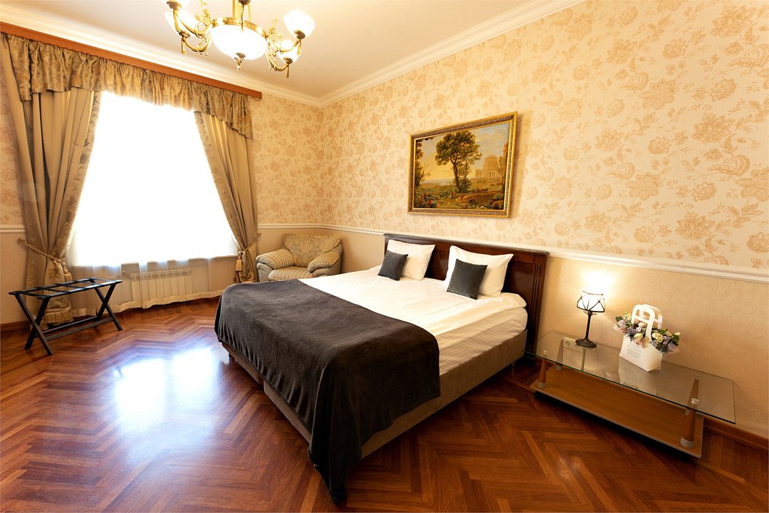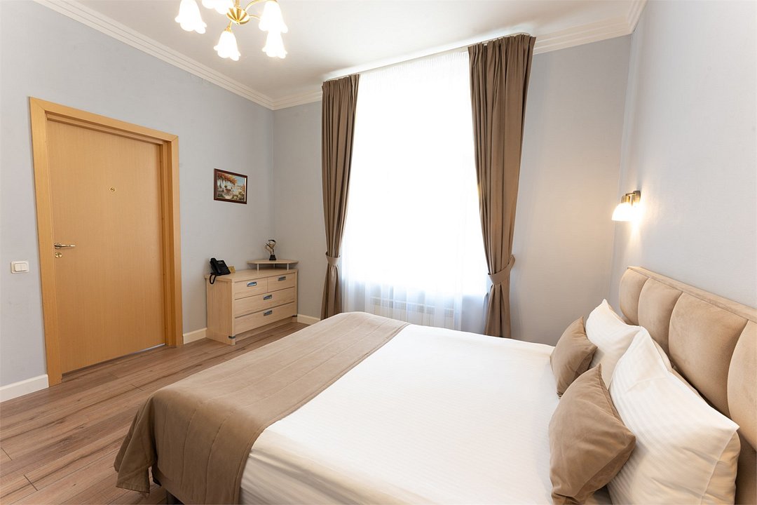 Просторные двухкомнатные апартаменты. Высокие потолки, большие окна с видом на тихий внутренний дворик делают пространство светлым и просторным. Антикварная мебель из древесины грушевого дерева, подвесные люстры, старинный трельяж, паркет из красного дерева насыщают апартаменты атмосферой покоя и расслабленности. Всё дышит традициями классической петербургской квартиры XIX века. Первая комната - уютная гостиная с раскладным двуспальным диваном и вторая комната - отдельная камерная спальная с двуспальной кроватью. В каждой комнате есть вместительный гардероб. В Вашем распоряжении - ванная комната с душем, чайный набор, фен, косметическая продукция, шапочка для душа, тапочки. Апартаменты оборудованы кондиционером, доступен бесплатный wi-fi. Наши гости могут воспользоваться услугами питания четырехзвездочного отеля, расположенного в том же комплексе.Услуги и удобства