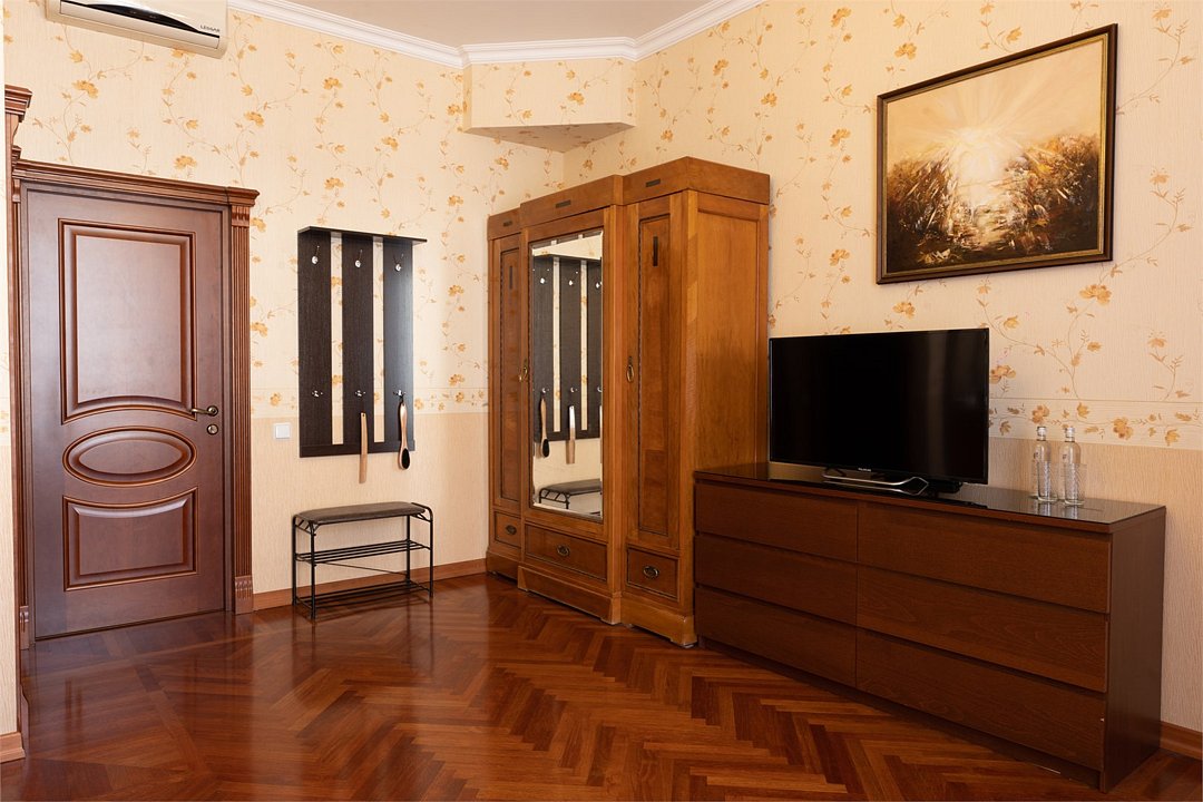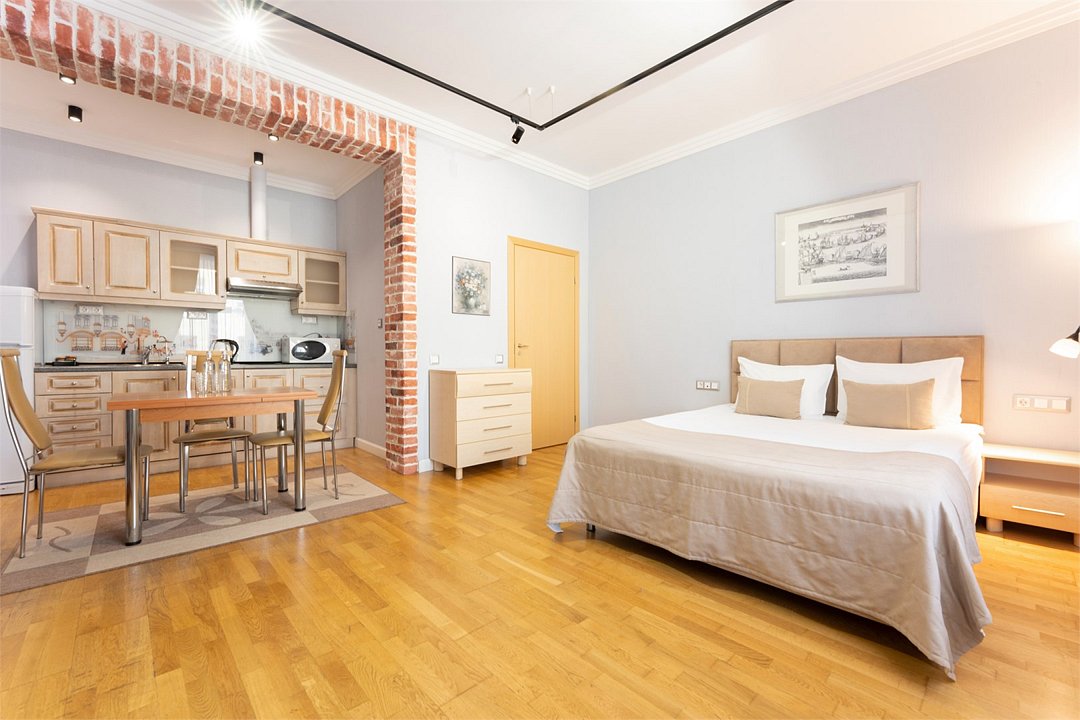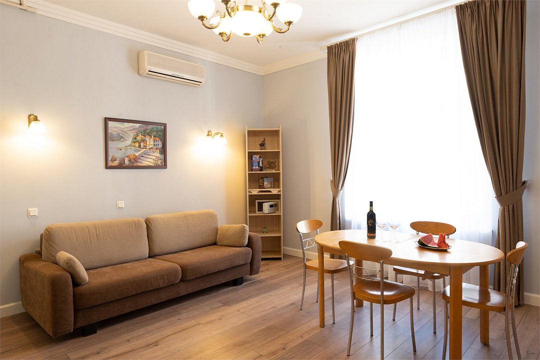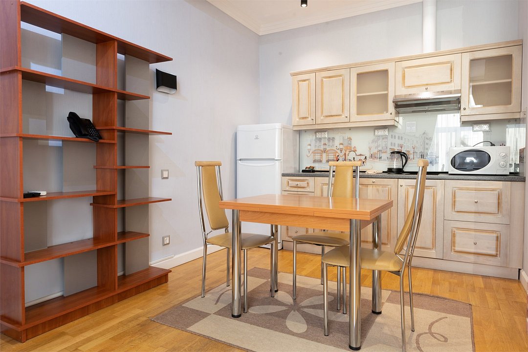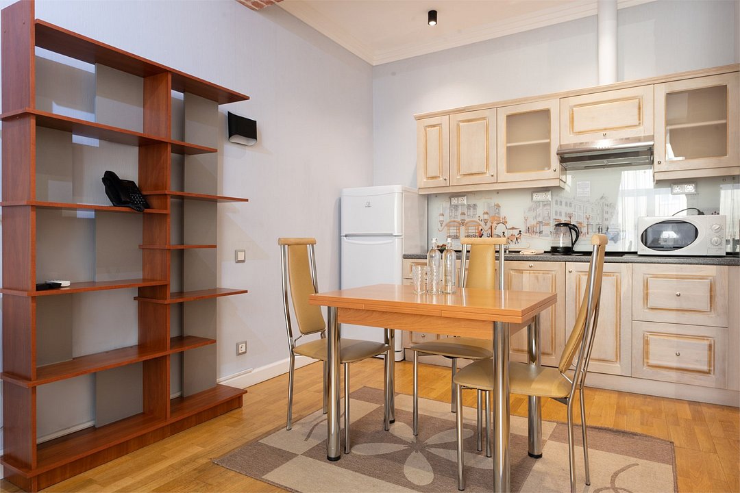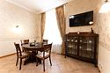 Большая площадь апартаментов располагает к спокойному и размеренному отдыху в самом центре Санкт-Петербурга. Главные достопримечательности: церковь Спас-На-Крови, набережная реки Мойки, Русский музей, Казанский собор, Эрмитаж, и Невский проспект находятся всего в нескольких минутах ходьбы. Высокие потолки, большие окна, выходящие в тихий внутренний двор, делают пространство особенно светлым и просторным. Мебель из массива ценных пород дерева, подвесные люстры и паркетный пол придают апартаментам особый стиль, создают атмосферу покоя и расслабленности. Аристократичная спальня, площадью 24 кв. метра с двуспальной кроватью оборудована плазменной панелью. Кухня-гостиная с антикварным буфетом из черного дерева и кухонным островком оборудована всей необходимой современной бытовой техникой. Дополнительные бра и светильники позволяют создать особую атмосферу за овальным обеденным столом. В Вашем распоряжении - ванная комната с ванной, и биде. Доступен бесплатный wi-fi. Наши гости могут воспользоваться услугами питания четырехзвездочного отеля, расположенного в том же комплексе.Услуги и удобства