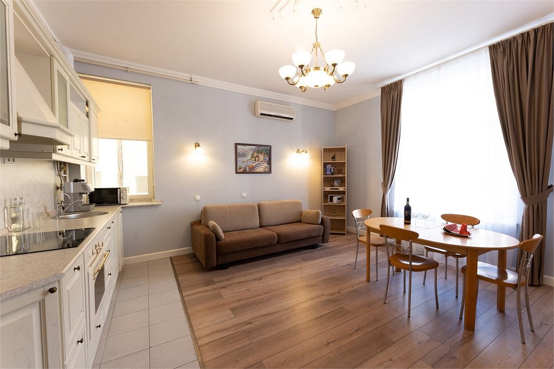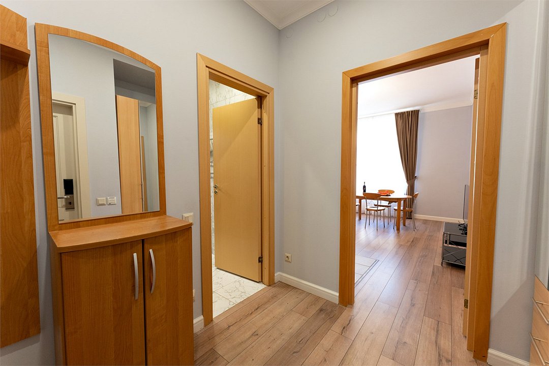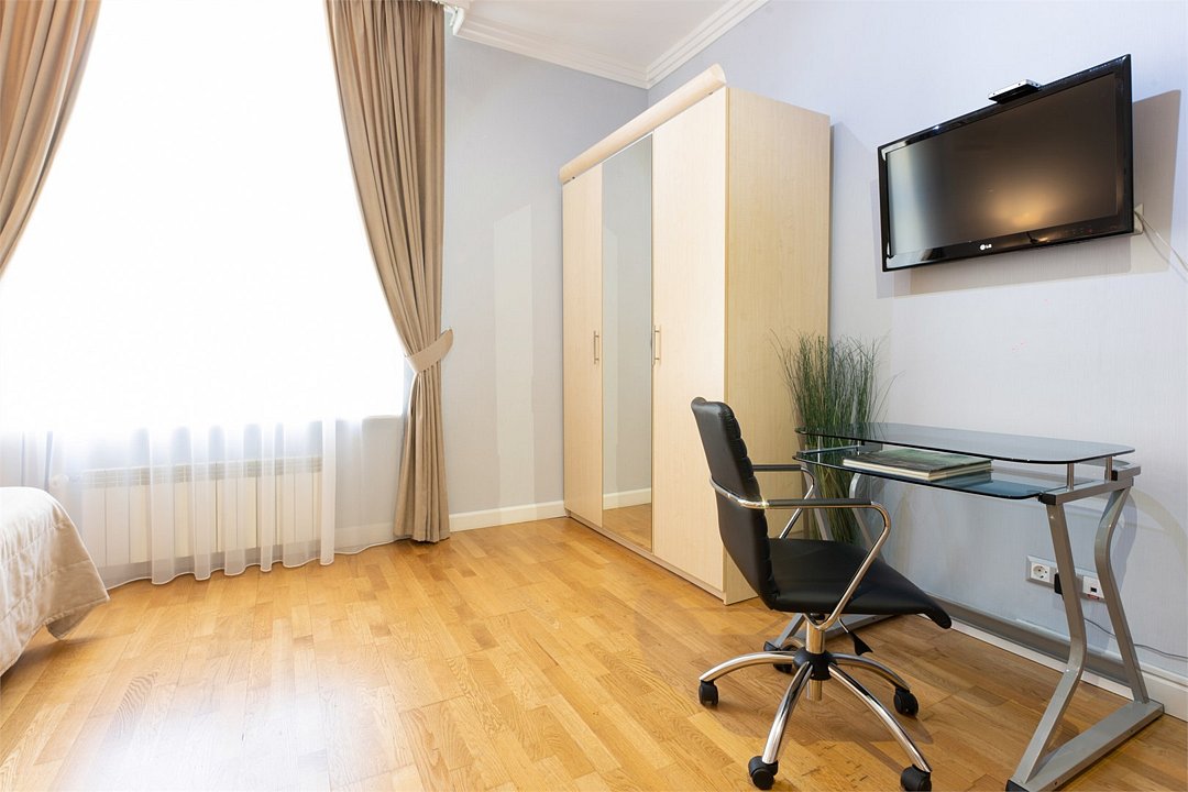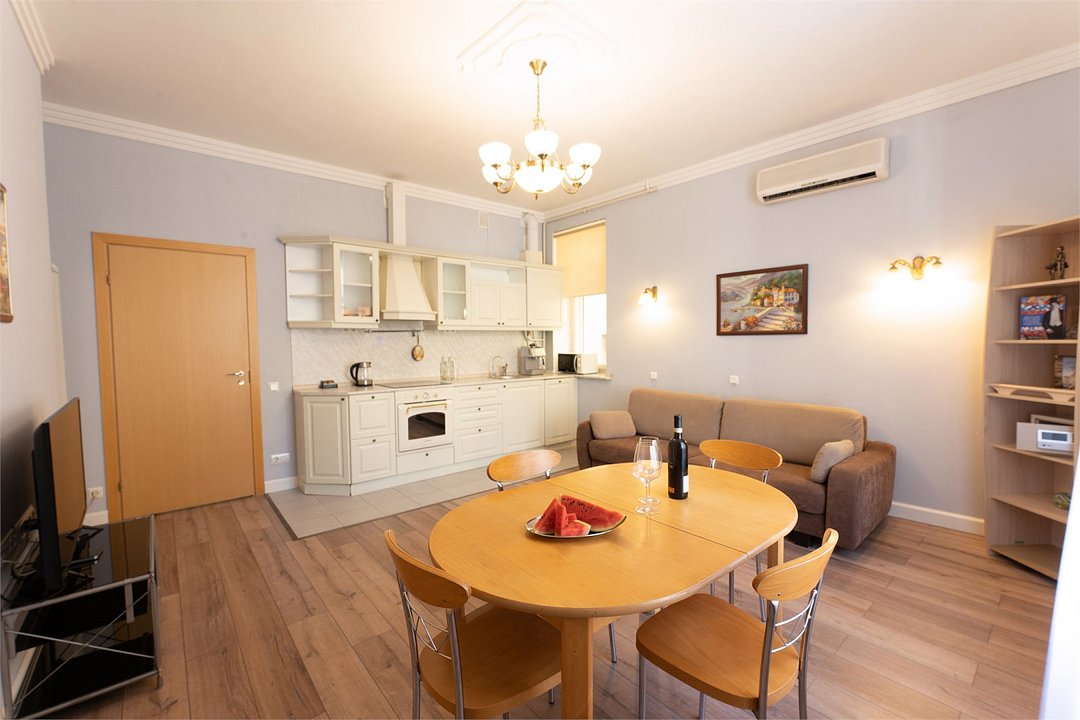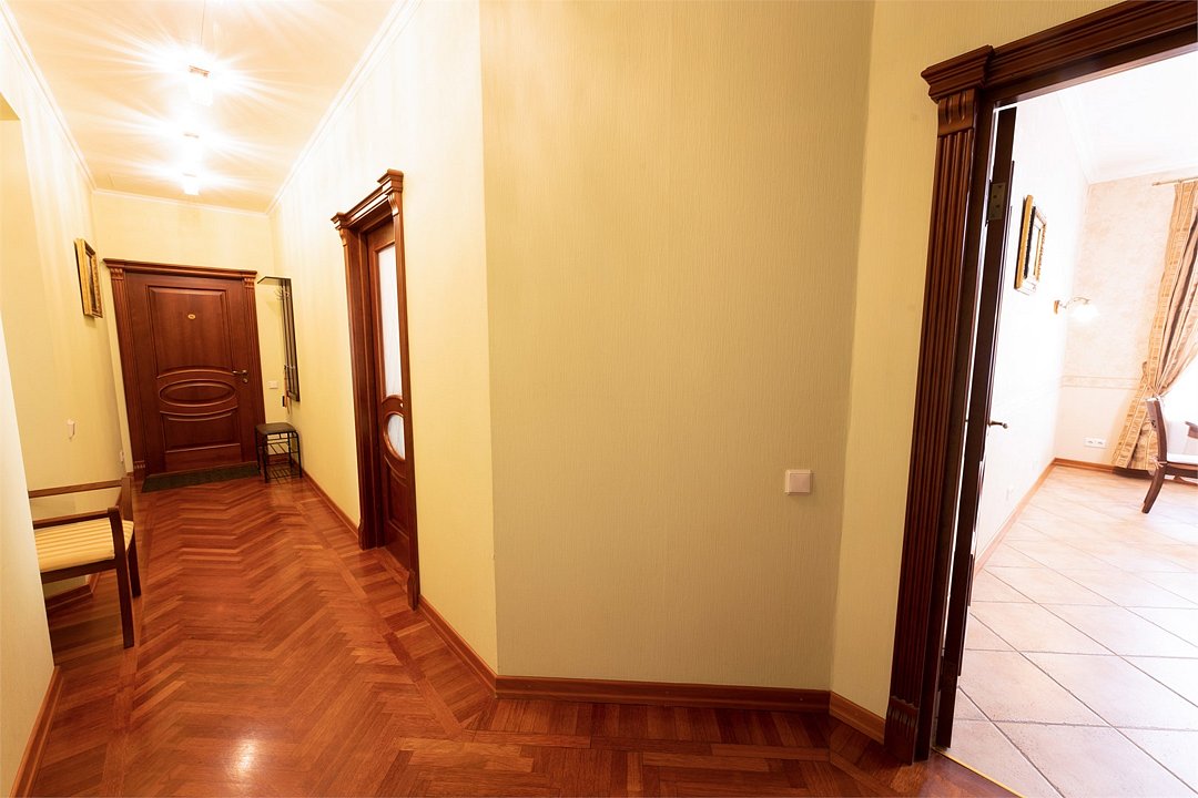 Большая площадь апартаментов располагает к спокойному и размеренному отдыху в самом центре Санкт-Петербурга. Главные достопримечательности: церковь Спас-На-Крови, набережная реки Мойки, Русский музей, Казанский собор, Эрмитаж, и Невский проспект находятся всего в нескольких минутах ходьбы. Высокие потолки, большие окна, выходящие в тихий внутренний двор, делают пространство особенно светлым и просторным. Мебель из массива ценных пород дерева, подвесные люстры и паркетный пол придают апартаментам особый стиль, создают атмосферу покоя и расслабленности. Аристократичная спальня, площадью 24 кв. метра с двуспальной кроватью оборудована плазменной панелью. Кухня-гостиная с антикварным буфетом из черного дерева и кухонным островком оборудована всей необходимой современной бытовой техникой. Дополнительные бра и светильники позволяют создать особую атмосферу за овальным обеденным столом. В Вашем распоряжении - ванная комната с ванной, и биде. Доступен бесплатный wi-fi. Наши гости могут воспользоваться услугами питания четырехзвездочного отеля, расположенного в том же комплексе.Услуги и удобства