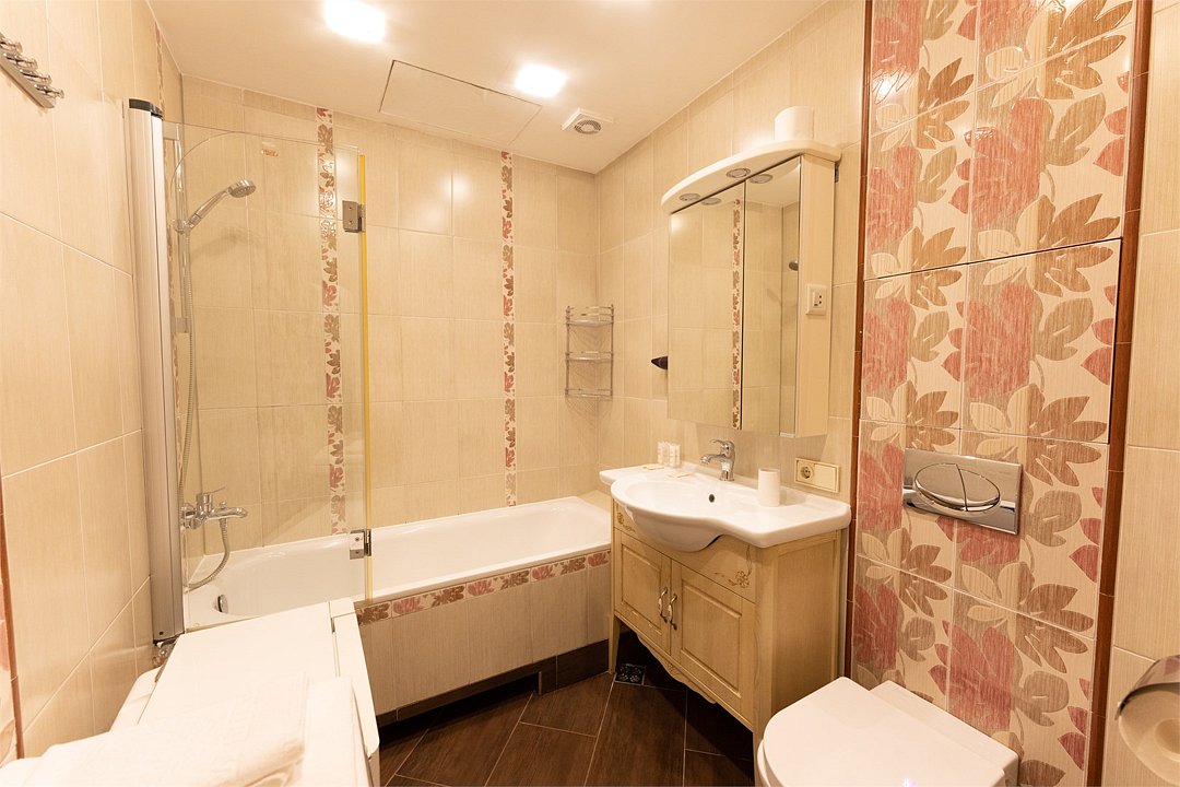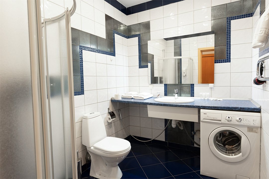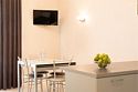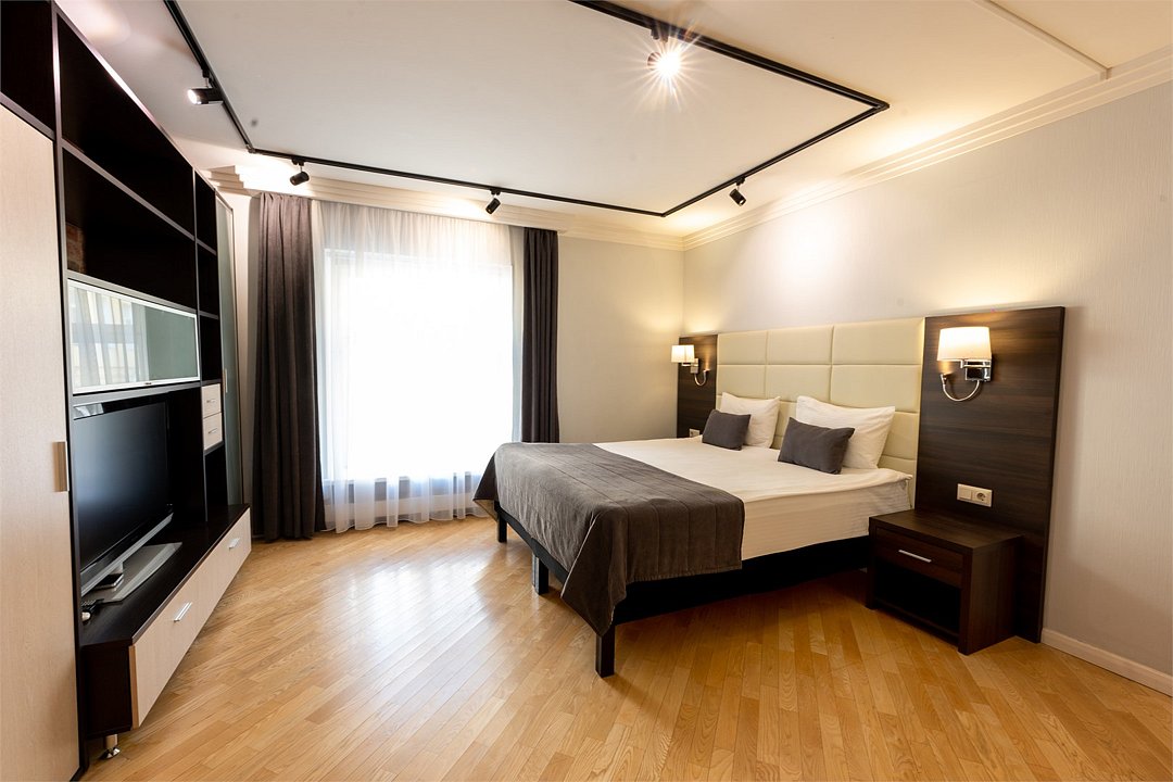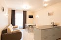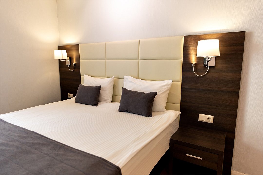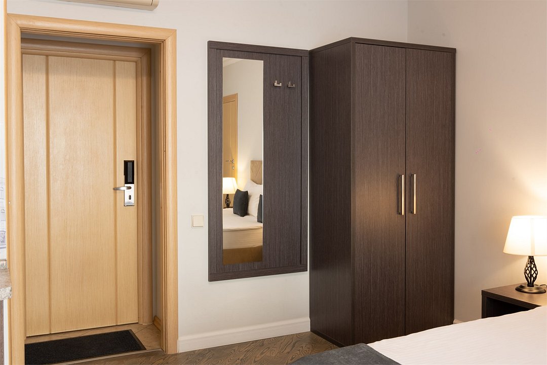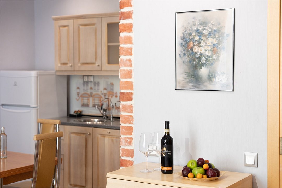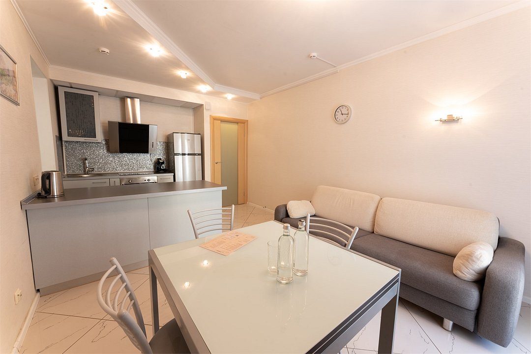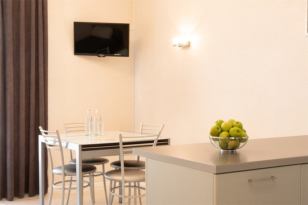 Просторные Апартаменты прекрасно подойдут как на короткий период проживания, так и для тех, кто планирует длительную поездку. Для гостей предоставляются апартаменты с двуспальной кроватью и гостиной с диваном, на котором, при необходимости, возможно размещение ребенка, а также полностью укомплектованная кухня, что позволяет не зависеть от графика работы и меню ресторанов и кафе, а приготовить то, что Вам по вкусу. Все апартаменты оборудованы кондиционером, ЖК телевизором, рабочим местом, чайным набором, на период проживания предоставляется утюг и гладильная доска. Просторная ванная комната оборудована душевой кабиной или ванной в зависимости от номера, феном, гигиеническим душем и тапочками. Наши гости могут воспользоваться услугами питания четырехзвездочного отеля, расположенного в том же комплексе.Услуги и удобства