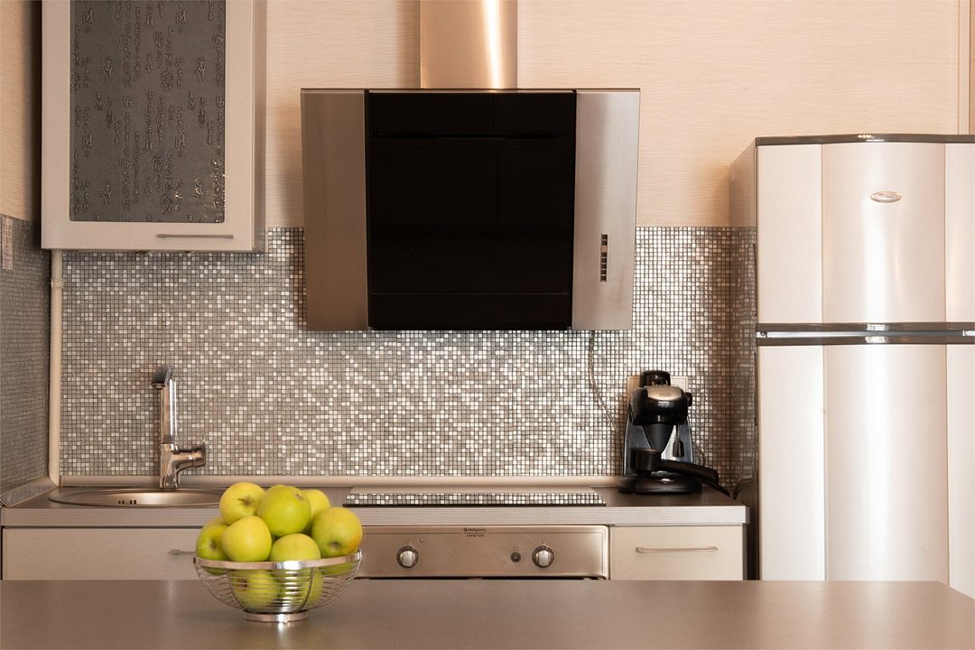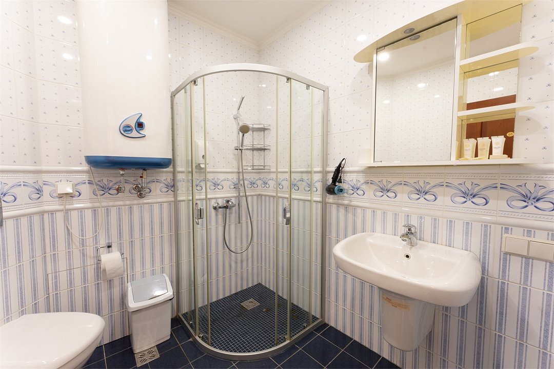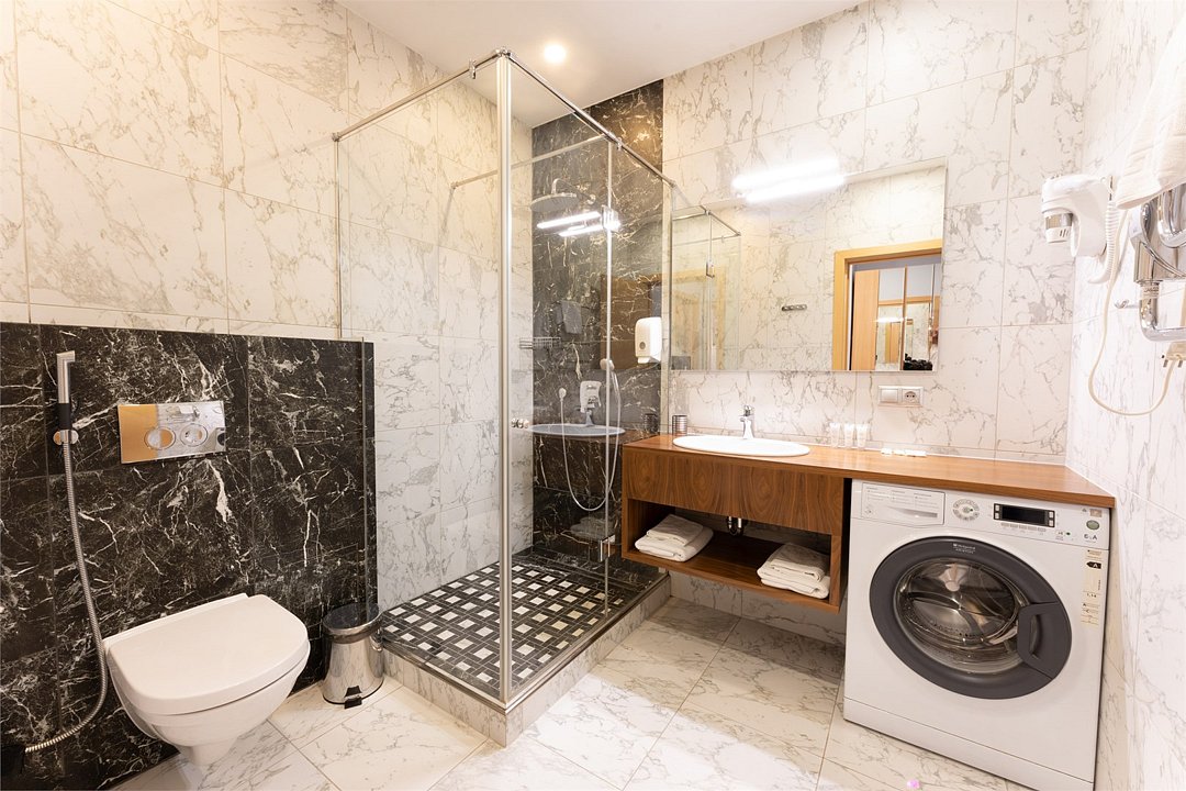 кабельное телевидение, Wi-Fi, телефон, холодильник, кондиционер, светильник, фен, электронные замки, микроволновая печь, утюг, душевая кабина, санузел, водонагреватель, теплый пол, банные полотенца, тапочки, косметические средства, двуспальная кровать, гладильная доска, тумбы, стулья, шкаф для одежды, багажная тумба, чайный набор, набор посуды, сейф, посудомоечная машина, чайник, унитаз, раковина, отопление, душ, вид во двор, стаканы, столовые приборы, стол, туалет, внутренний телефон, телевизор с плоским экраном, мини-кухняВ апартаментах