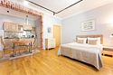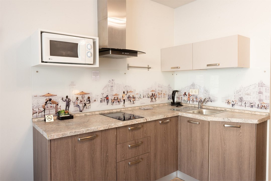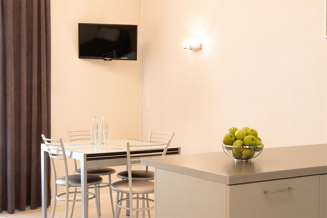 Независимо от цели Вашей поездки, сочетающие в себе практичность и комфорт наших Студий как нельзя лучше подходят для длительного проживания. В каждом из апартаментов имеется современная кухня обрадованная всем необходимым, кондиционер, ЖК телевизор, рабочее место, чайный набор. На период проживания предоставляется утюг и гладильная доска. Просторная ванная комната оборудована душевой кабиной, феном. Гостям доступен бесплатный wi-fi. Наши гости могут воспользоваться услугами питания четырехзвездочного отеля, расположенного в том же комплексе.Услуги и удобства