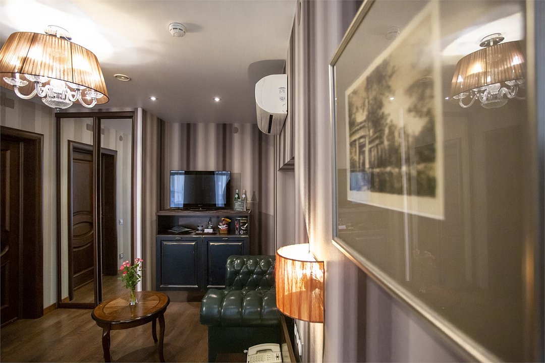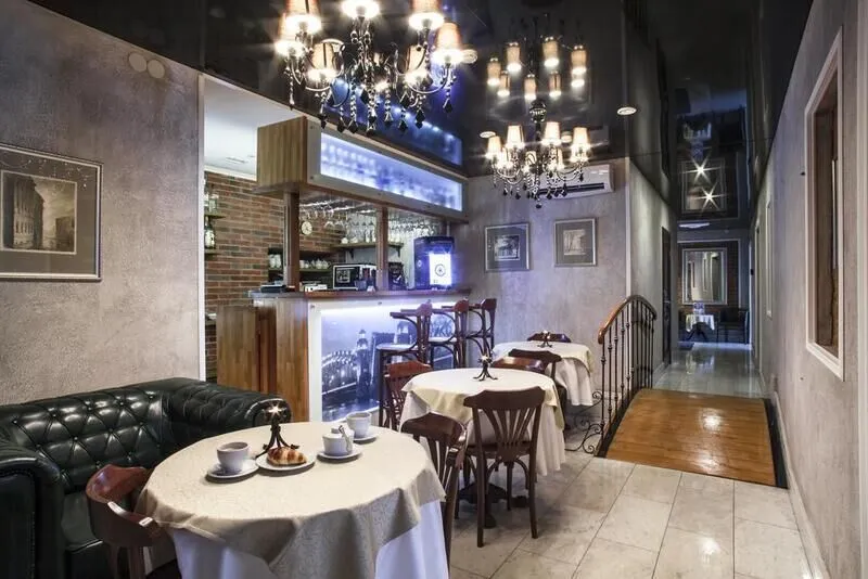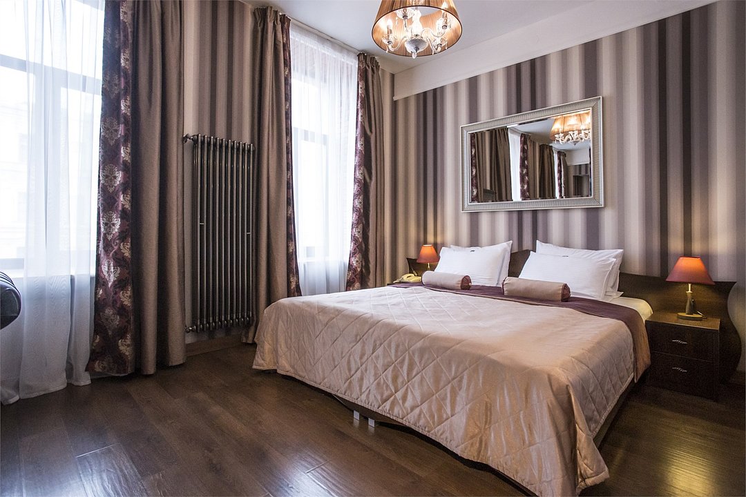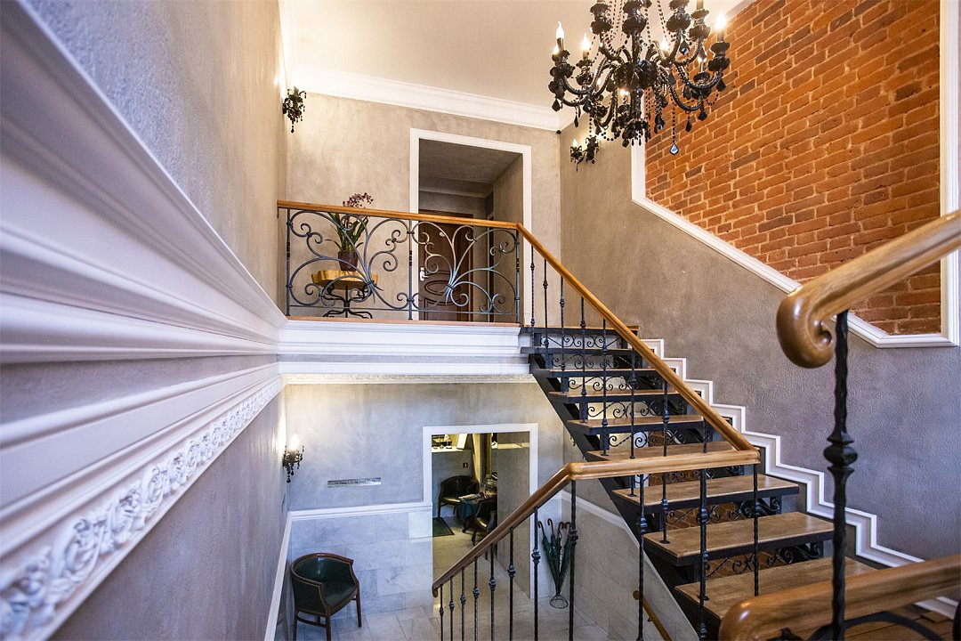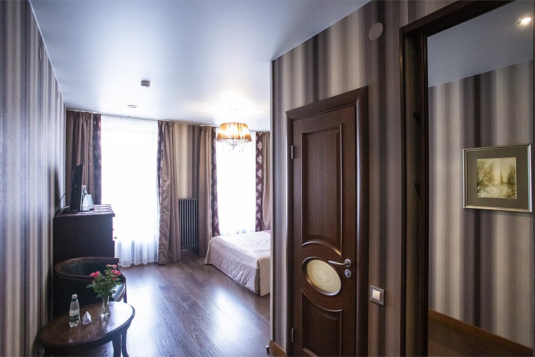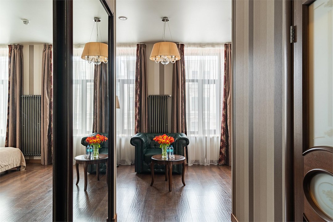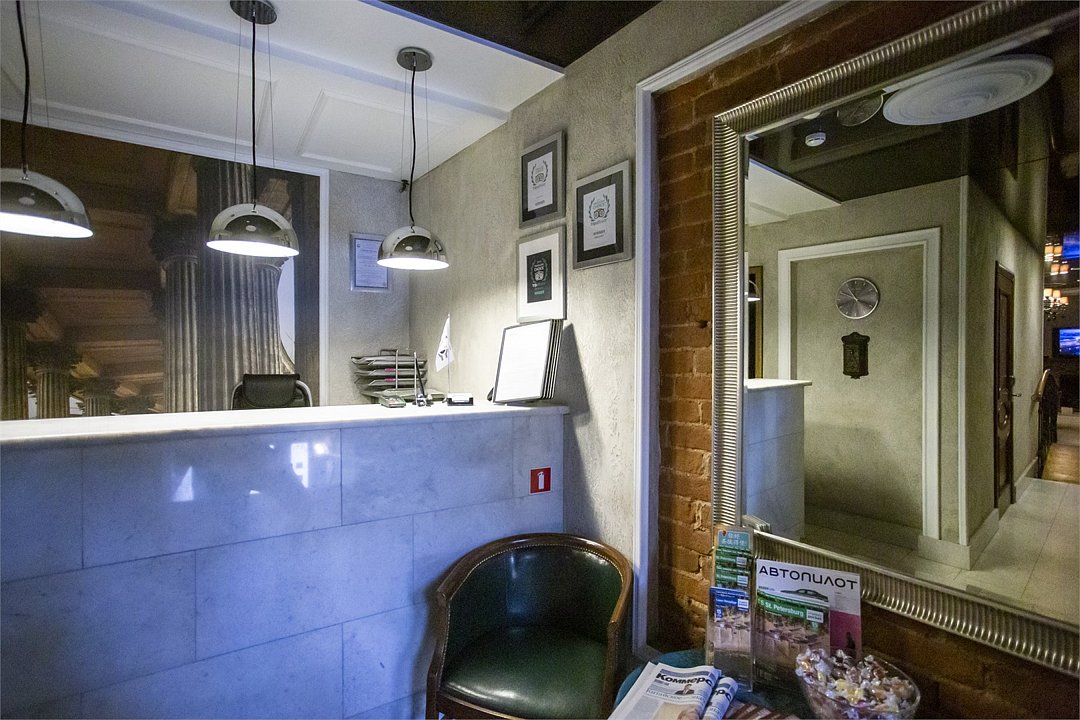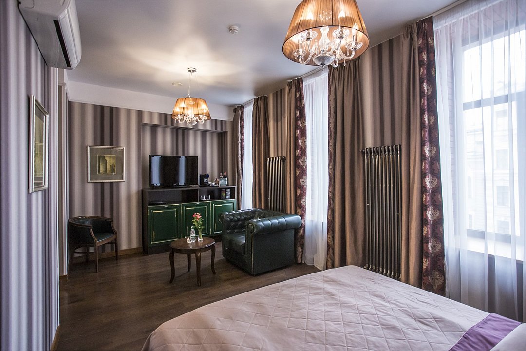 Интерьер отеля, разработанный ведущими дизайнерами, выдержан в классическом стиле: изящные лестницы с элементами авторской ковки, натуральное дерево и мрамор. Стены жемчужно-серых тонов украшены картинами известного петербургского художника-графика В.Г. Борисковича.