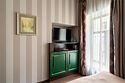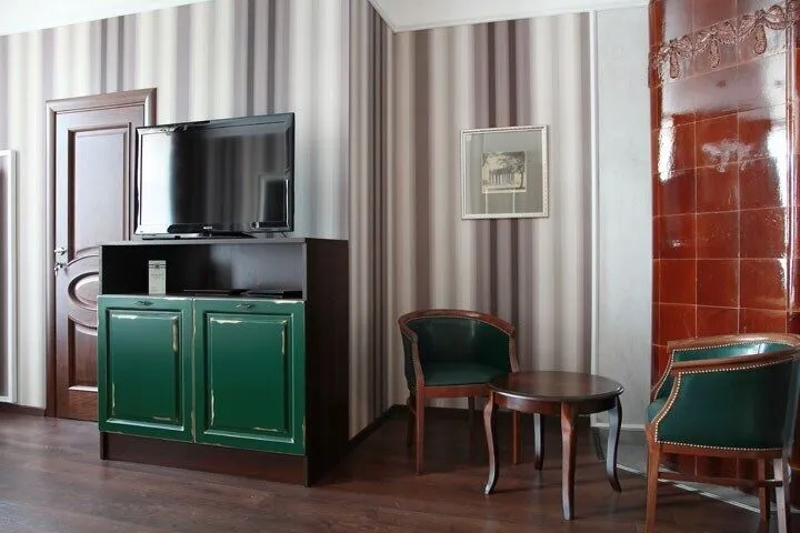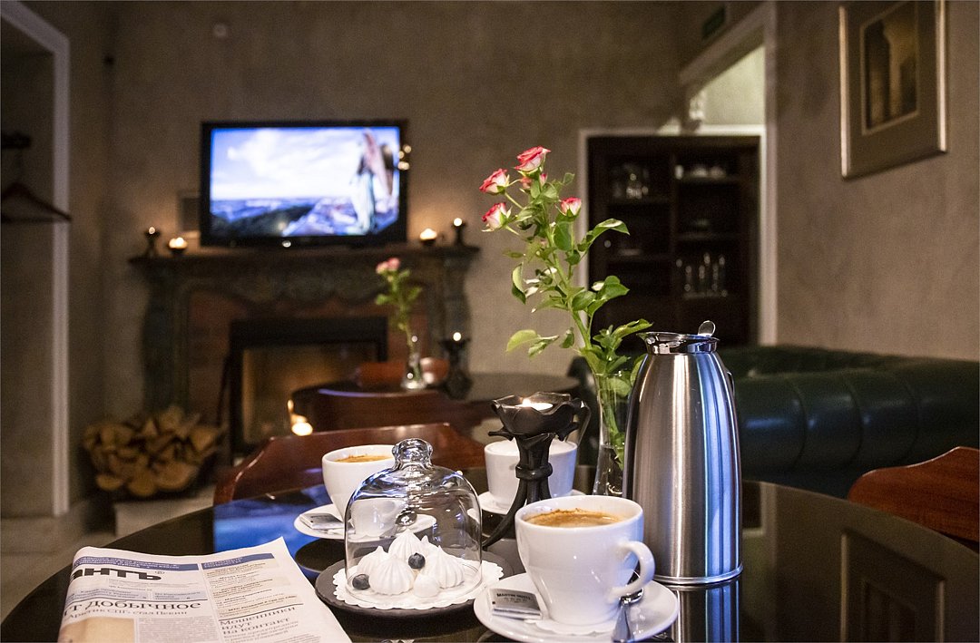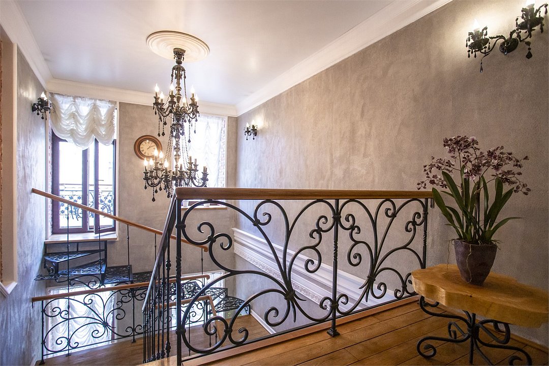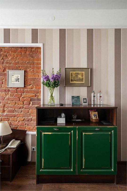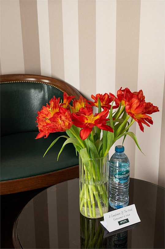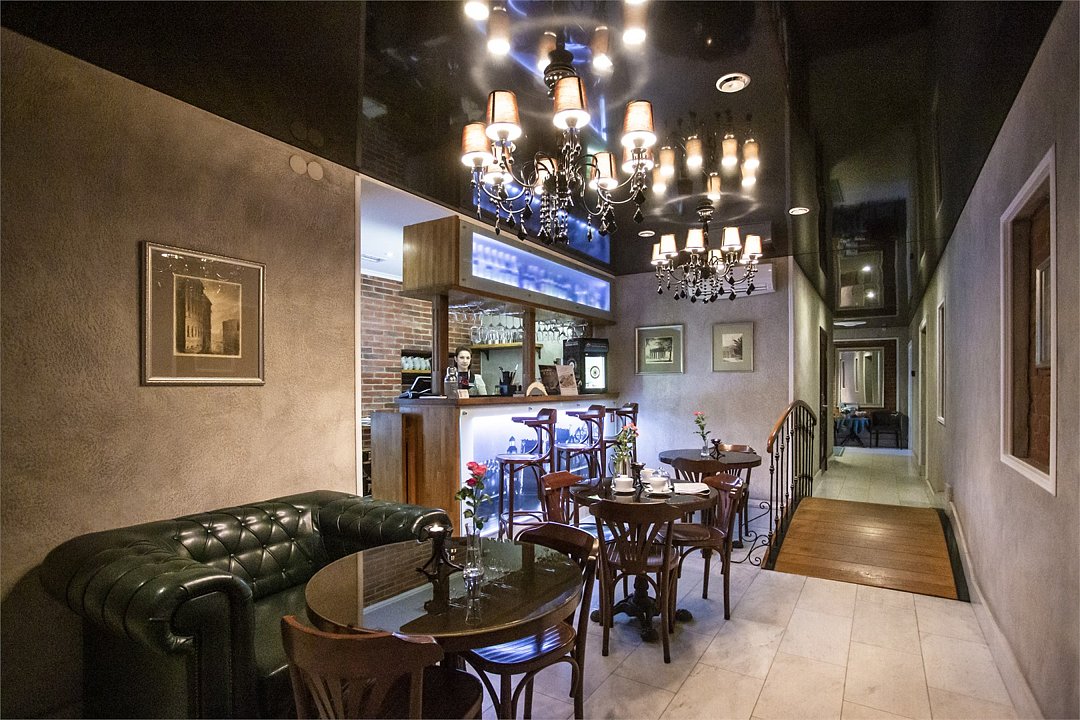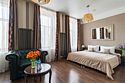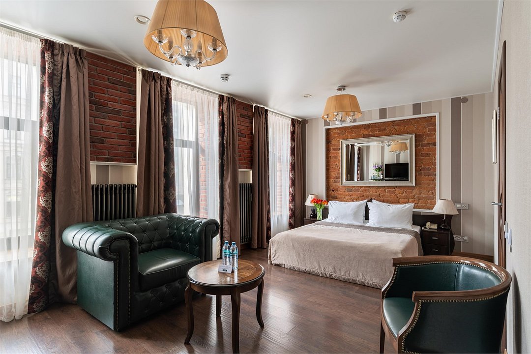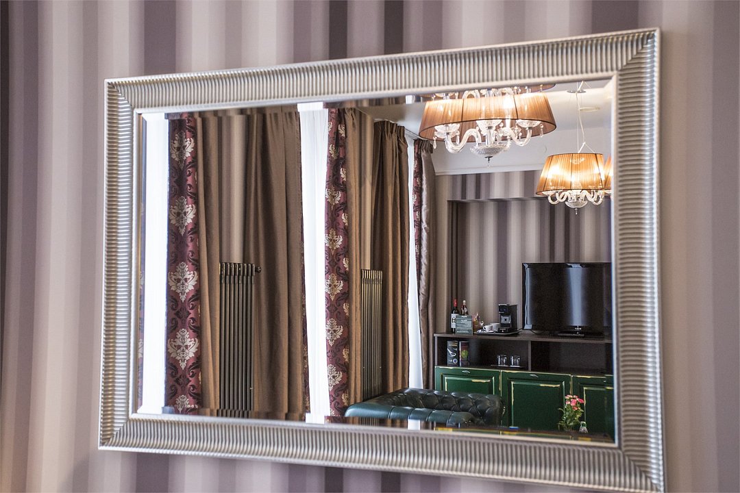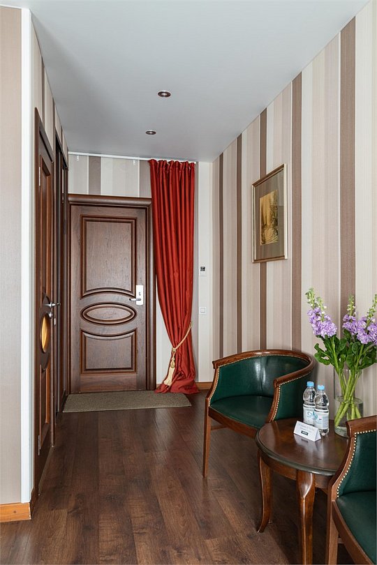 Интерьер отеля, разработанный ведущими дизайнерами, выдержан в классическом стиле: изящные лестницы с элементами авторской ковки, натуральное дерево и мрамор. Стены жемчужно-серых тонов украшены картинами известного петербургского художника-графика В.Г. Борисковича.