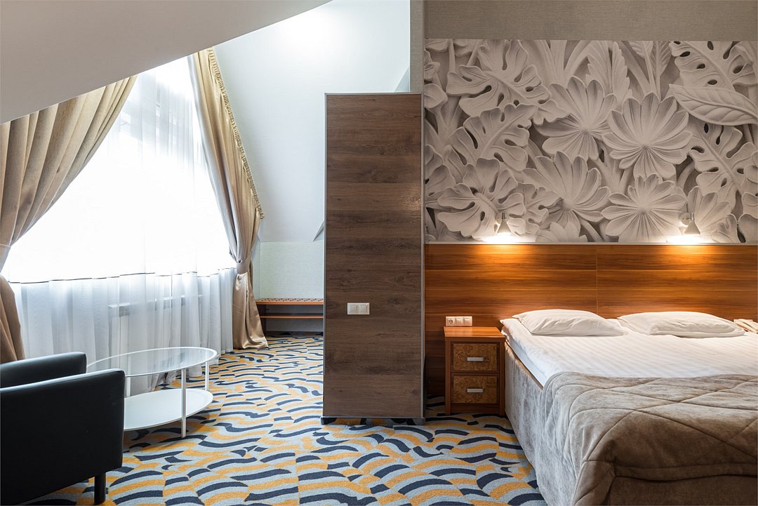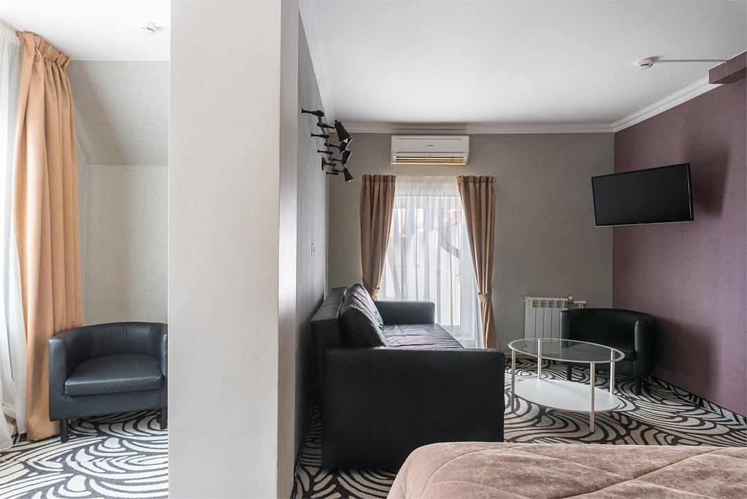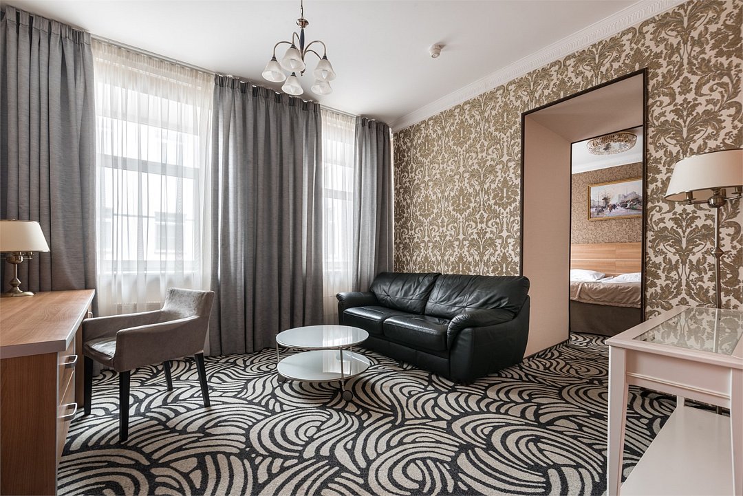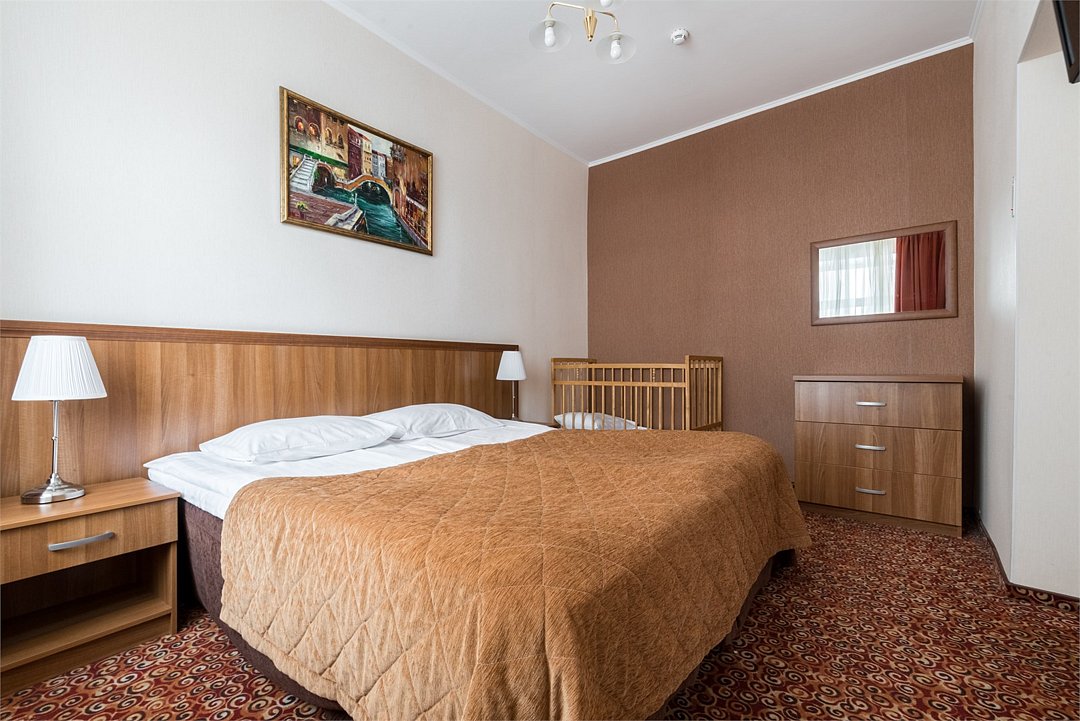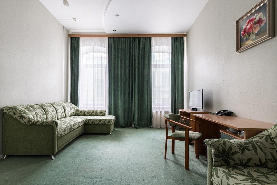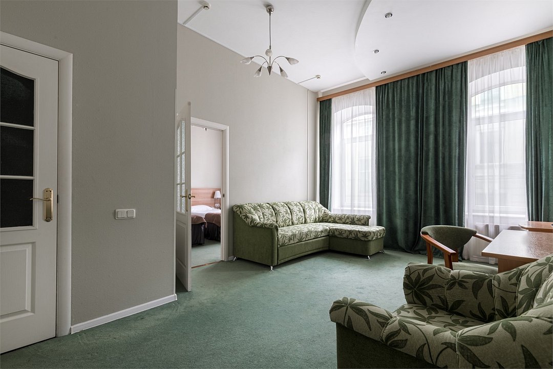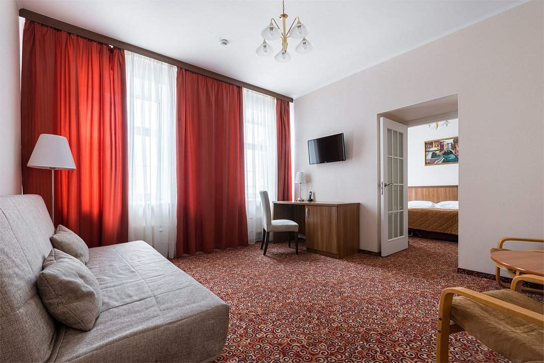 Просторный и светлый двухкомнатный номер с кондиционером в улучшенном оформлении, состоящий из прихожей, спальни и гостиной. Общая площадь номера - 40 кв. м. На выбор возможна как большая двухспальная, так и две односпальные кровати. Гостиная укомплектована большим раскладывающимся диваном. Номера этой категории располагаются на 2 и 4 этажах. Возможна установка детской кроватки.Услуги и удобства