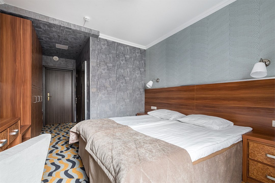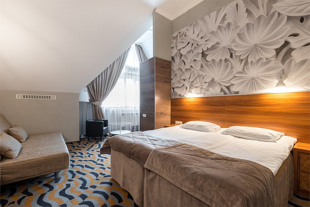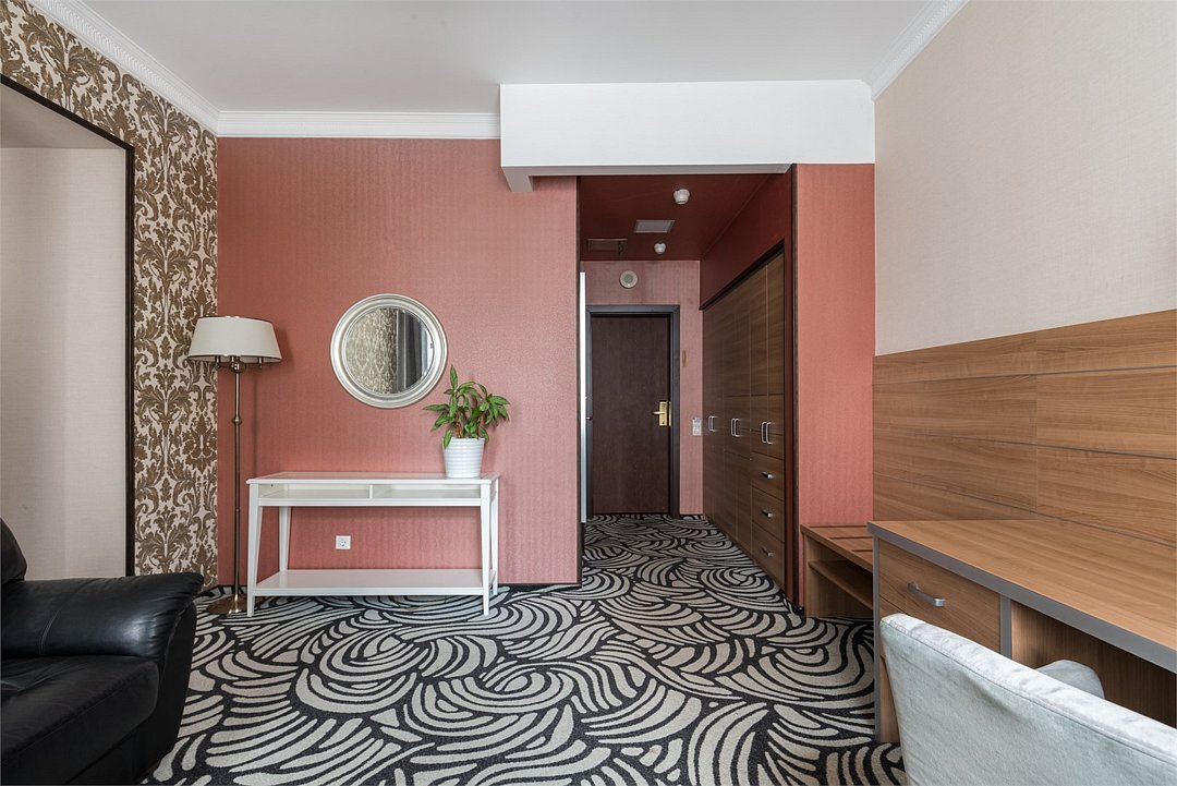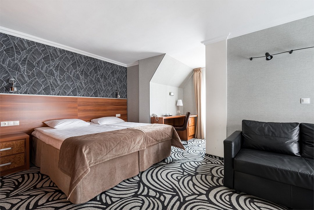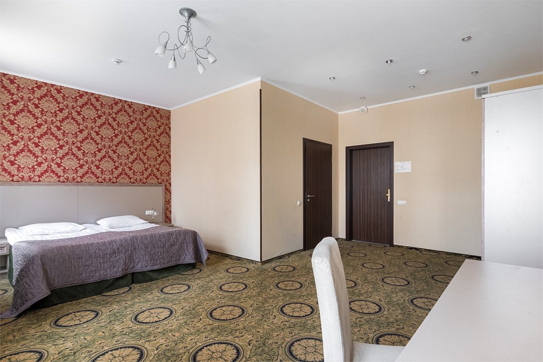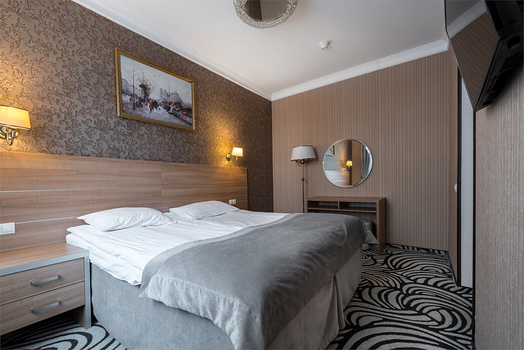 Просторный и светлый двухкомнатный номер с кондиционером в улучшенном оформлении, состоящий из прихожей, спальни и гостиной. Общая площадь номера - 40 кв. м. На выбор возможна как большая двухспальная, так и две односпальные кровати. Гостиная укомплектована большим раскладывающимся диваном. Номера этой категории располагаются на 2 и 4 этажах. Возможна установка детской кроватки.Услуги и удобства