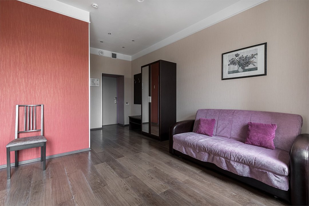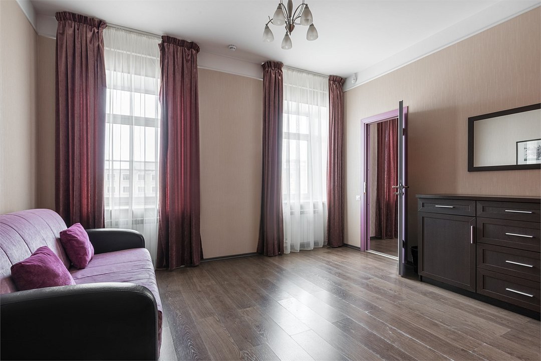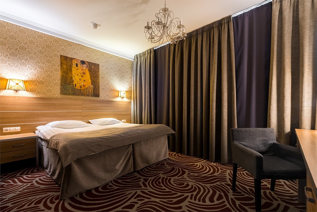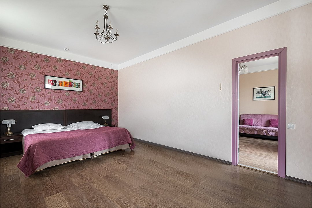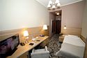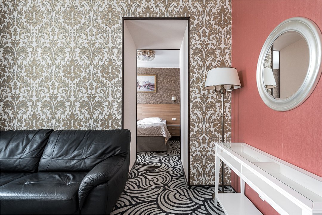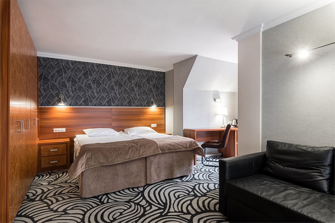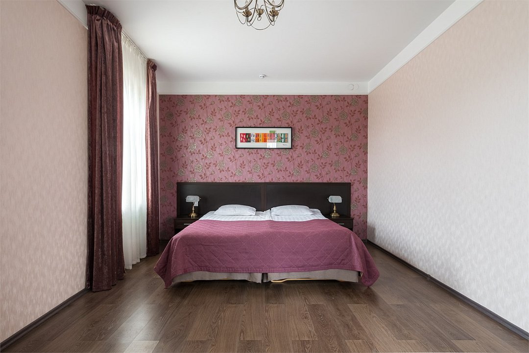Просторный и светлый двухкомнатный номер с кондиционером в улучшенном оформлении, состоящий из прихожей, спальни и гостиной. Общая площадь номера - 40 кв. м. На выбор возможна как большая двухспальная, так и две односпальные кровати. Гостиная укомплектована большим раскладывающимся диваном. Номера этой категории располагаются на 2 и 4 этажах. Возможна установка детской кроватки.Услуги и удобства