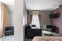 Оригинальный дизайнерский номер с увеличенной площадью и необычными интерьерными решениями. Общая площадь номера - 30 кв. м. Номер разделен на зоны: спальная, гостевая и рабочая. Номеров этой категории всего два и оба располагаются на 2 этаже. Каждый номер укомплектован кондиционером.Услуги и удобства