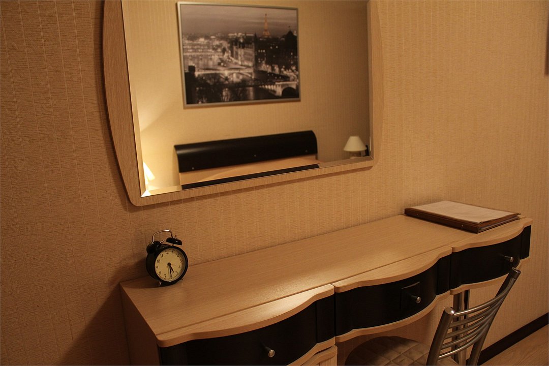 Wi-Fi, интернет, светильник, фен, вентилятор, утюг, обогреватель, ванная комната, ванна, водонагреватель, банные полотенца, гигиенические средства, кровать «King size», гладильная доска, тумбы, шкаф для одежды, вешалки, зеркало, набор посуды, чайник, унитаз, раковина, питьевая вода, ковровое покрытие, отопление, кулер на этаже, вид во двор, высокие потолки, стаканы, столовые приборы, стул, стол, туалетные средства, туалет, цифровое тв, телевизор с плоским экраном, москитная сетка, номер для некурящих, чайная станция, вешалки-плечики, без питомцевВ номере