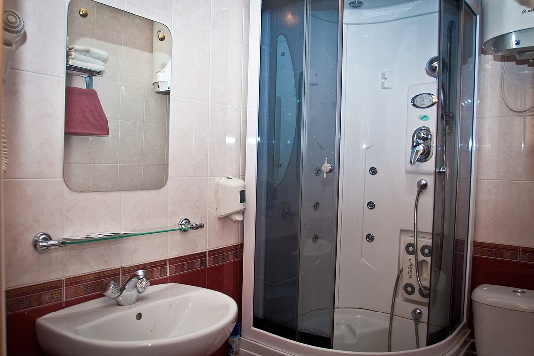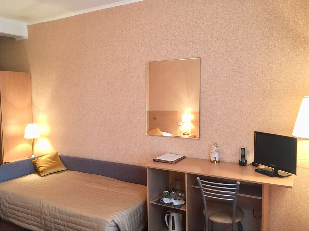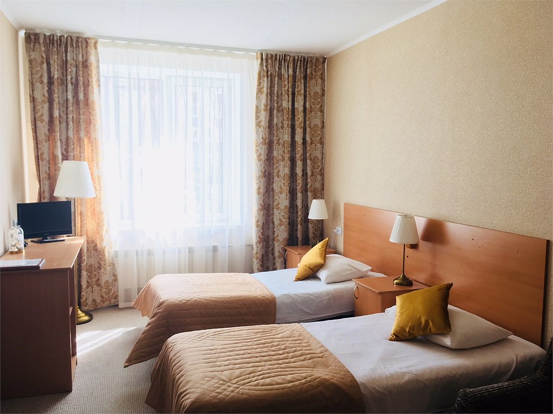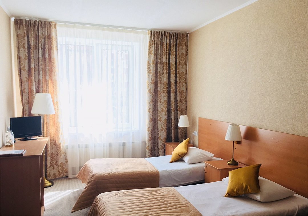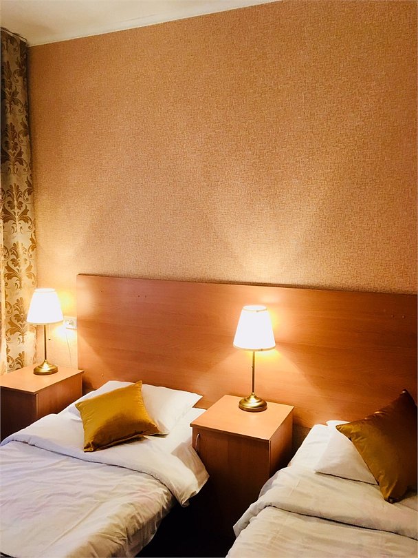 Просторная отдельная комната 15-20 кв.м. Две односпальные кровати, ж/к телевизор, занавески blackout, чайник, чашки, стаканы для воды. В номере своя отдельная ванная комната и туалет.Услуги и удобства