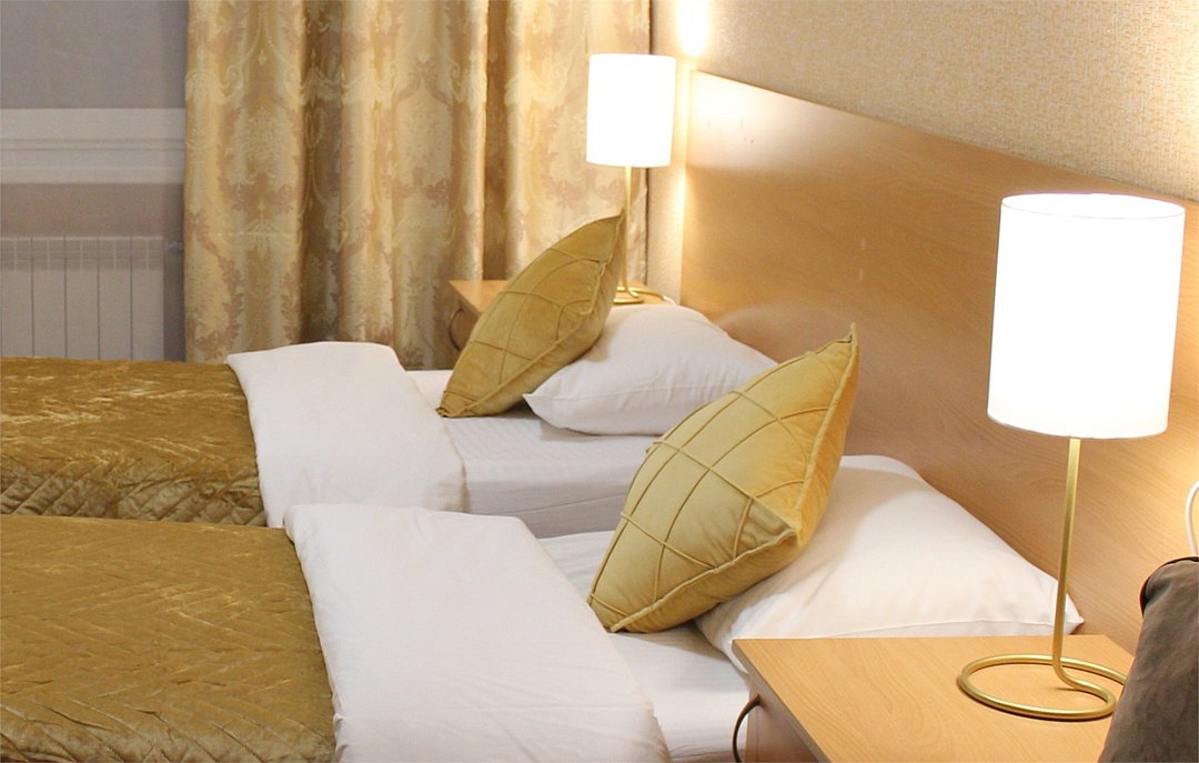 Просторная комната18 кв.м. Три удобные широкие кровати, ж/к телевизор, чайник, чашки, занавески blackout. В номере своя отдельная ванная комната и туалет.Услуги и удобства