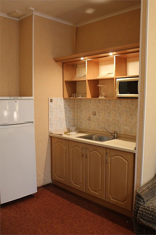 Прекрасный, очень просторный номер с широкой двуспальной кроватью размера "King-size", бесплатный интернет Wi-Fi, Ж/К телевизор, диван, кухня, микроволновая печь, холодильник, чайник, посуда, столовые приборы. В номере своя отдельная ванная комната и туалет.Услуги и удобства