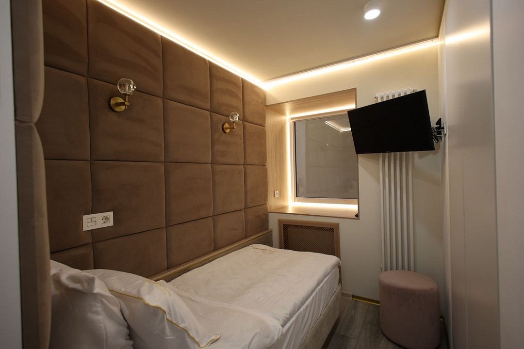 Современный однокомнатный номер с оригинальной дизайнерской отделкой в темных тонах, подойдет для двухместного размещения. Здесь будет комфортно как семейной паре ,так и гостям посетившим город по рабочим делам. Площадь номеров этой категории до 12 кв.м.Удобные кровати с ортопедическими матрацами позволят Вам, комфортно выспаться. А как говорится ,хороший сон – залог успеха.В каждом номере система винтиляции и отопления. Также к Вашим услугам спутниковое ТВ, бесплатный интернет, фен, тапочки, набор полотенец,и все необходимое. Дополнительно в комплектацию входит "набор гостеприимства" для приготовления чая (черного/зеленого) и кофе,бутилированная вода.Услуги и удобства