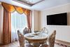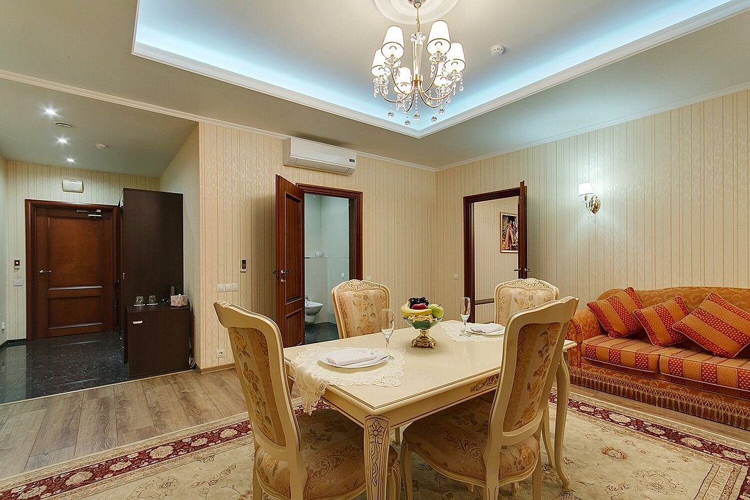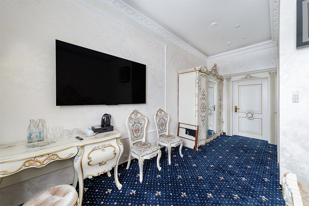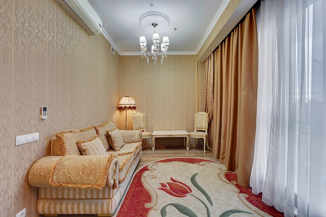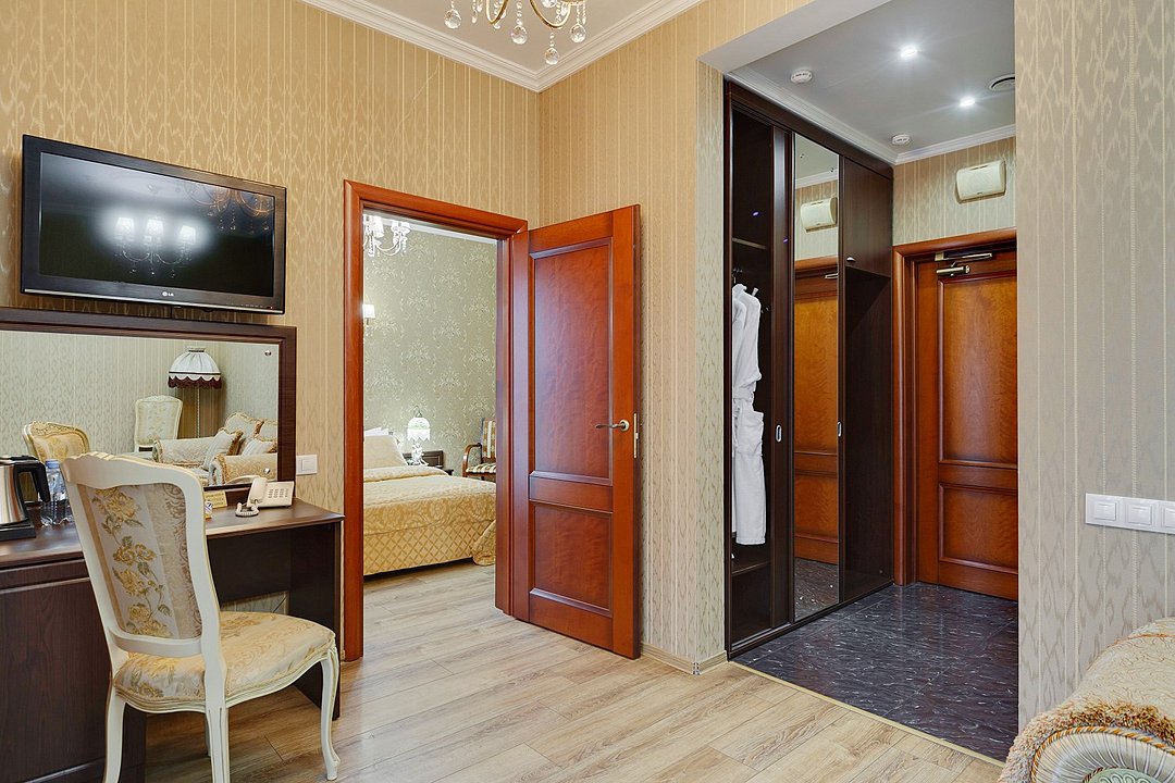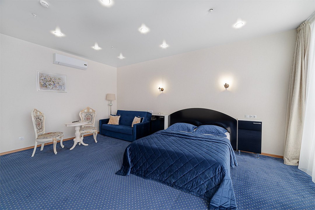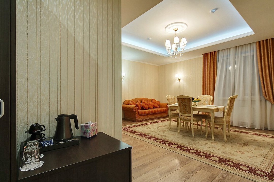 Wi-Fi, холодильник, кондиционер, система безопасности, микроволновая печь, утюг, биде, халаты, банные полотенца, двуспальная кровать, диван, шкаф для одежды, журнальный столик, письменный стол, обеденный стол, багажная тумба, две комнаты, сейф, душ, вид во двор, внутренний телефон, телевизор со Smart TV, номер для некурящих, чайная станция, туалетные принадлежности премиум-класса, бутилированная вода, без питомцевВ гостиничном номере