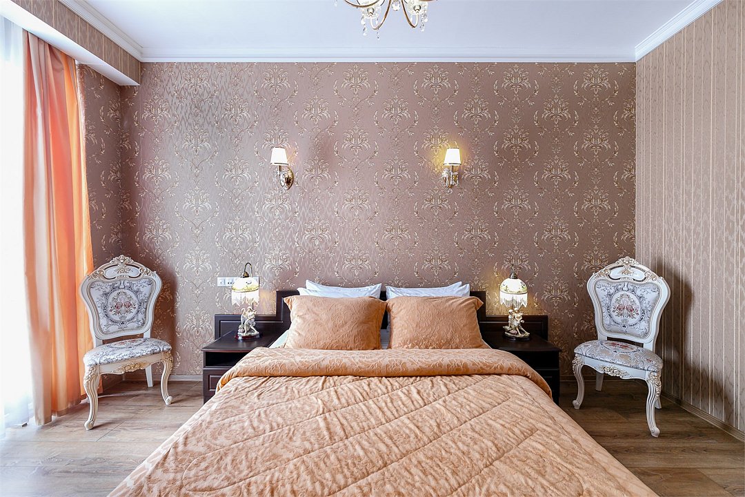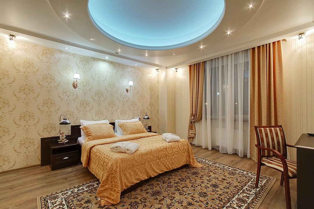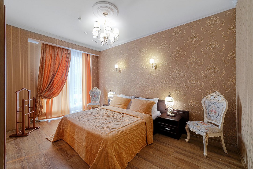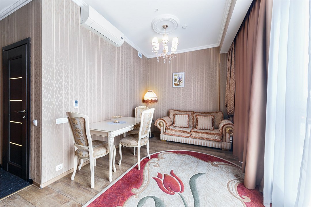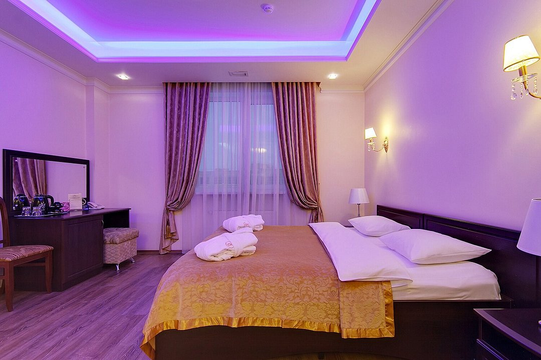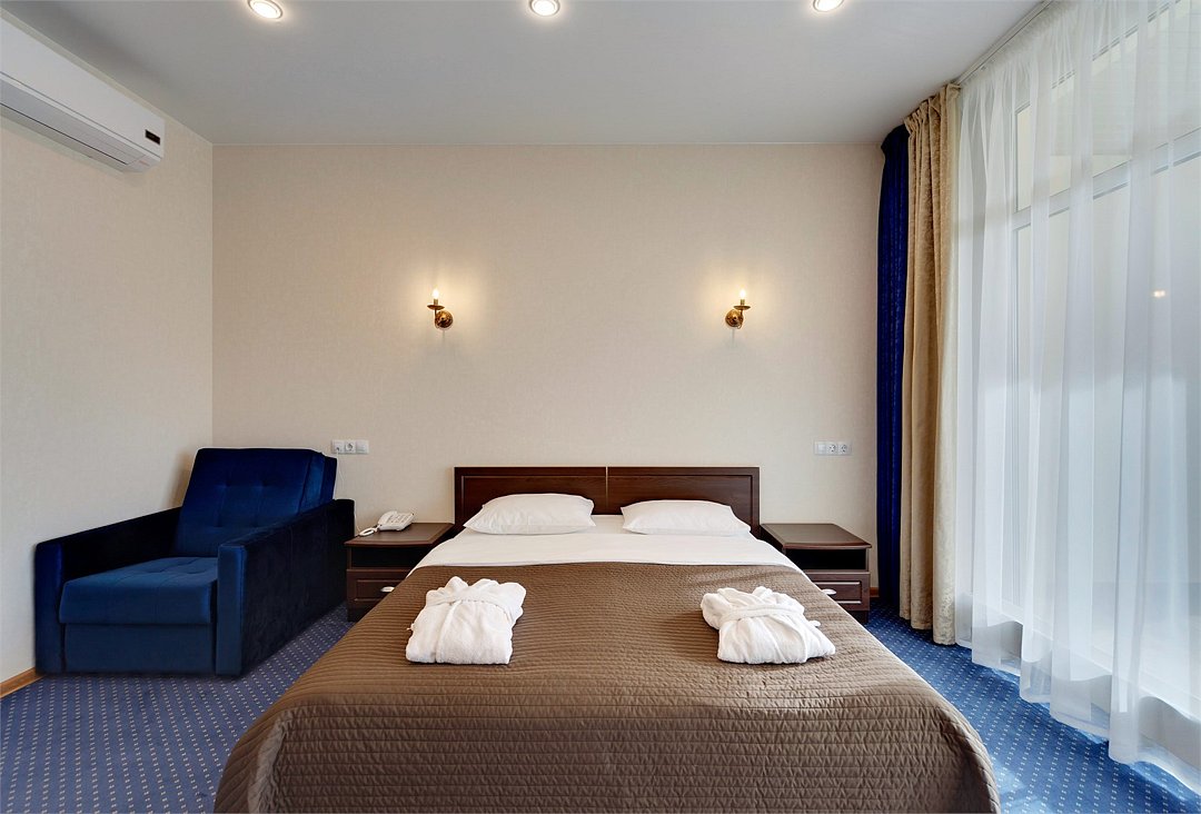 Номер "ДЕЛЮКС" необыкновенно уютный: панорамные окна в гостиной и спальне. В спальне большая двуспальная кровать, телевизор, кондиционер. В гостиной: обеденный стол со стульями, диван, телевизор, кондиционер.Услуги и удобства